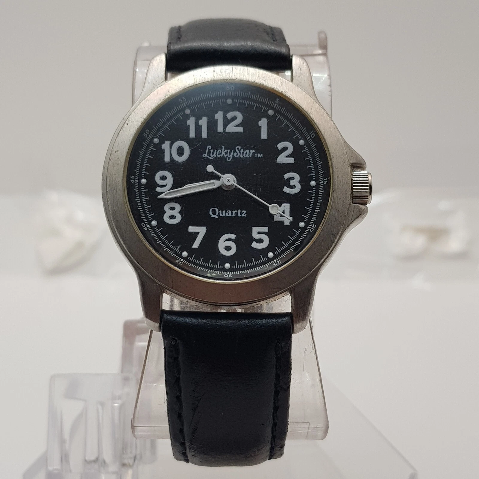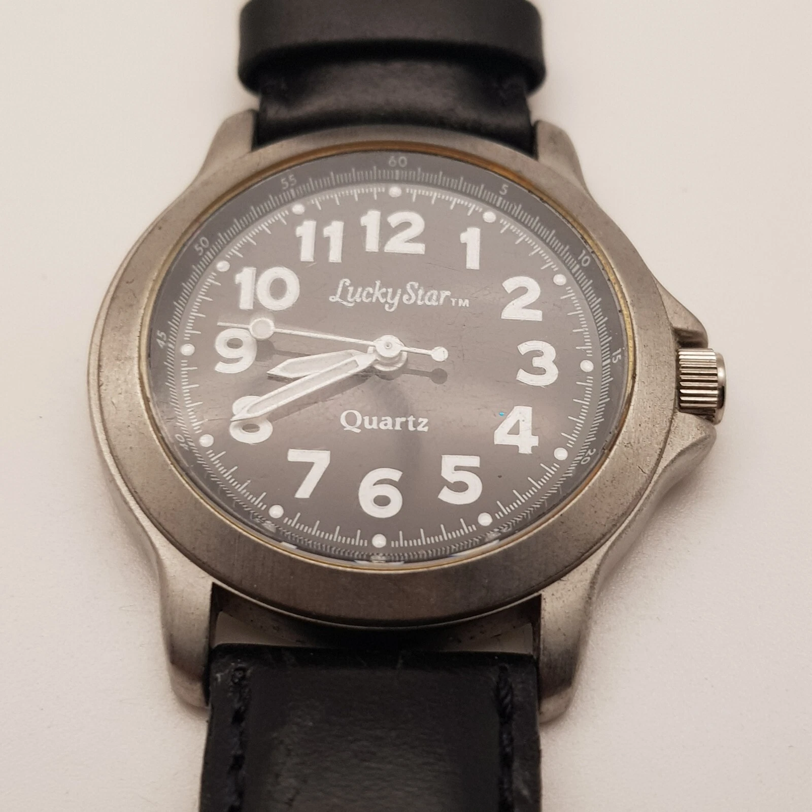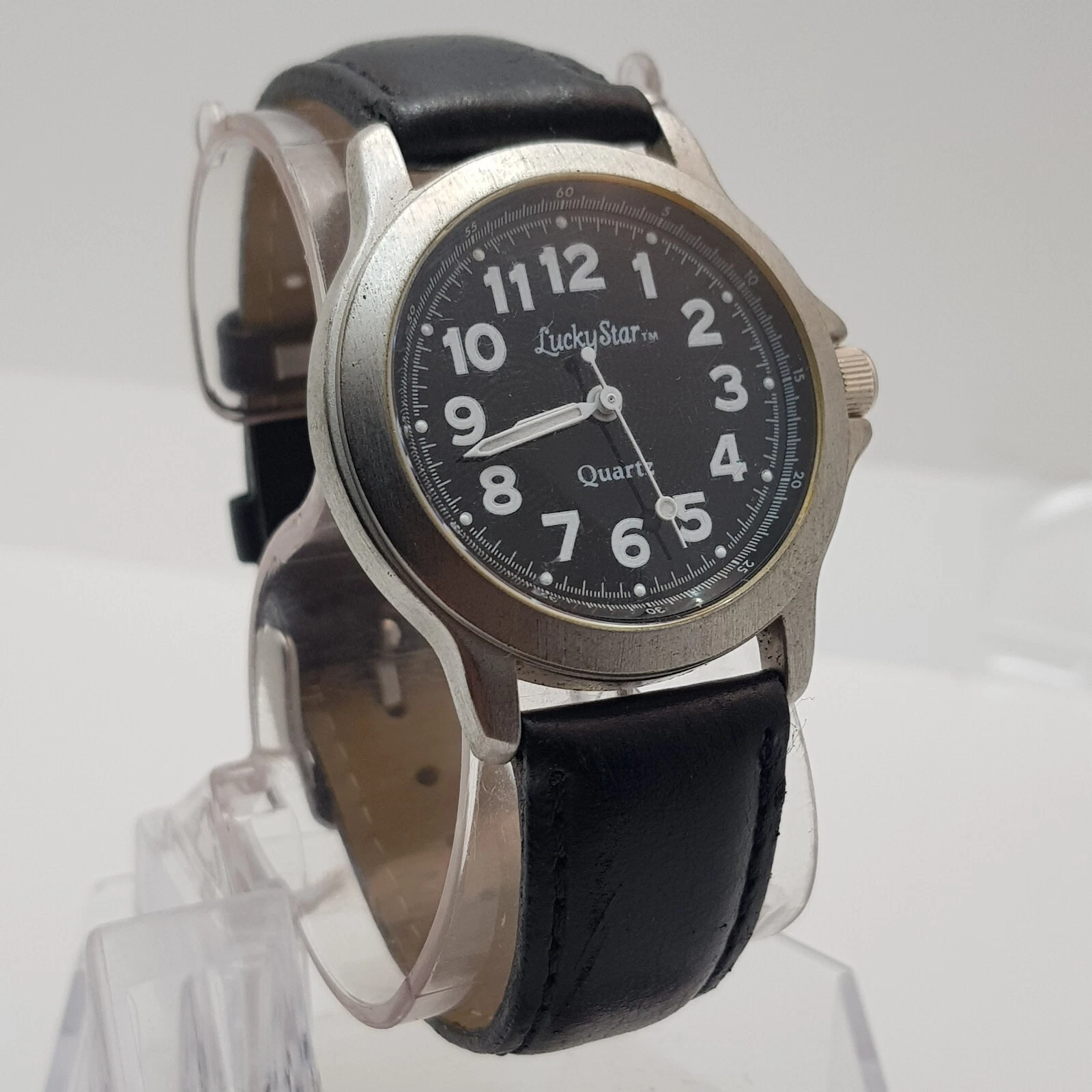 Lucky Star Analog Quartz Watch Black Dial Black Leather Band...NEW BATTERY