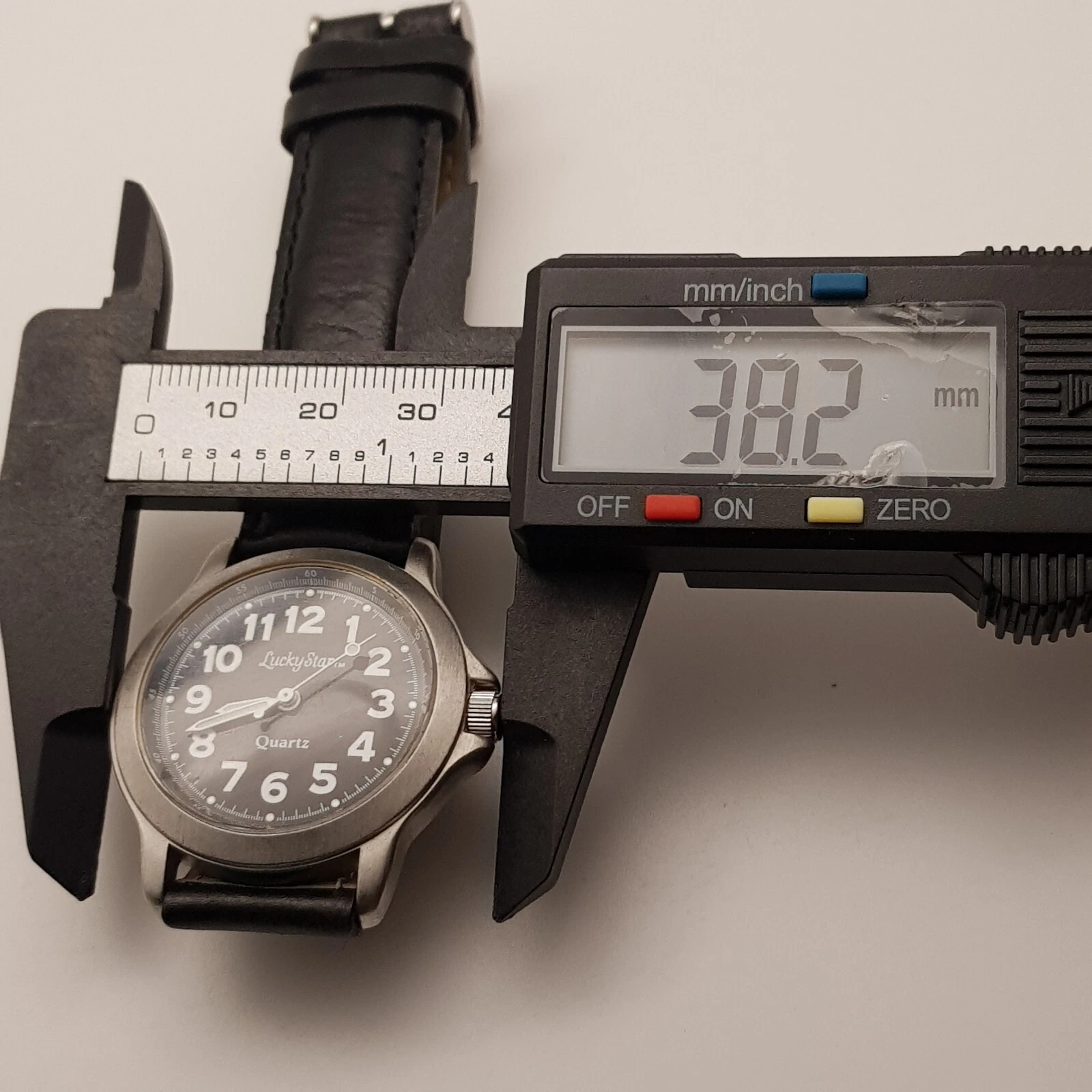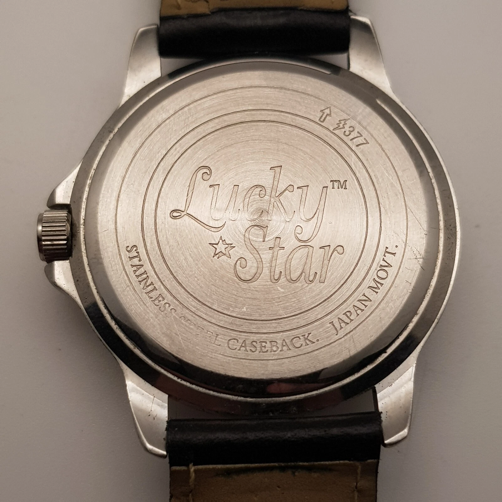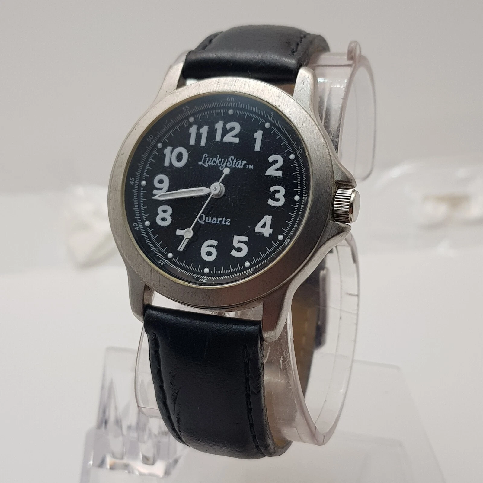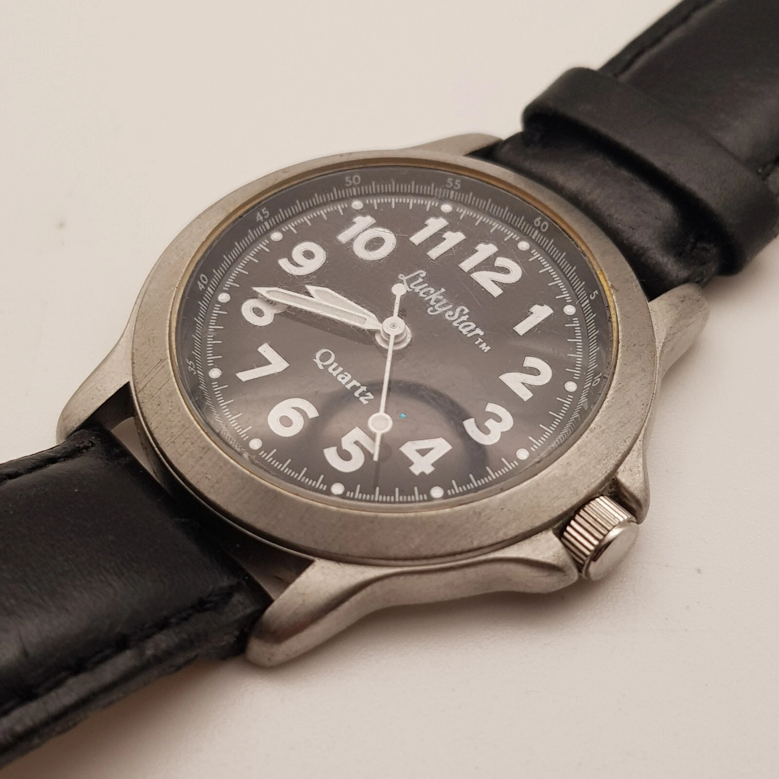 Lucky Star Analog Quartz Watch Black Dial Black Leather Band...NEW BATTERY