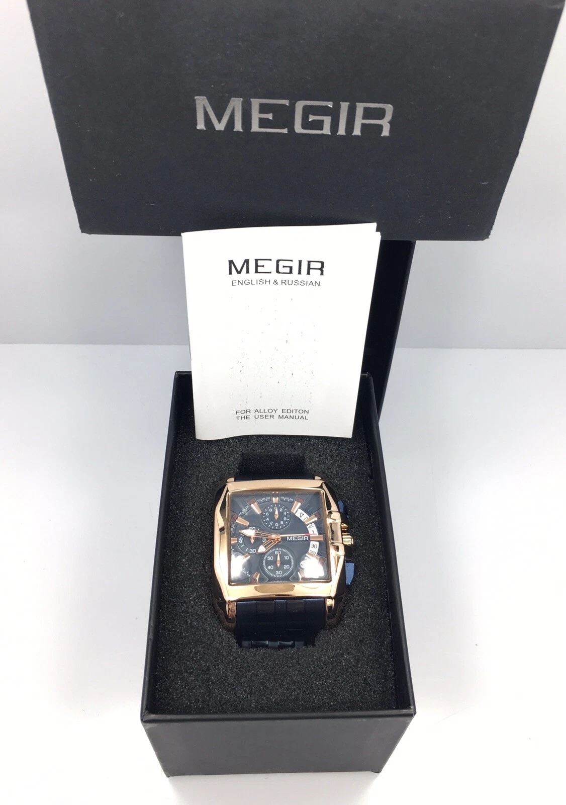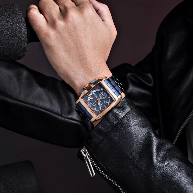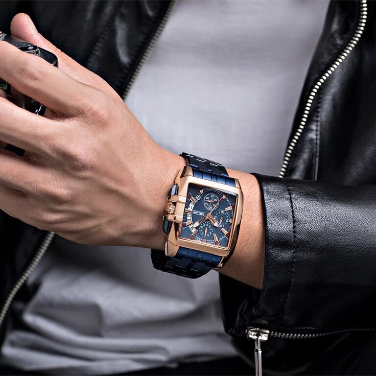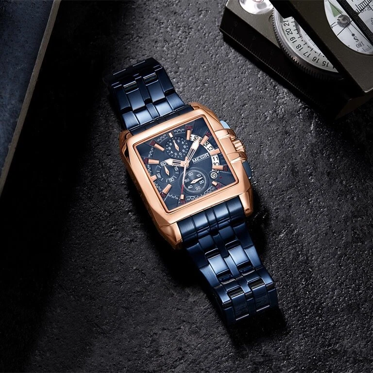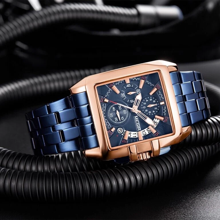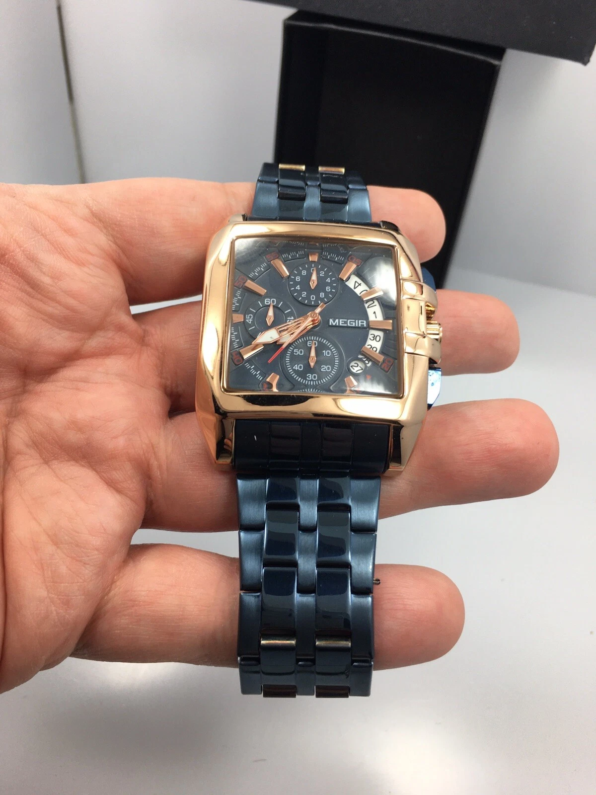 NEW Mens Mega Huge Big Face Rose Gold GP Blue Steel Hip Hop Watch Megir with Box