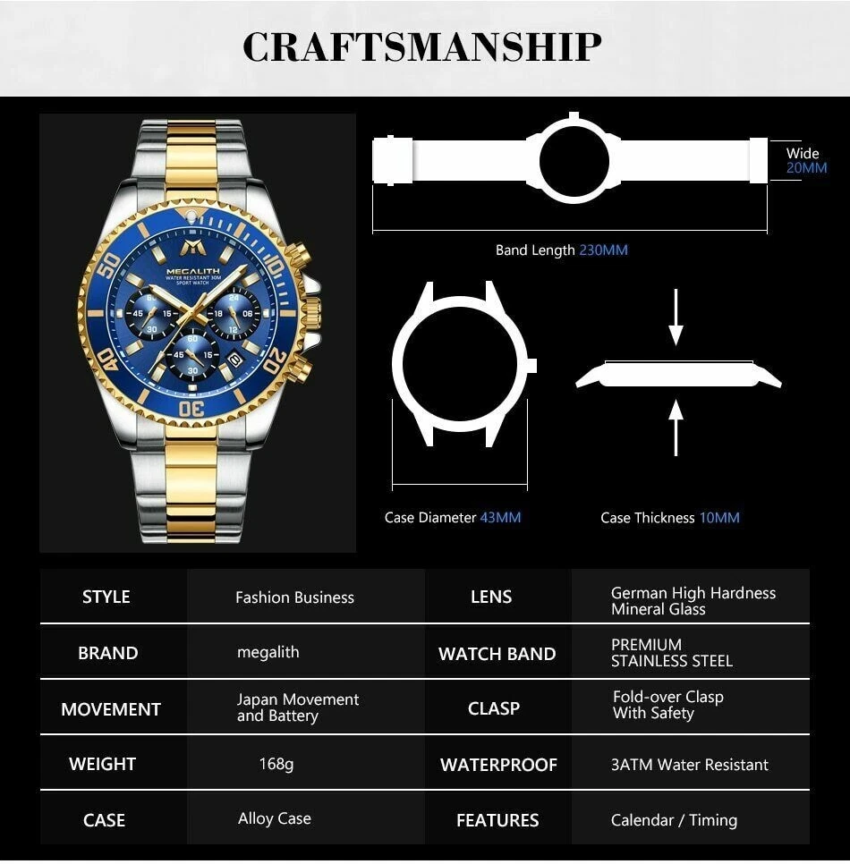 MEGALITH Luxury Mens Watch Designer Chronograph Calendar Sports Quartz Watches