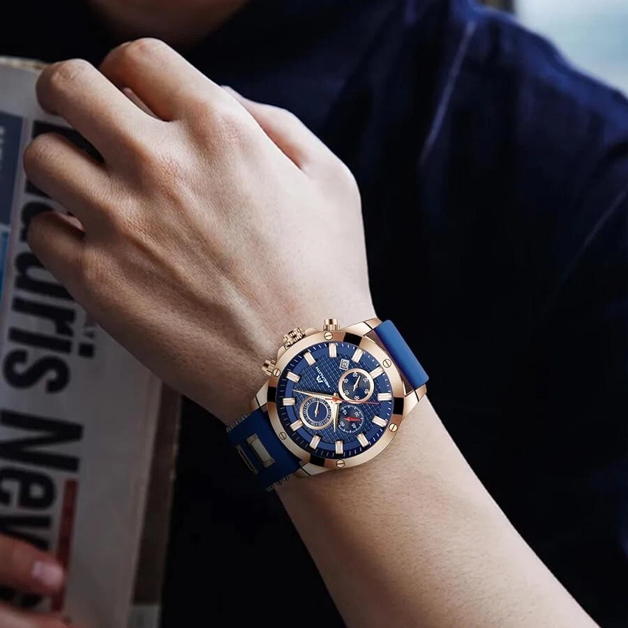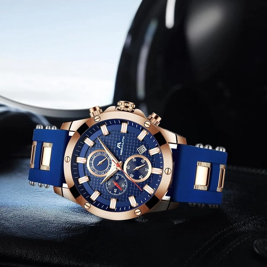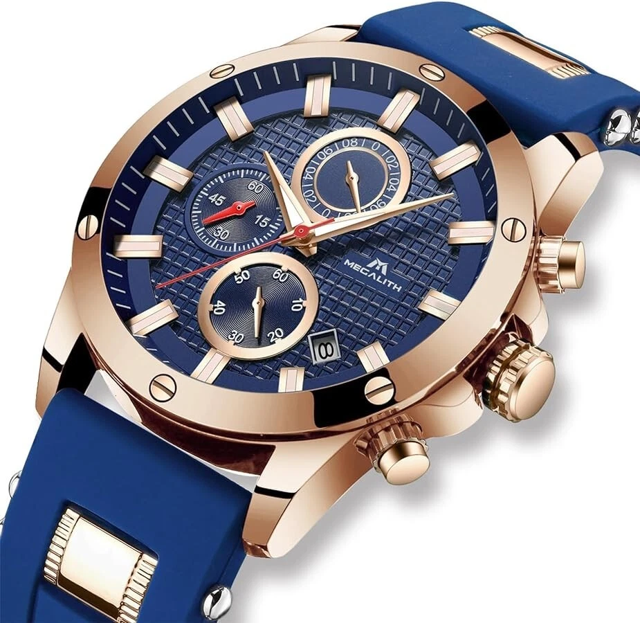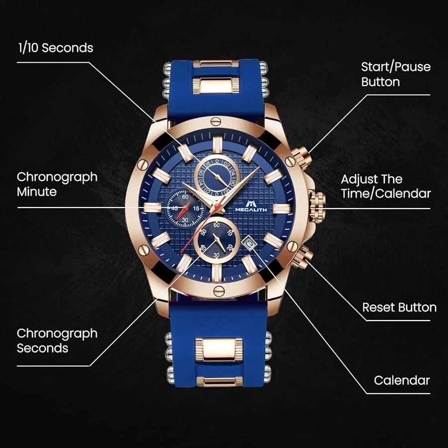 Megalith Luxury Mens Watch Chronograph Waterproof Calendar Quartz Golden Blue