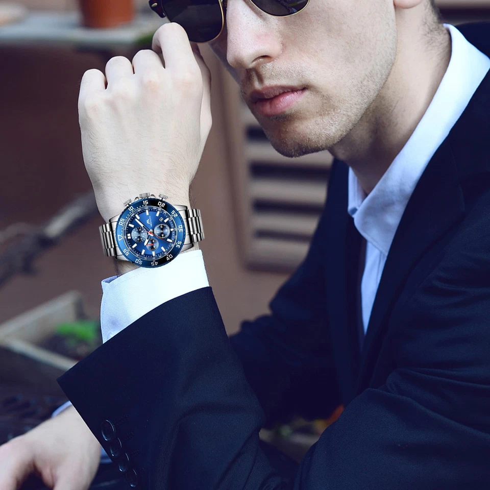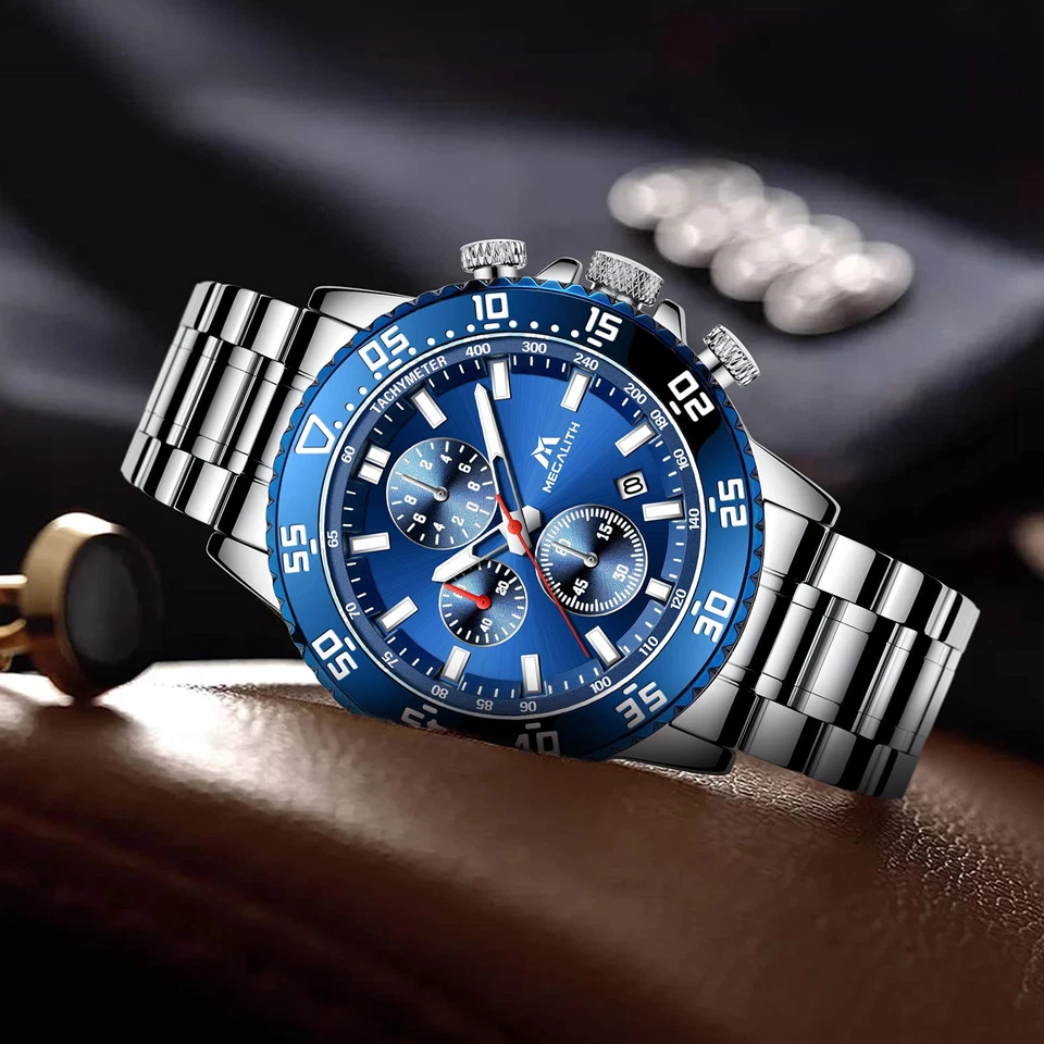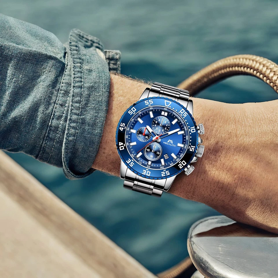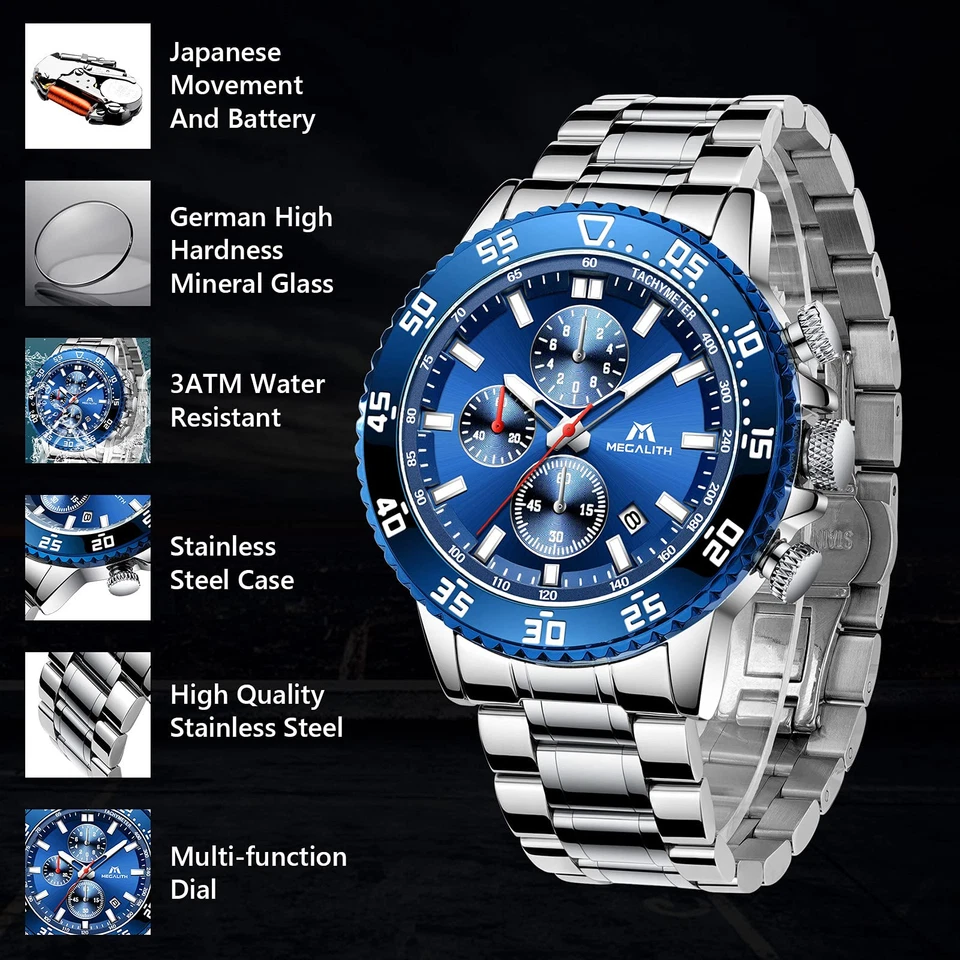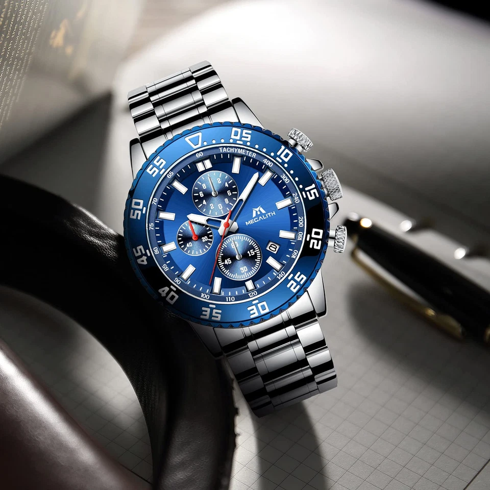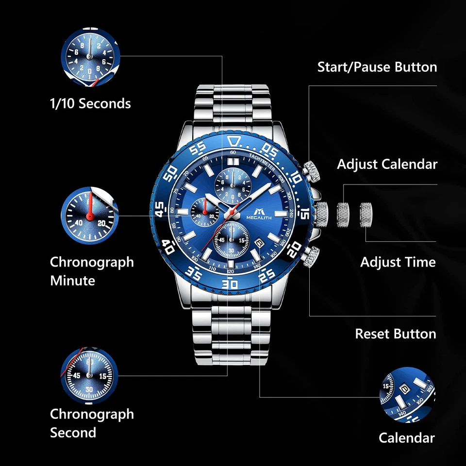 Mens Watches Stainless Steel: Silver Waterproof Chronograph Analog Quartz Wri...