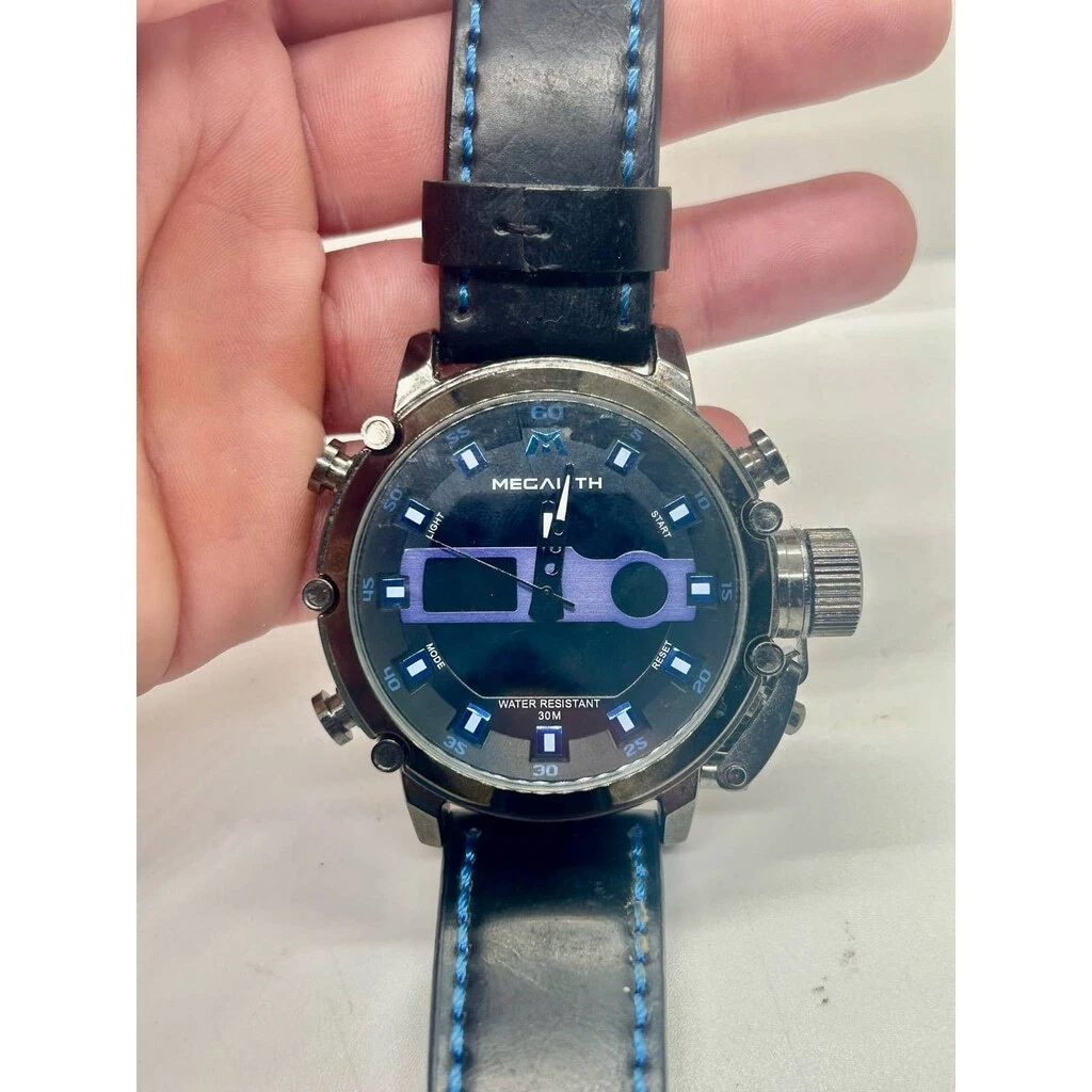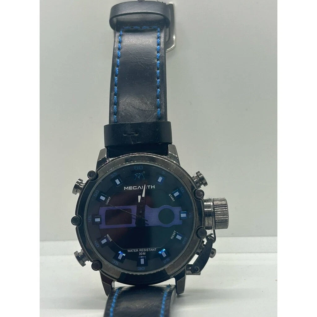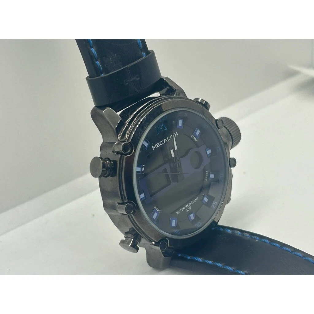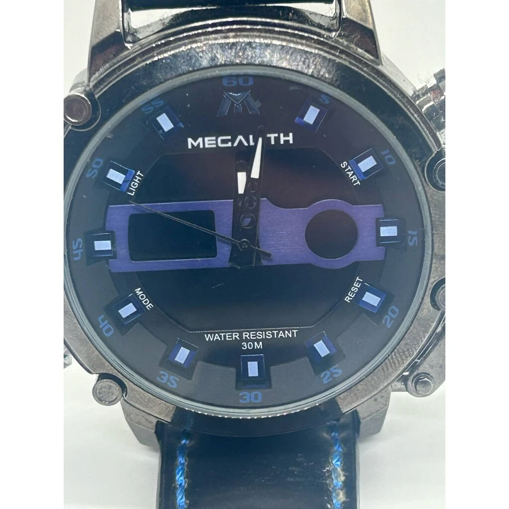 MEGALITH Genuine Leather Black Blue Military Stainless Steel Watch NEEDS BATTERY