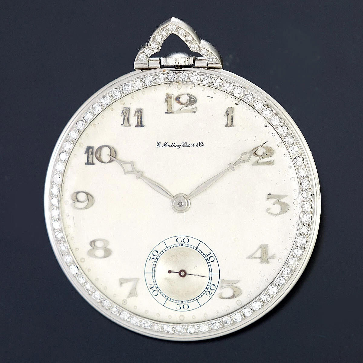 Deco Mathey Tissot Swiss Platinum Pocket Watch with Diamond Bezel & Bow