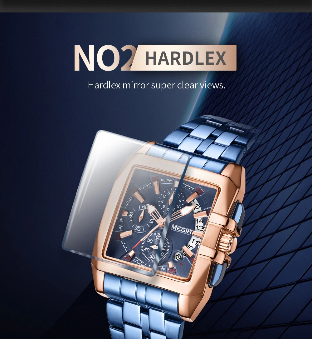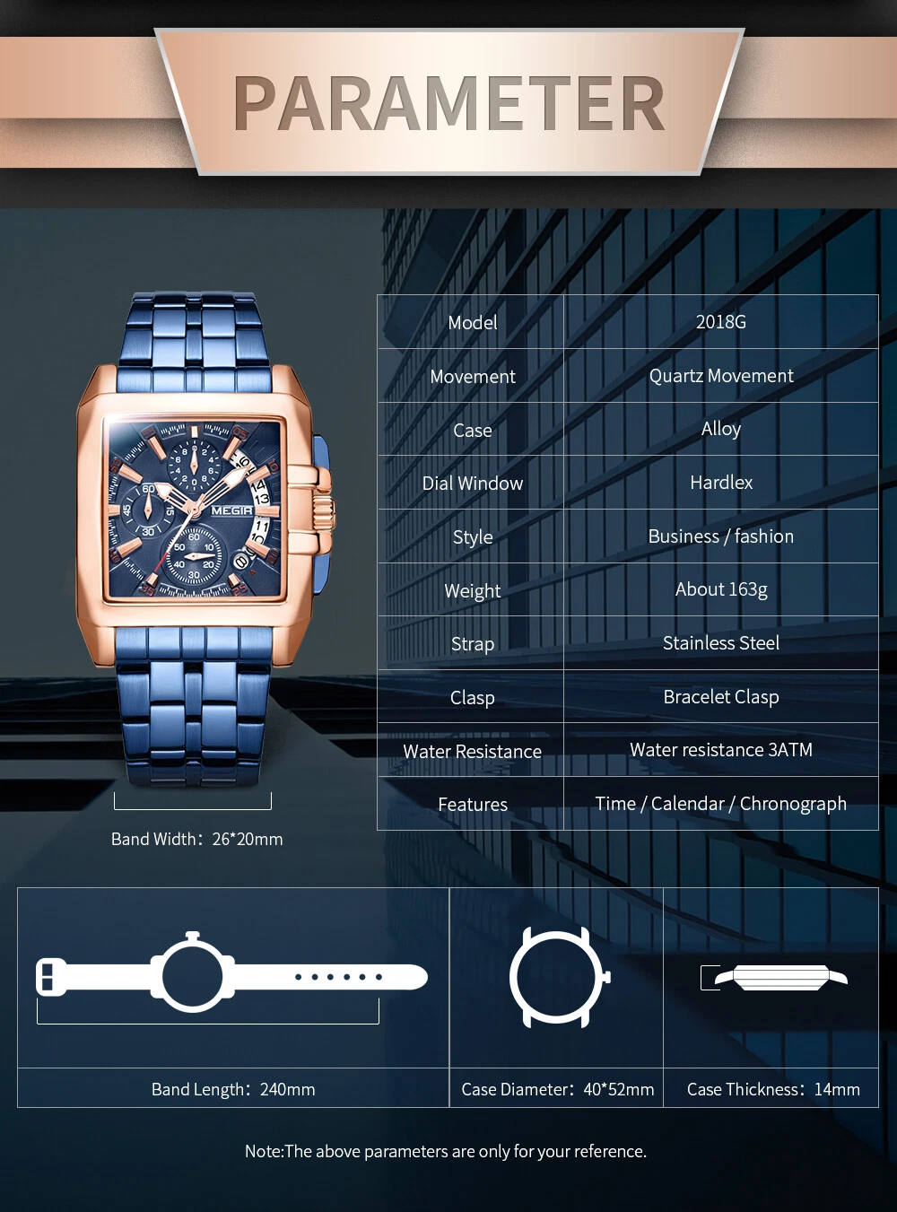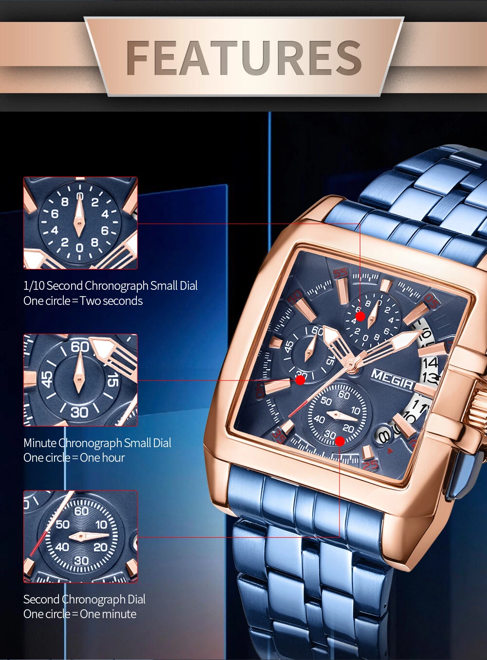 Megir Mens Stainless Steel Chronograph Luminous Rectangle Analogue Quartz Watche