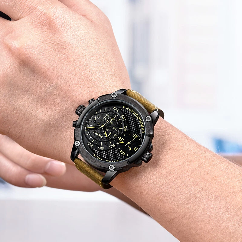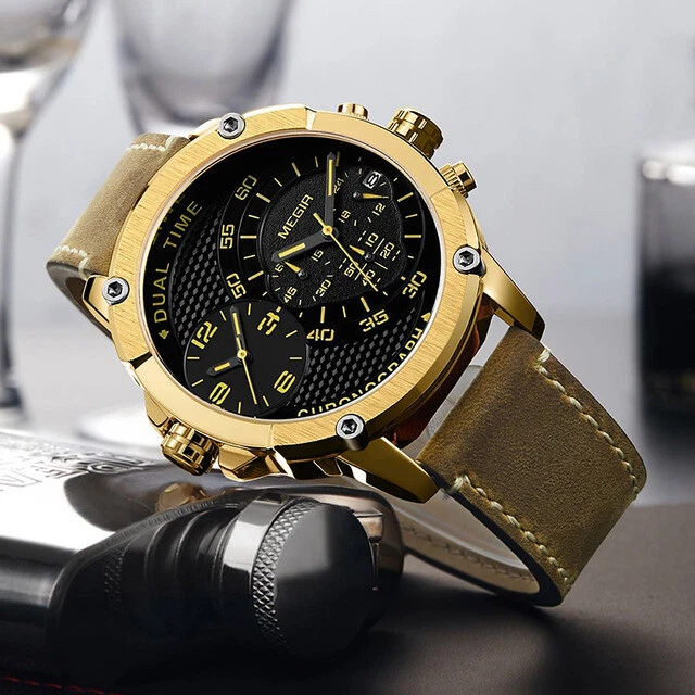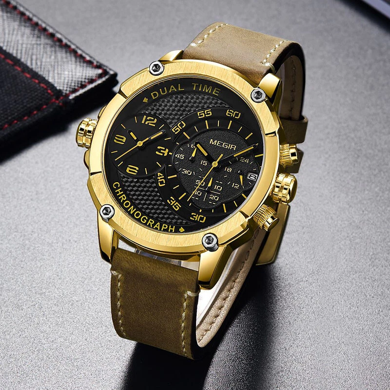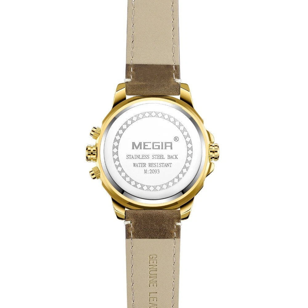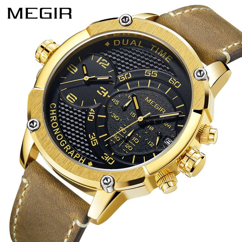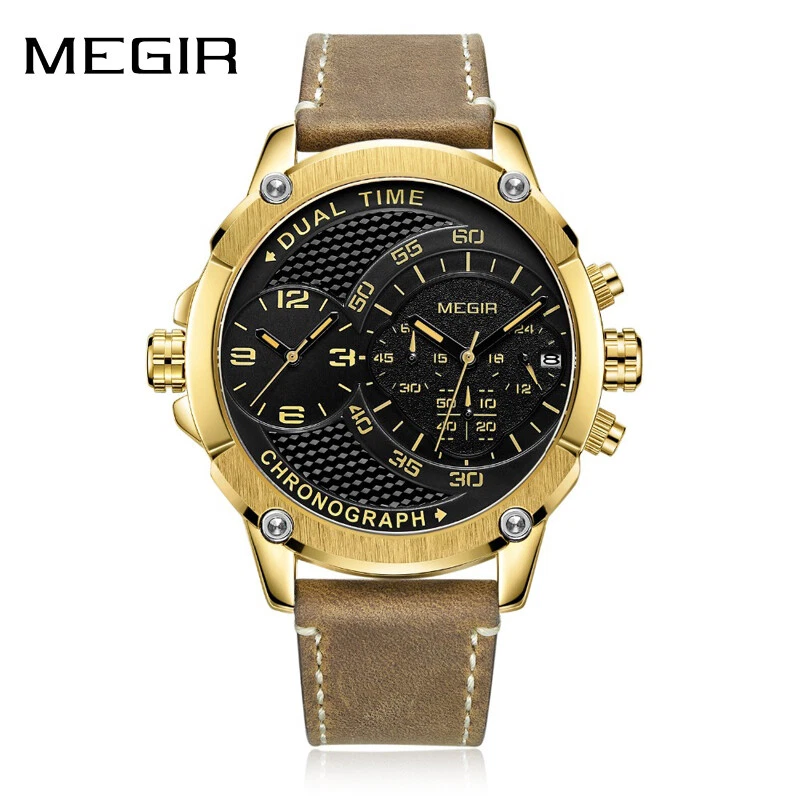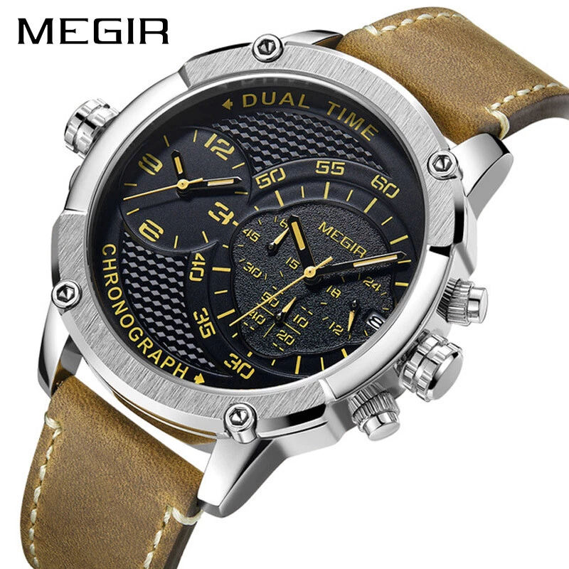 MEGIR Chronograph Sports Leather Quartz Watch Men Dual Time Zone Wristwatches