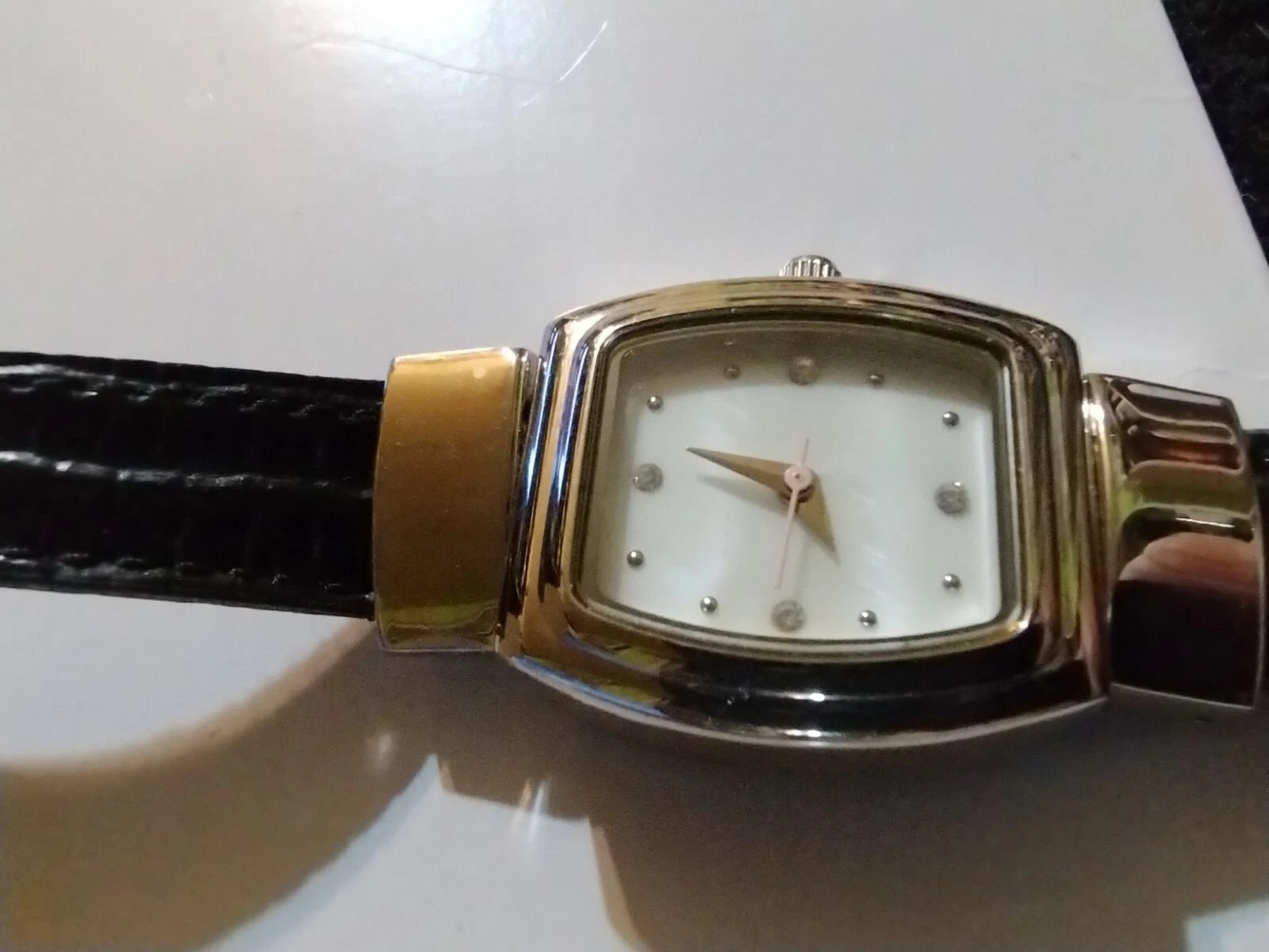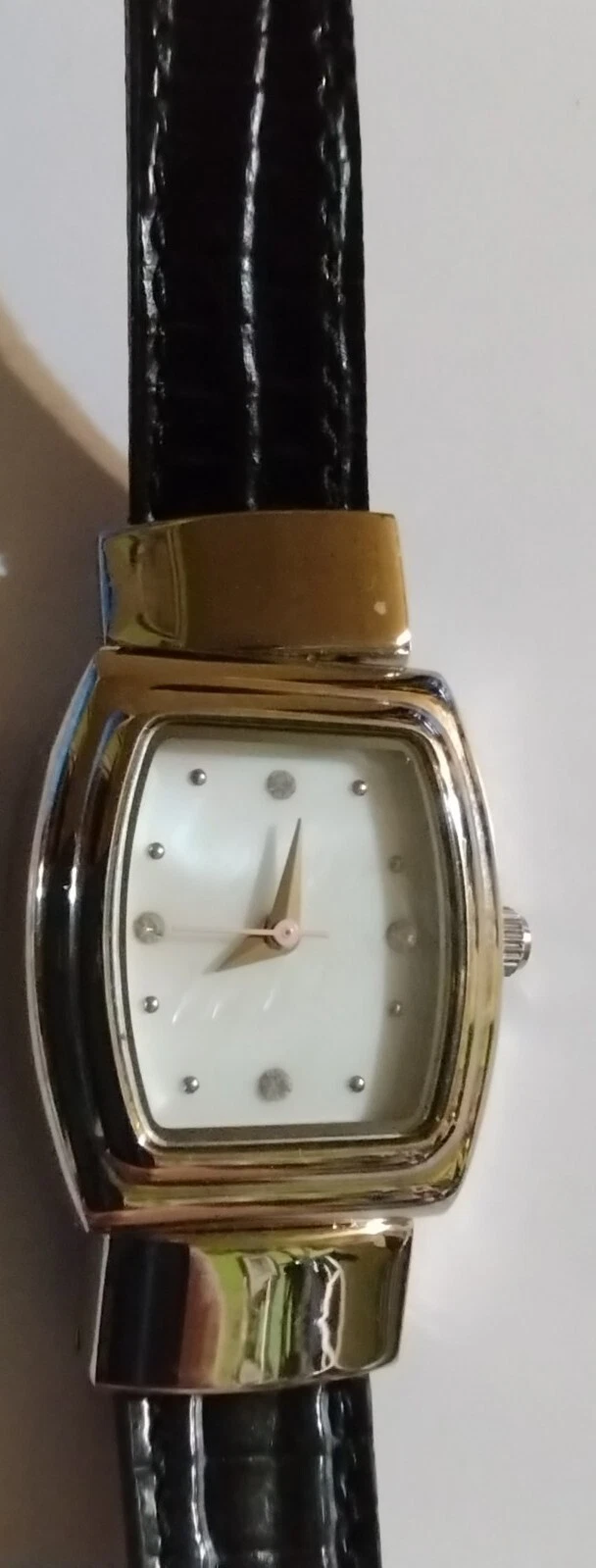 Mary Kay watch, pearl color face dial, leather band, new battery running