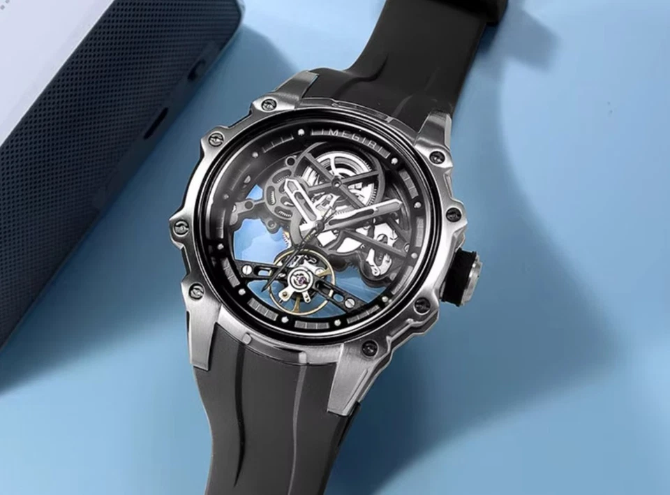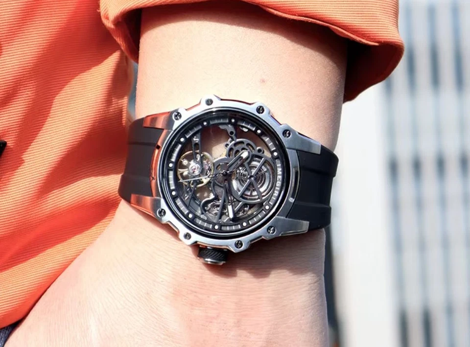 Luxury MEGIR Men's Skeleton Automatic Watch Stainless Steel Silver Black