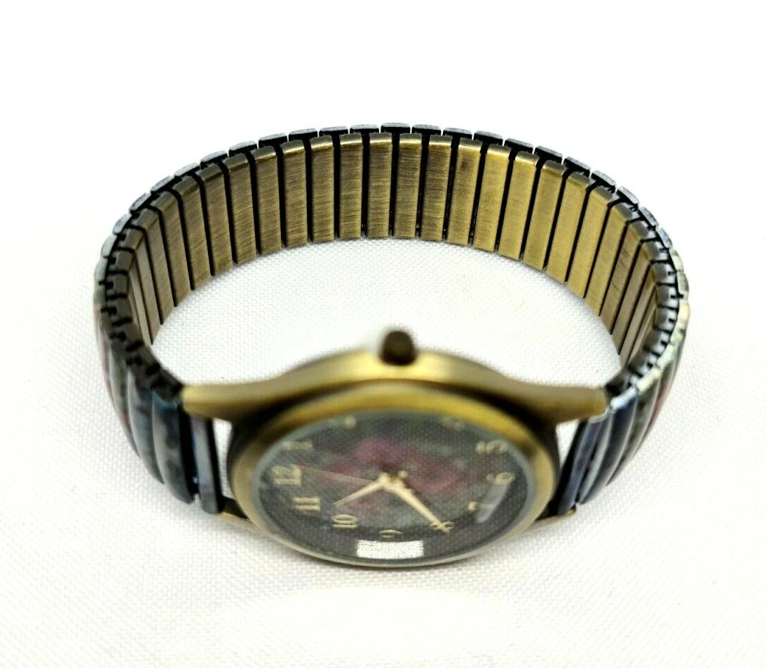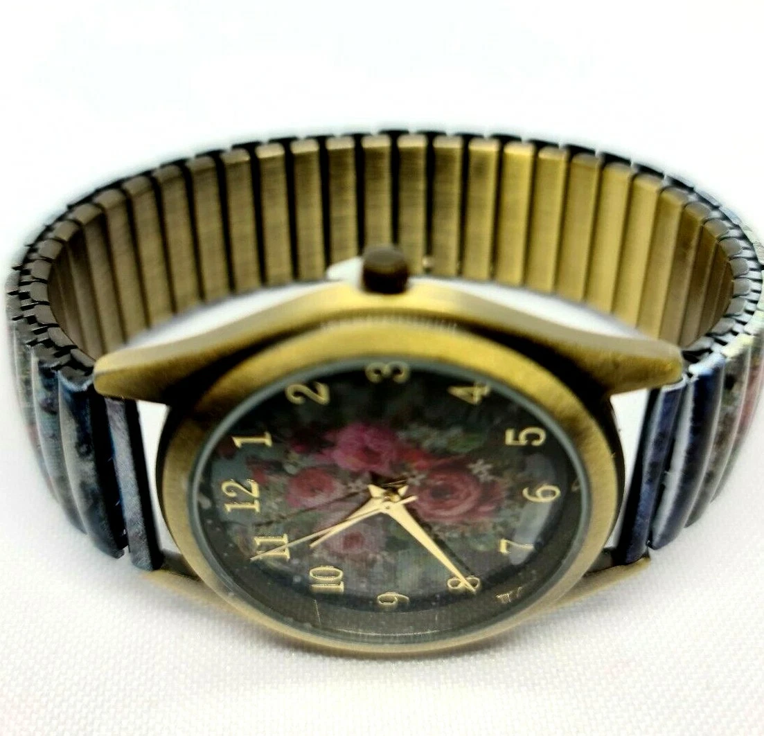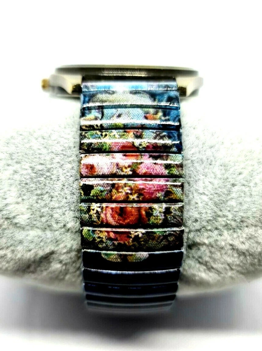 Quartz Watch By Michal Negrin Elastic Metal Strap With Shades Of Purple Flowers.