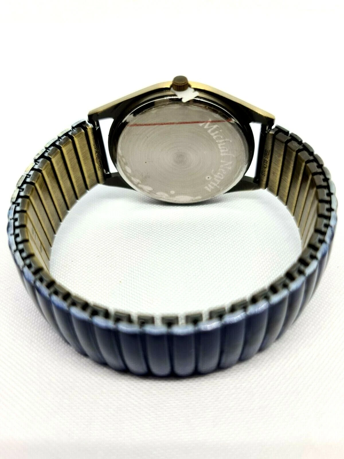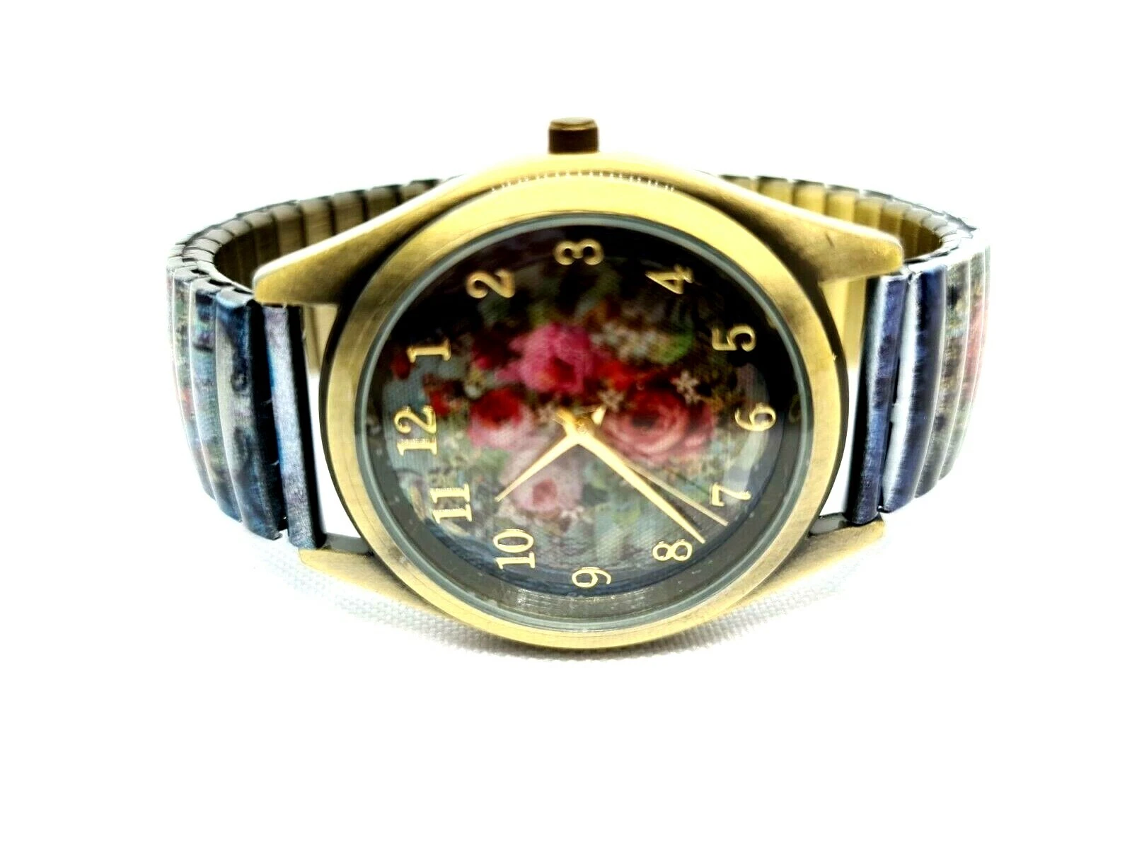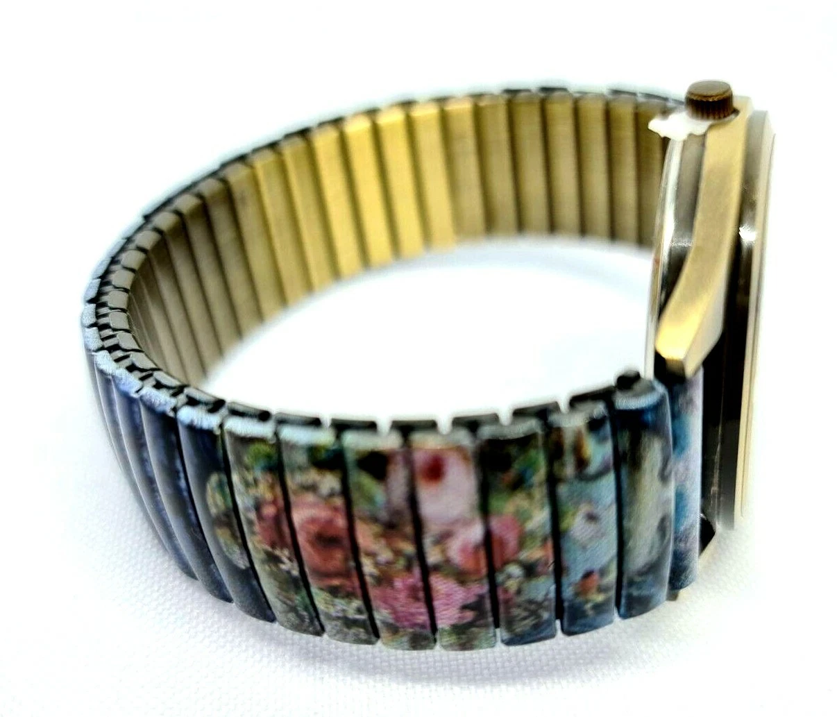Quartz Watch By Michal Negrin Elastic Metal Strap With Shades Of Purple Flowers.
