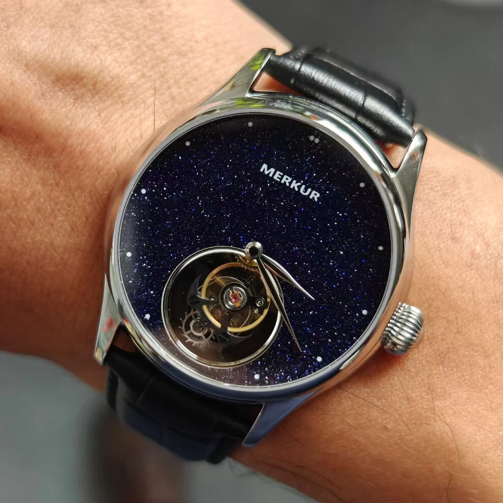 MERKUR Men Tourbillon Watch 43mm Vintage Mechanical Wristwatch Goldstone Dial