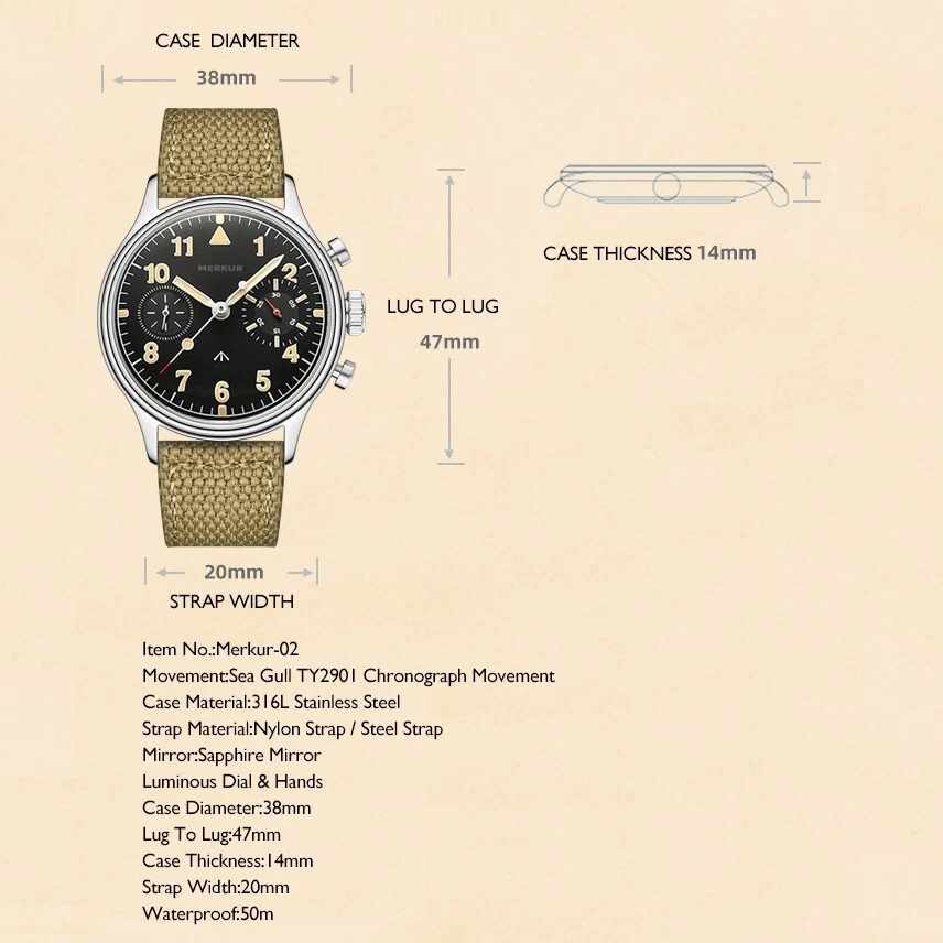 MERKUR Mens Chronograph Watches Pilot Manual Wind Mechanical Wristwatch TY2901