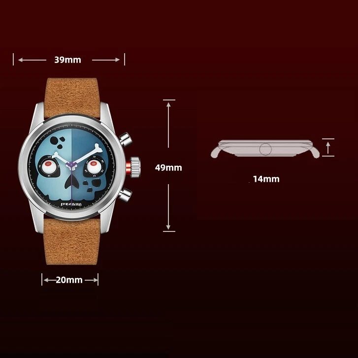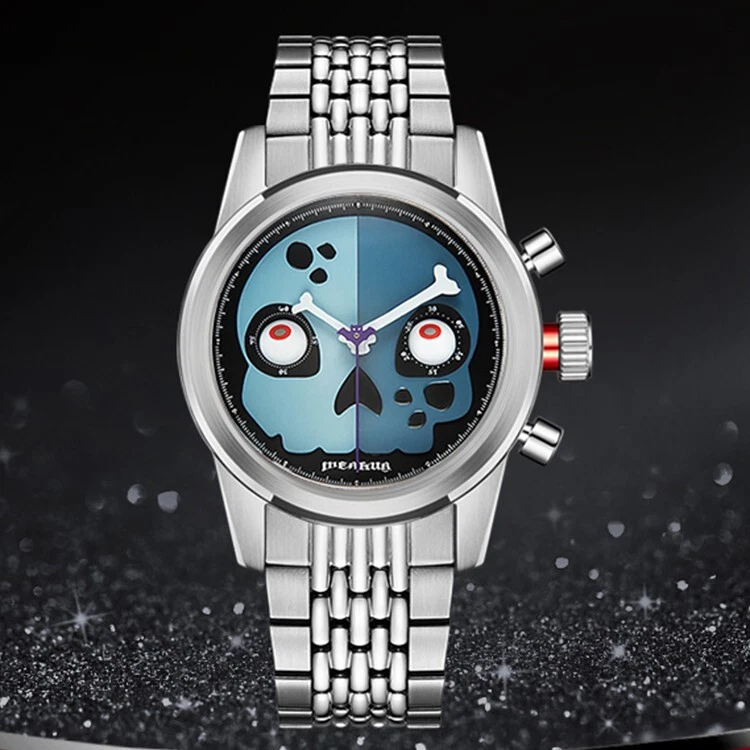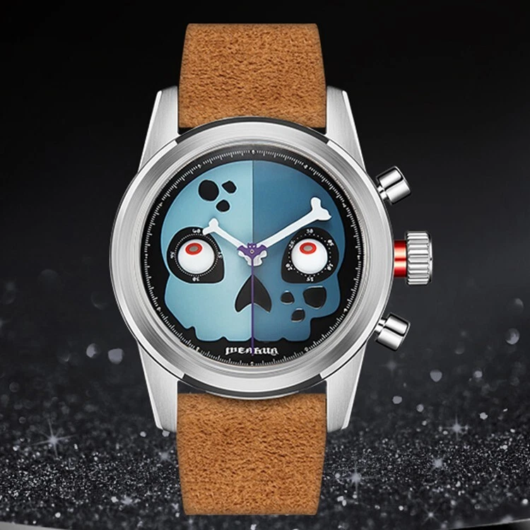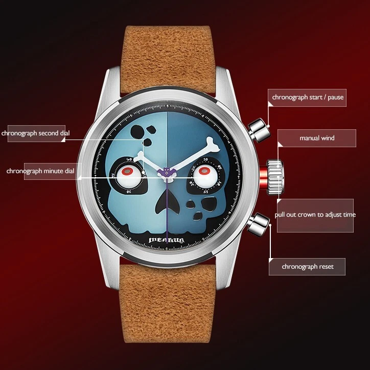 MERKUR Men Chronograph Watch 39mm Manual Wind Mechanical Wristwatch Skull Dial