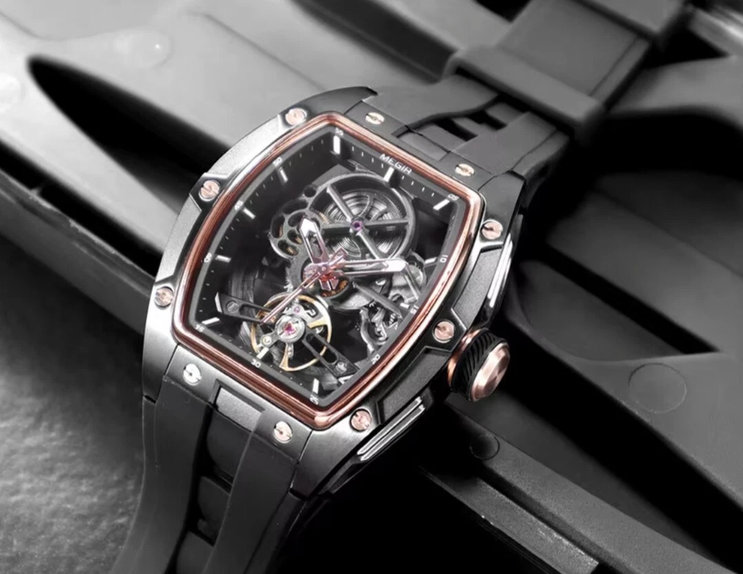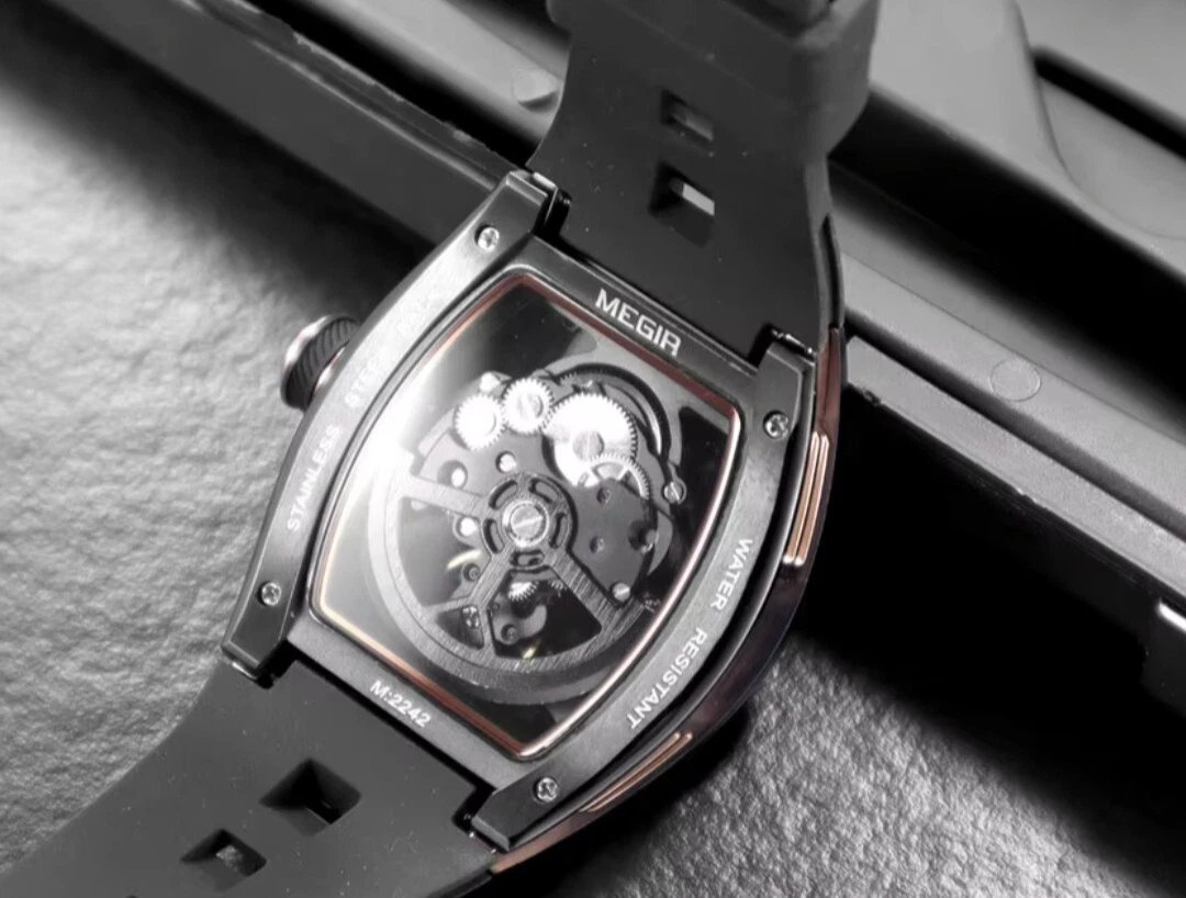 MEGIR 316 Stainless Steel Skeleton Automatic Watch Silicone Strap Men Rose Black