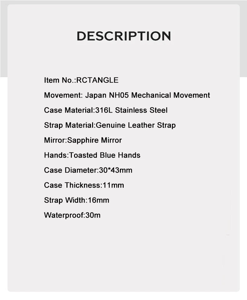 MERKUR Men Automatic Watch 30*43mm Retange Mechanical Wristwatch NH05 Blue Dial