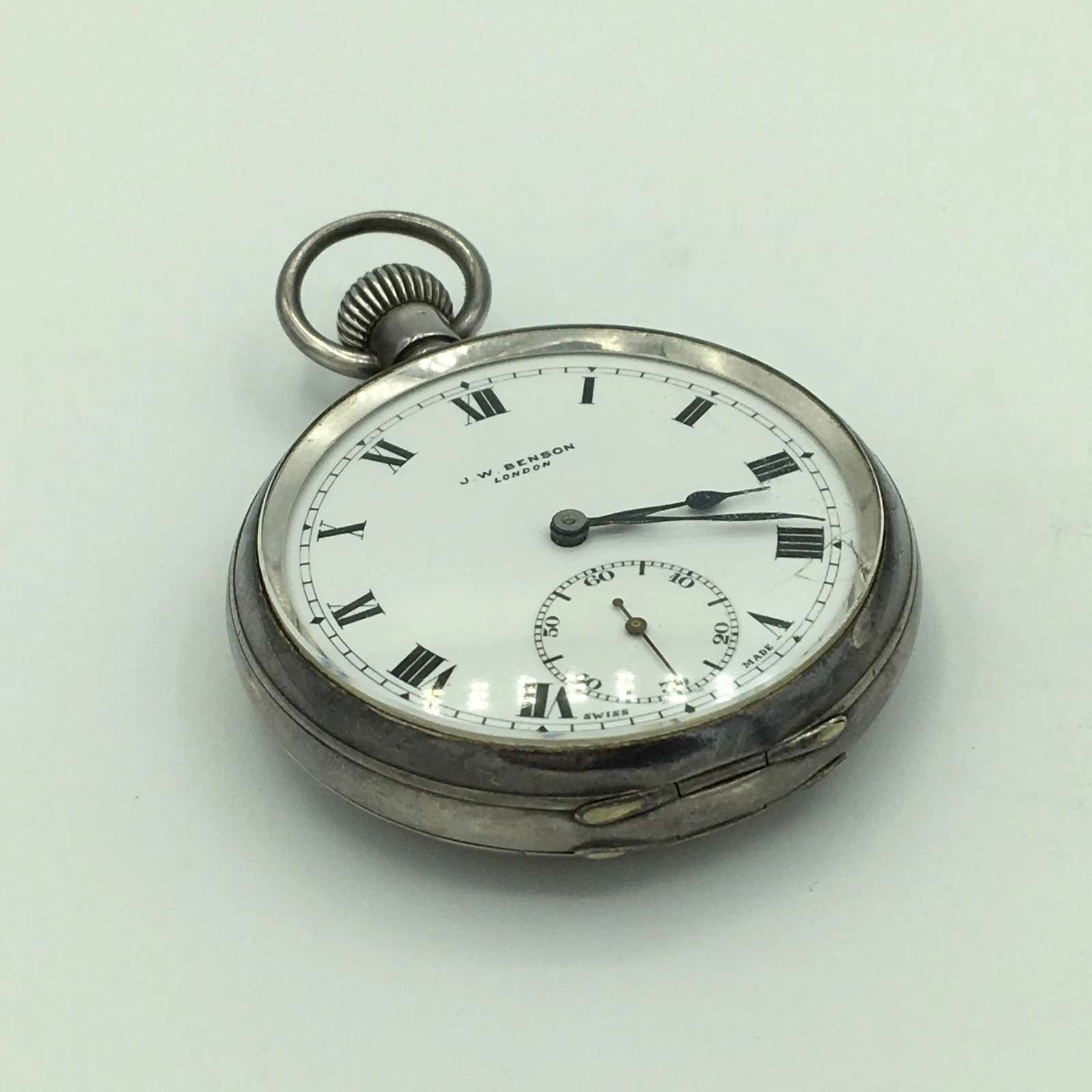 J. W. Benson London Swiss 15 Jewel Sterling Silver OF Pocket Watch 12s #939a