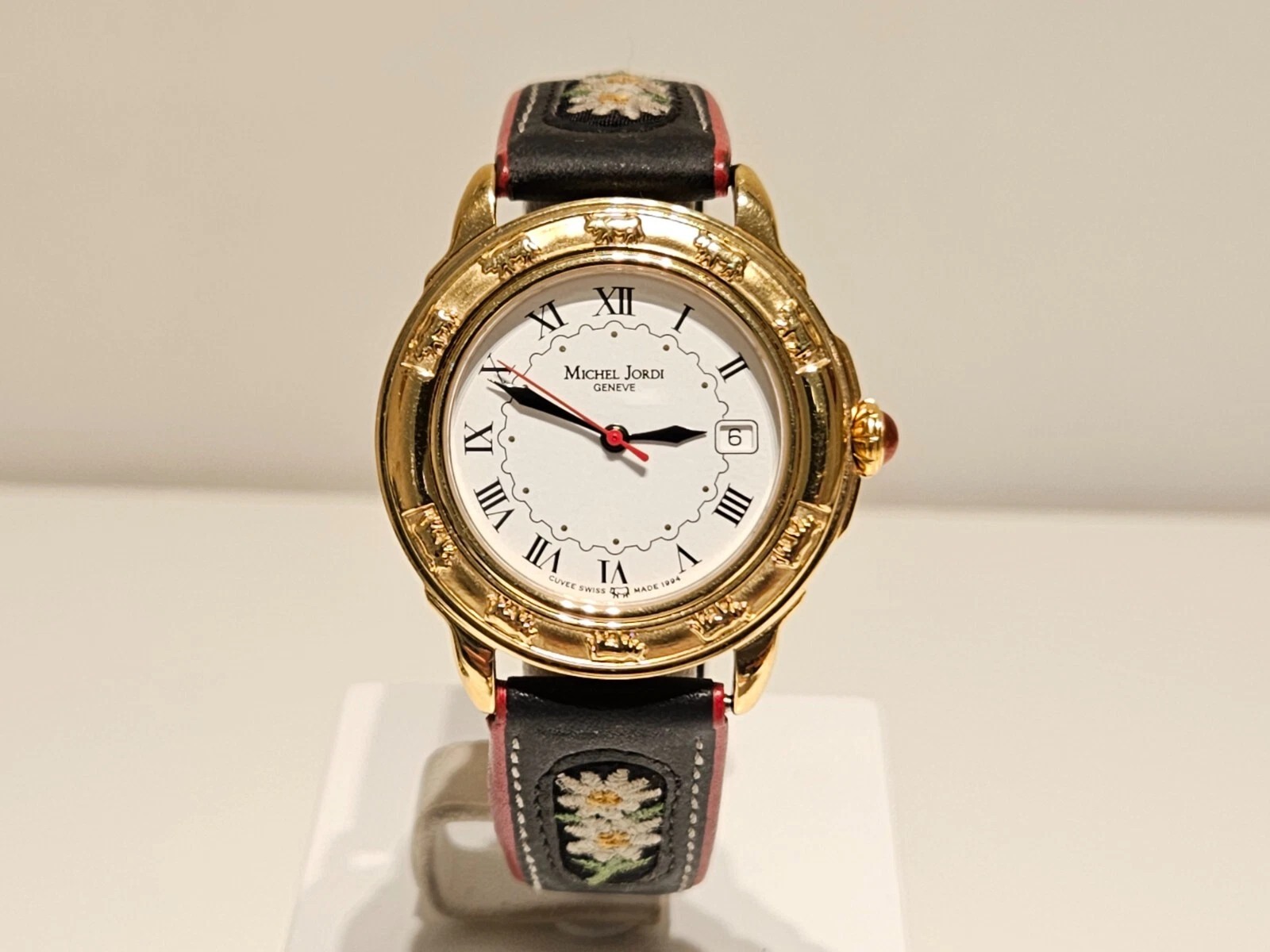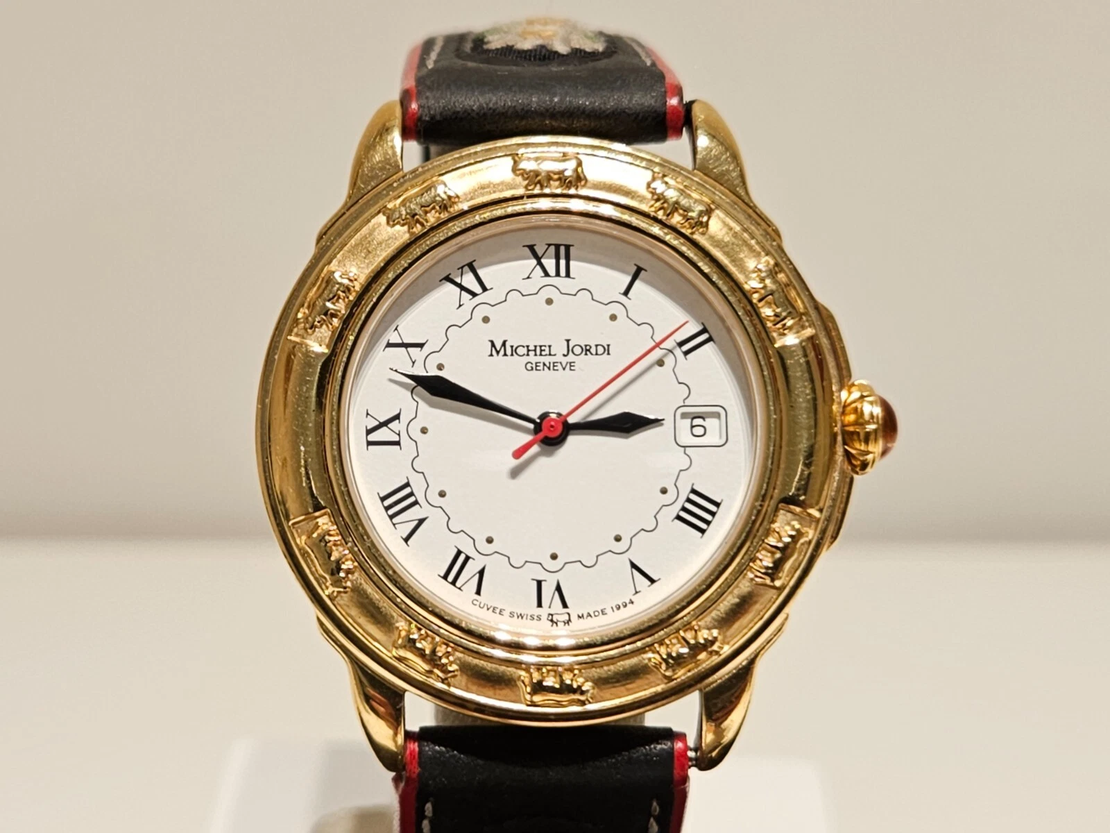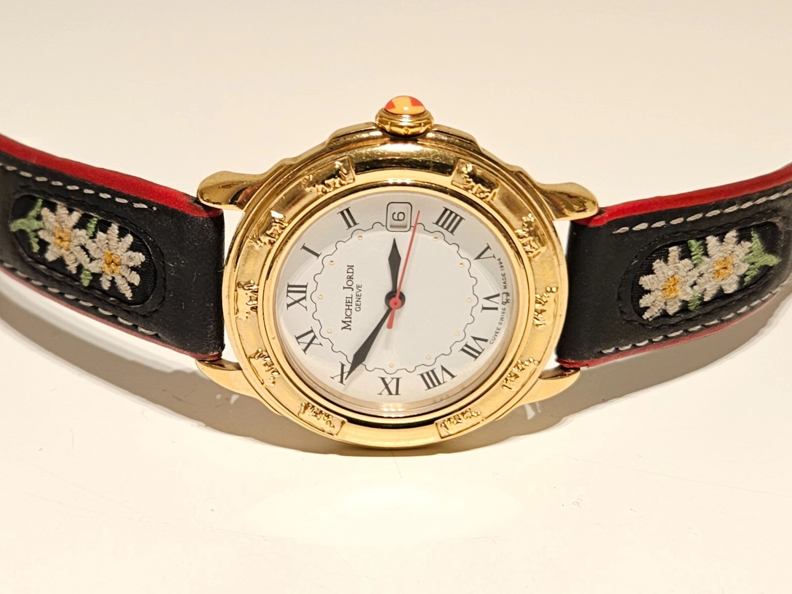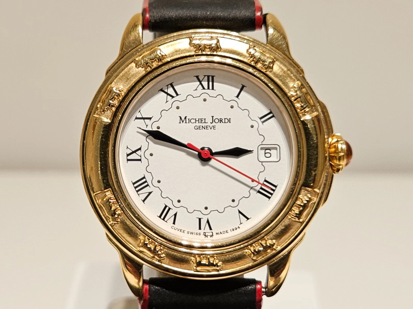VINTAGE LUXURY GOLD PLATED MEN'S SWISS QUARTZ WATCH+LEATHER BAG "MICHEL JORDI"
