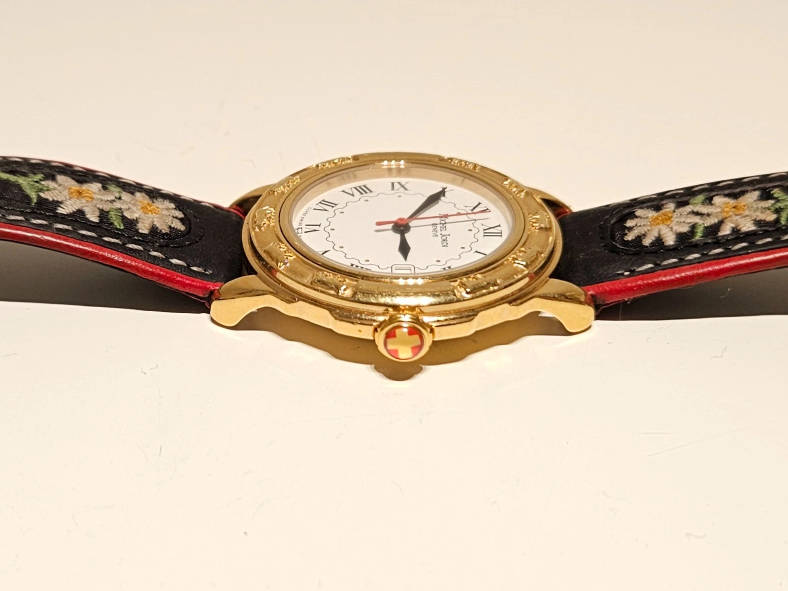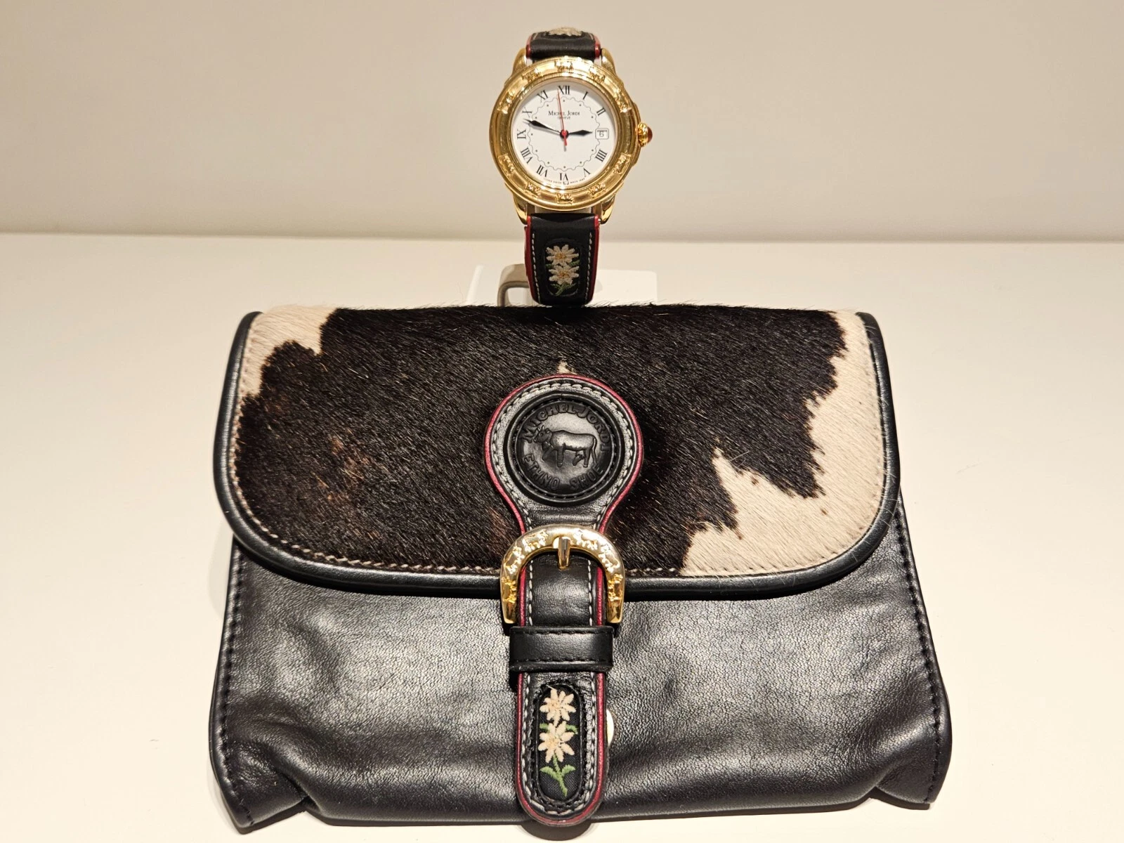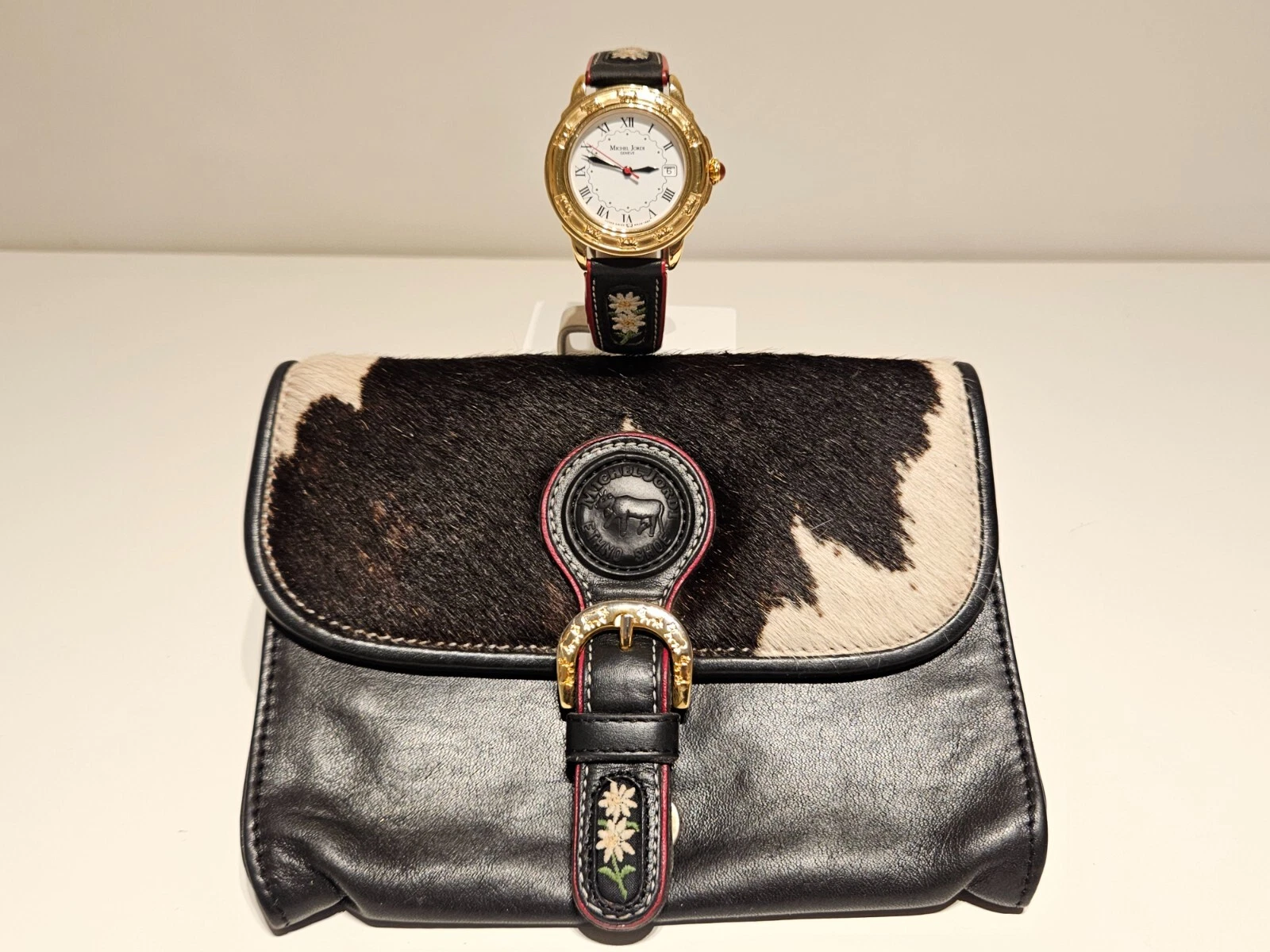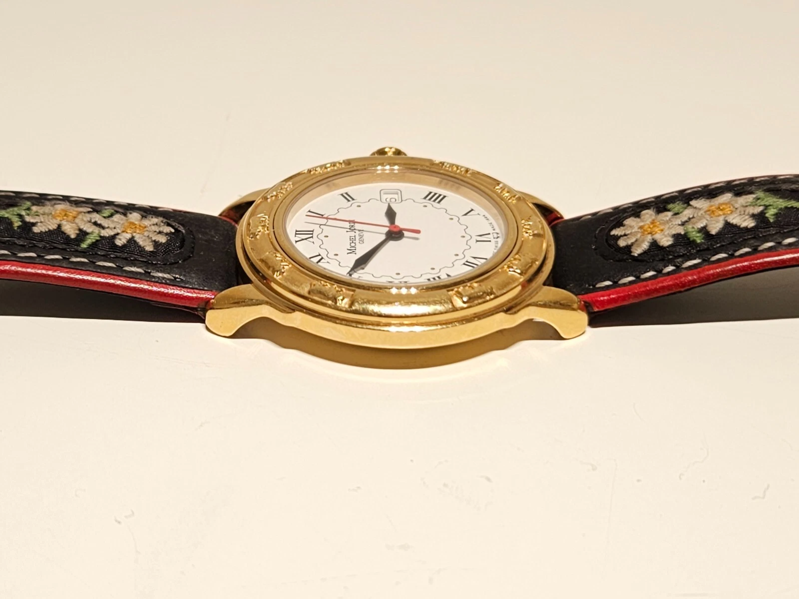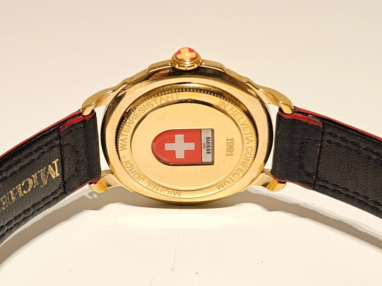 VINTAGE LUXURY GOLD PLATED MEN'S SWISS QUARTZ WATCH+LEATHER BAG "MICHEL JORDI"