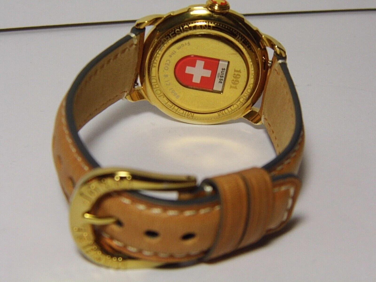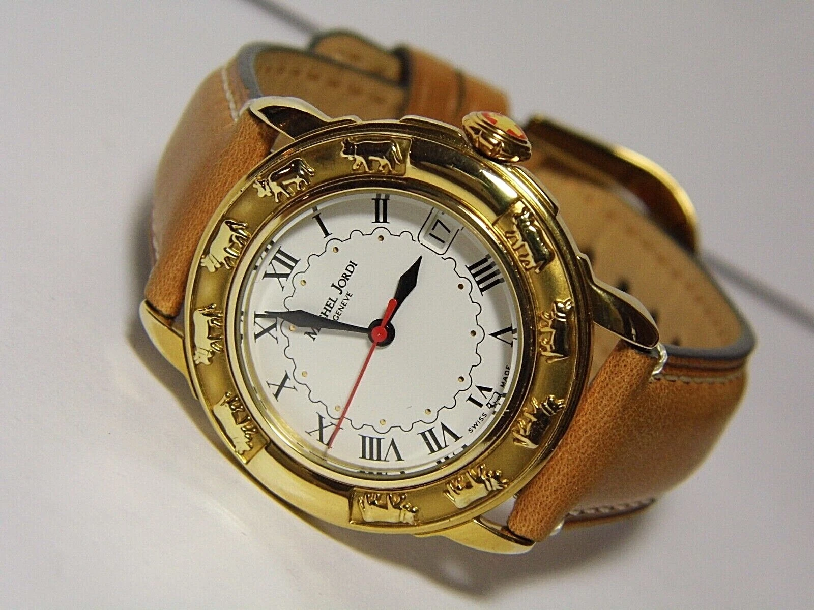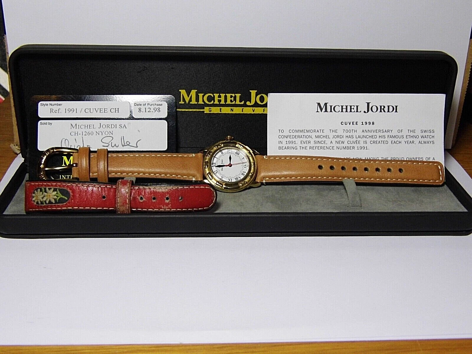 MICHEL JORDI ETHNO 1998 CUVÉE RARE S/STEEL G/PTD.SWISS 7 JEWEL WATCH+BOX+BELTBAG