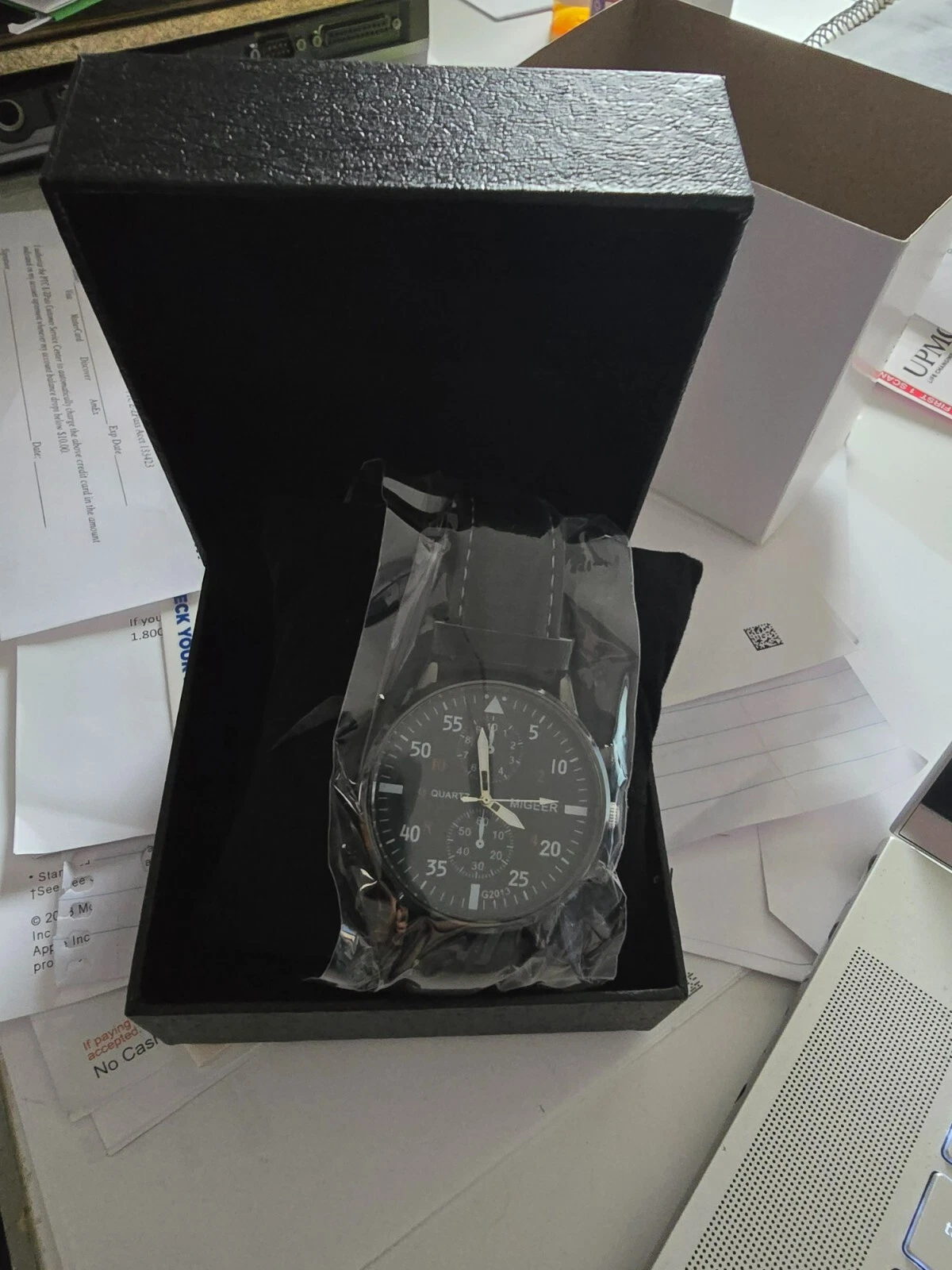 NEW MIGEER Mens Watch Fresh Battery Faux Chronograph Black Band Black Dial/Case