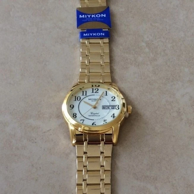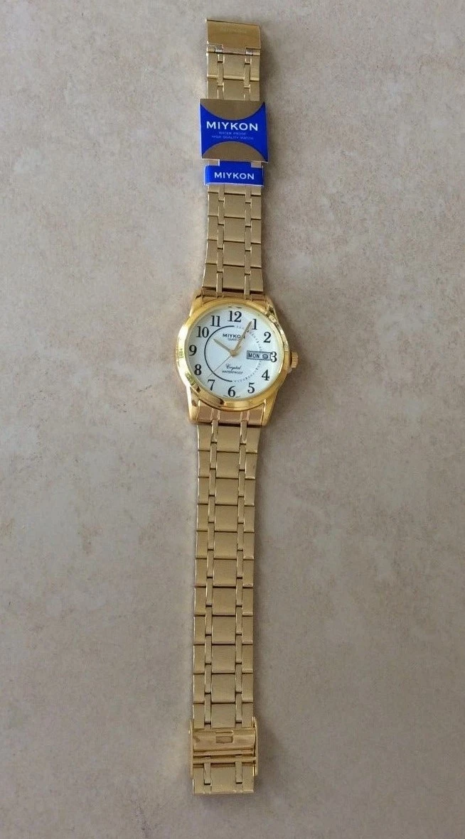 Miykon Gold Men's Watch Round White Day & Date Dial on Gold Linked Band New Item