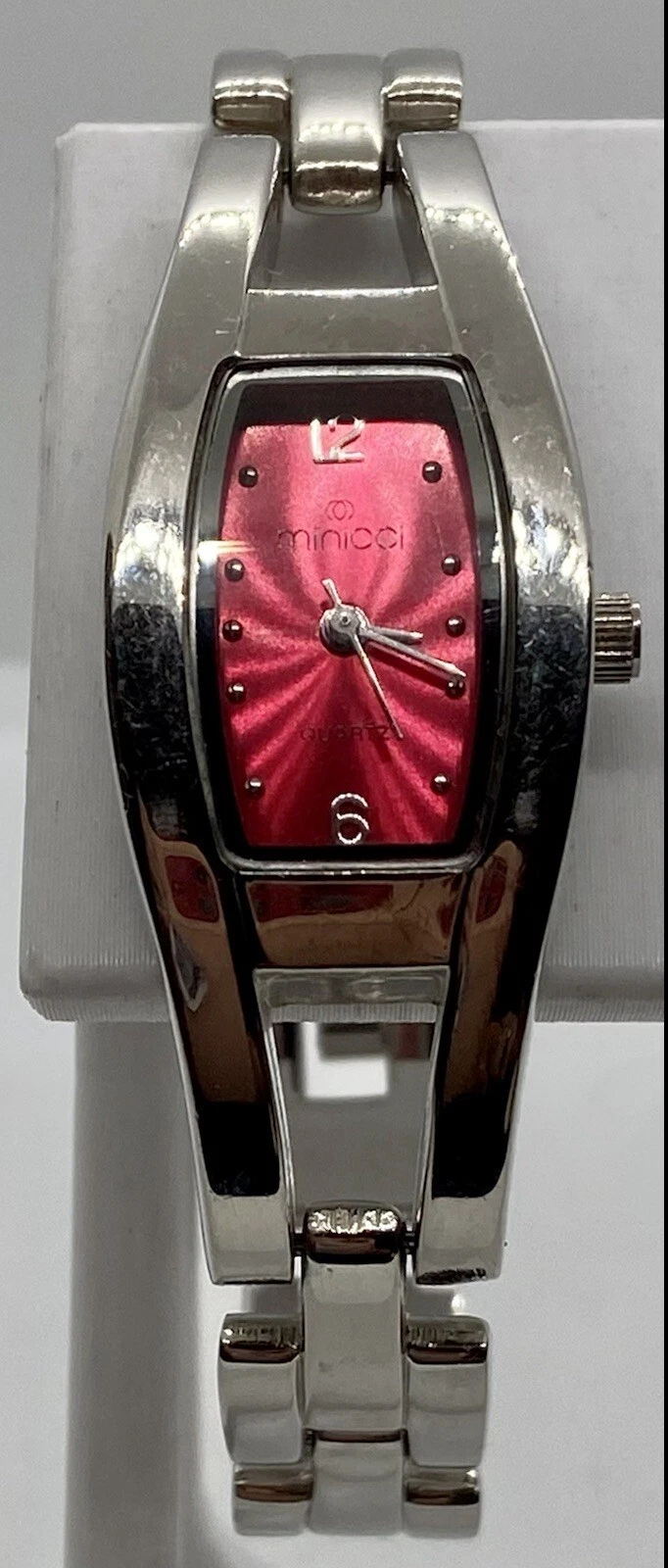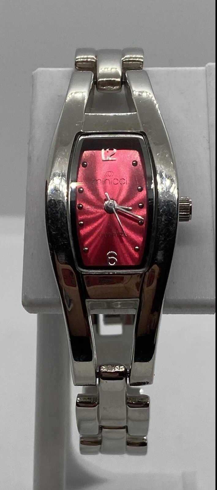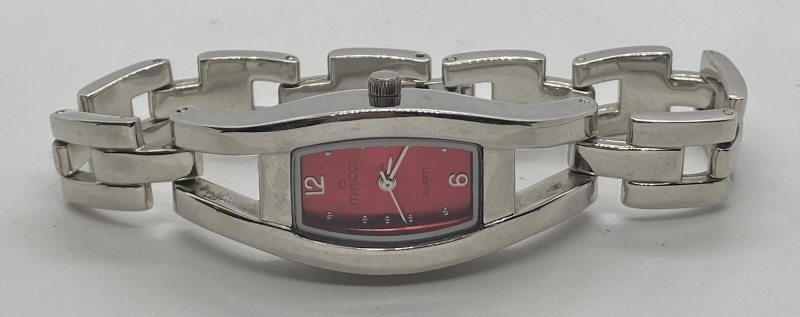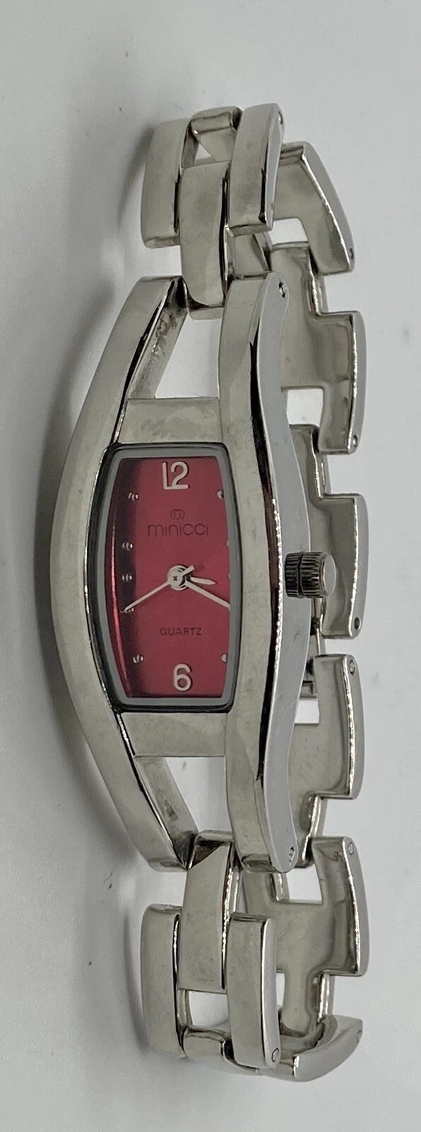 MINICCI LADIES WATCH Silver TONNEAU CASE Red Dial Fits To 6-3/4” Wrists NICE!