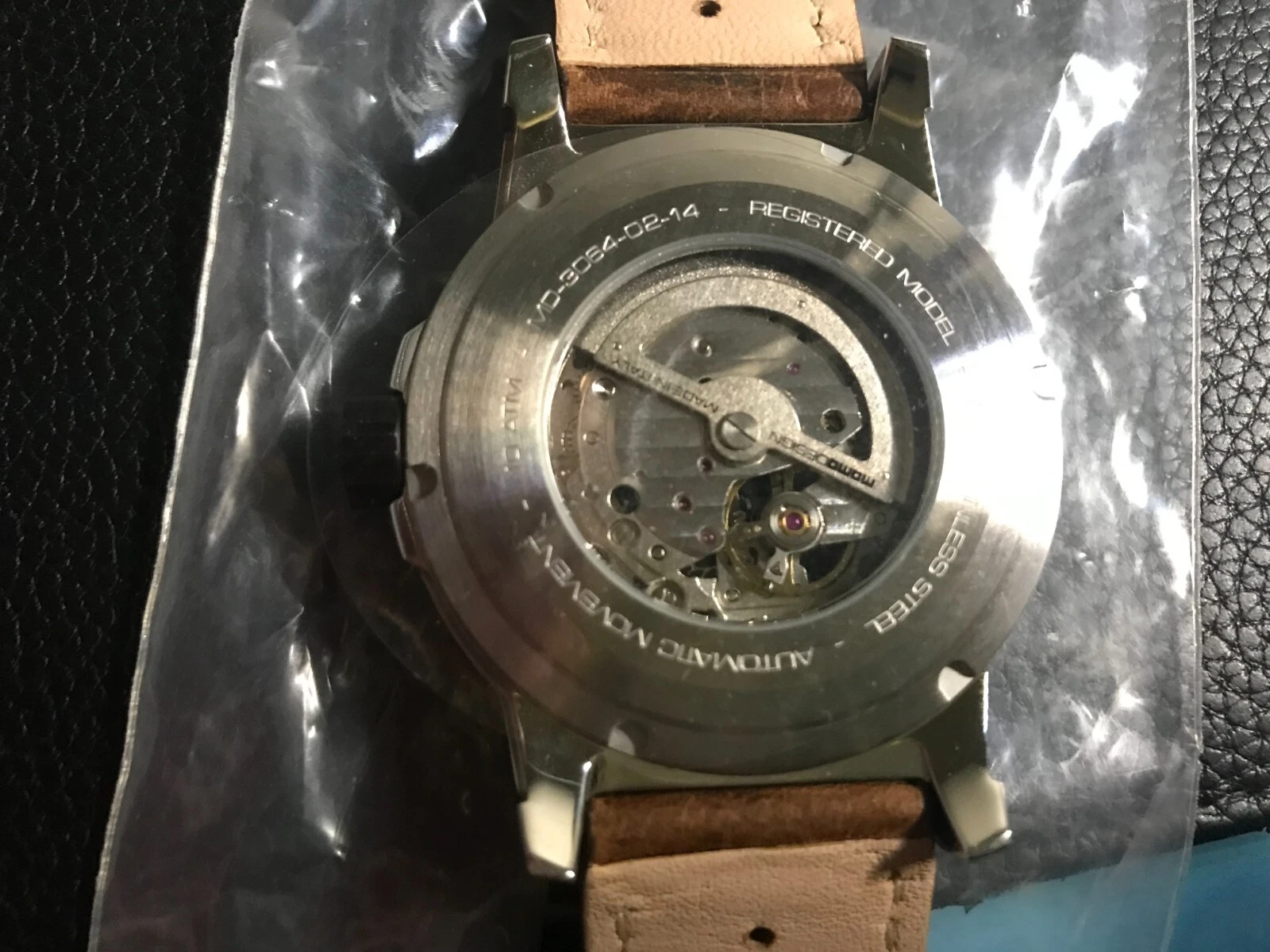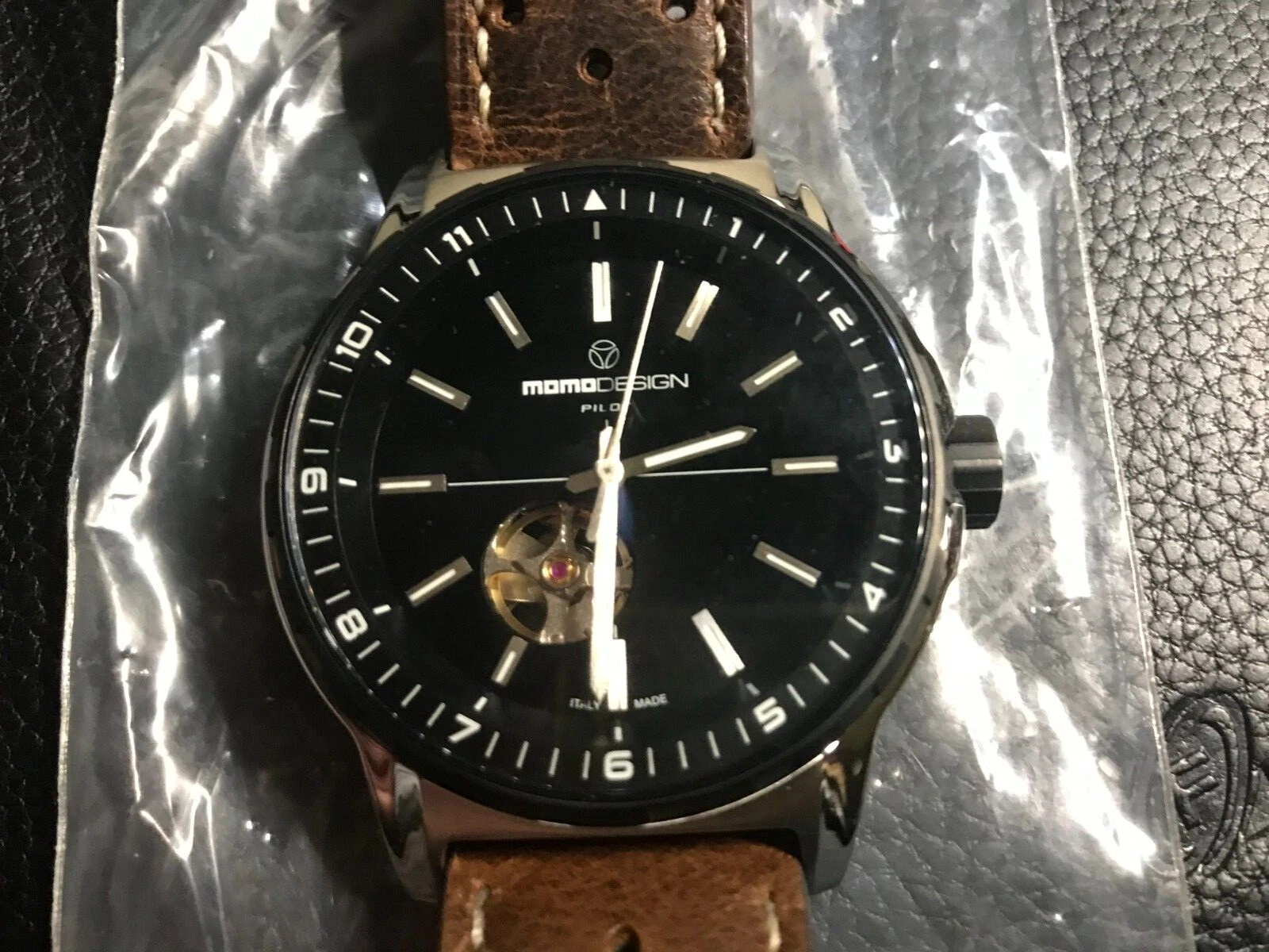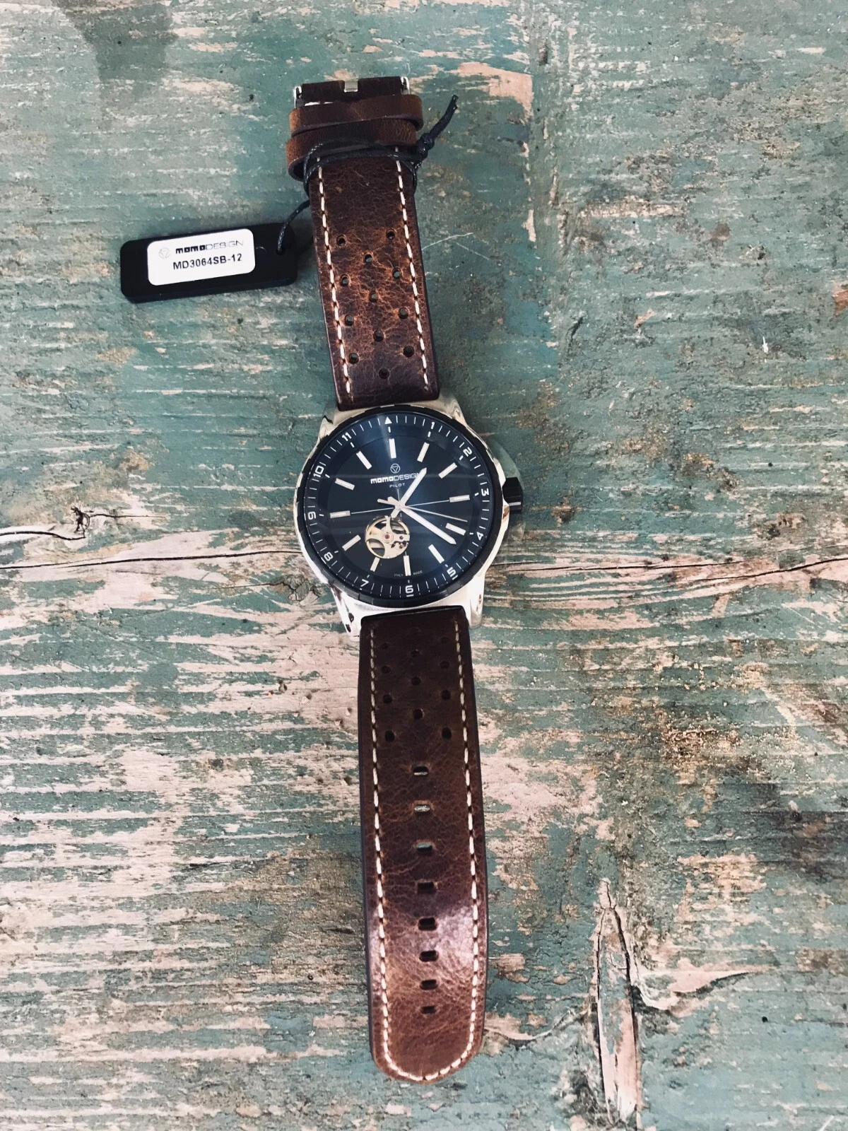 MomoDesign Pilot Heritage Automatic Skeleton Back Leather Band Men's Watch, NIB