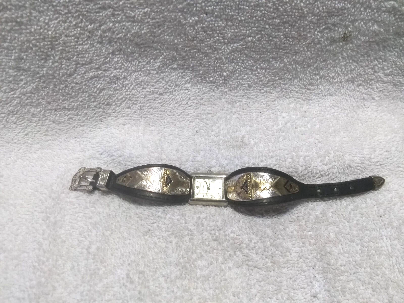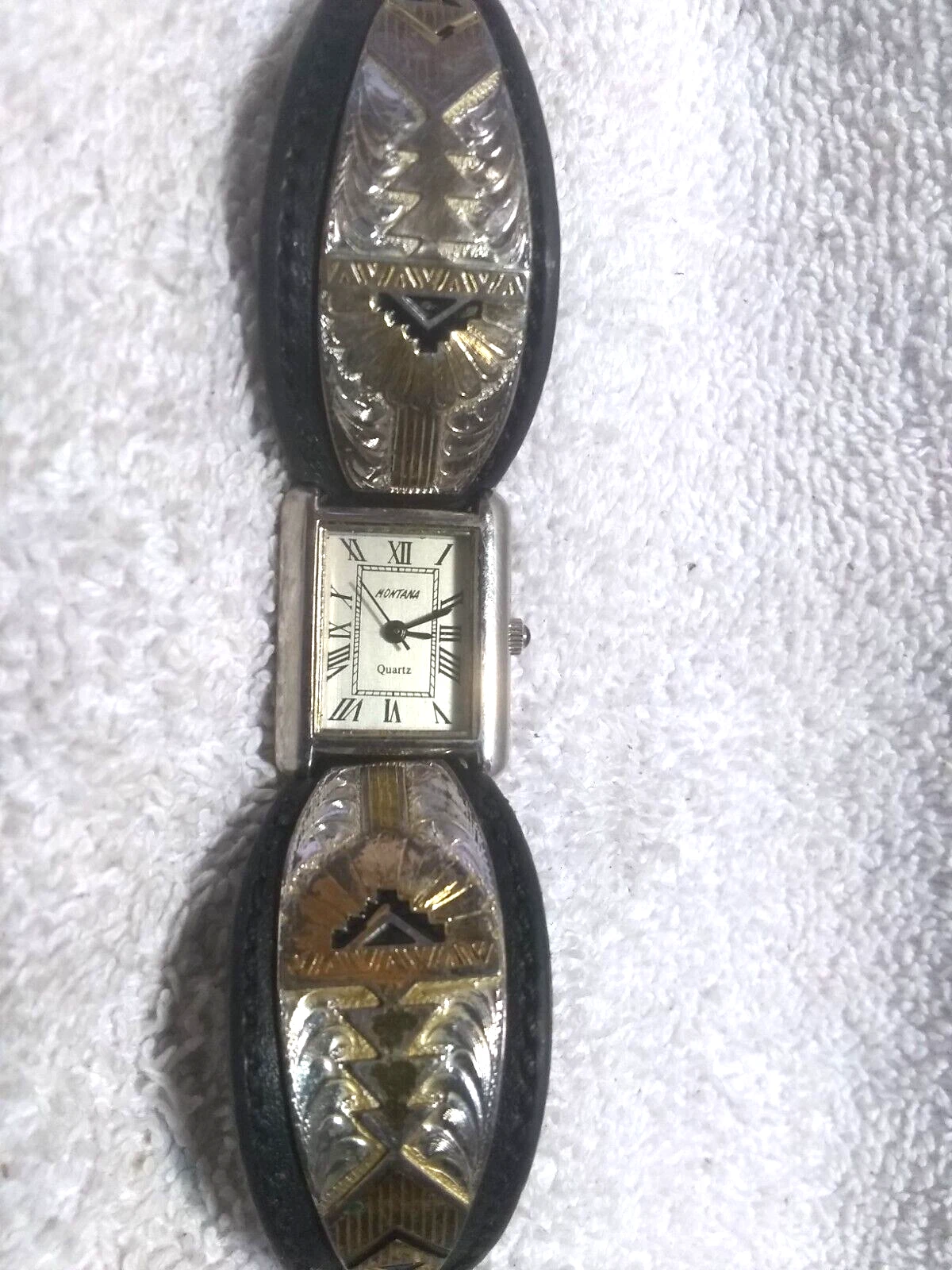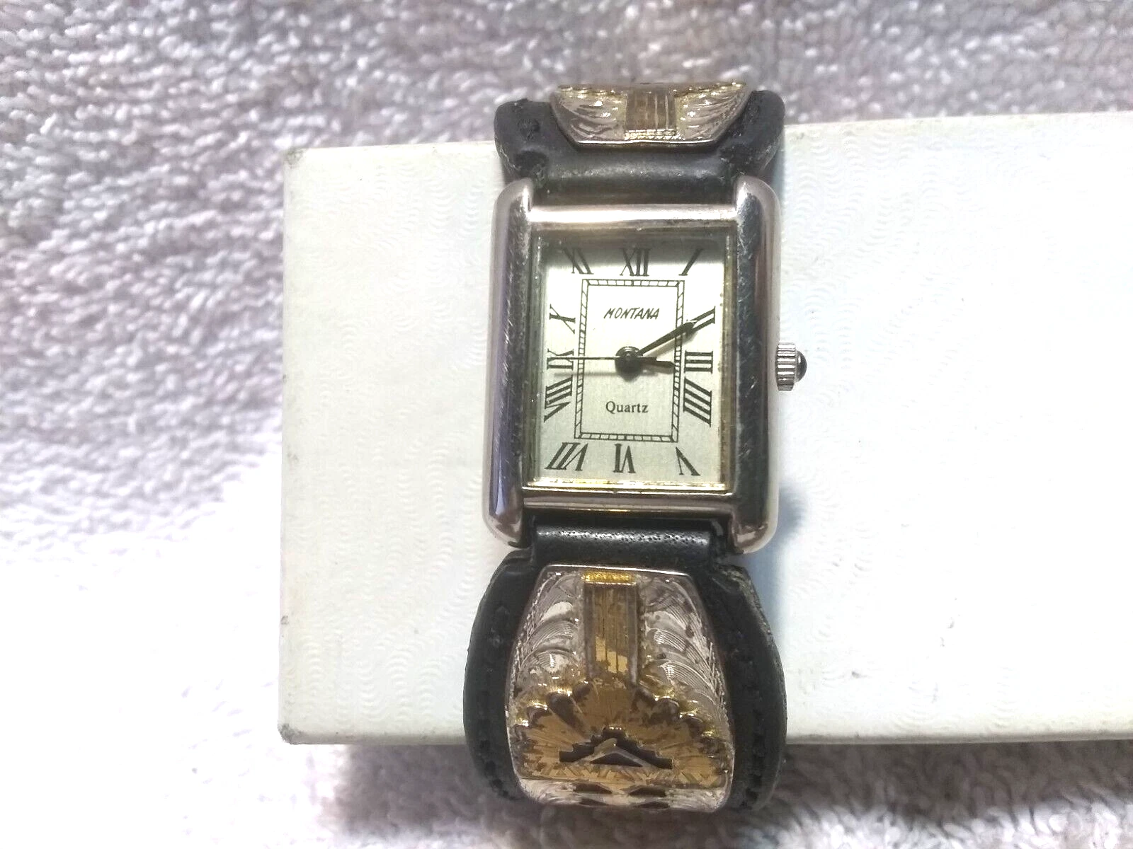 Montana Silversmiths Watch Aztec Silver Gold Black Leather New Bat Great Shape 3