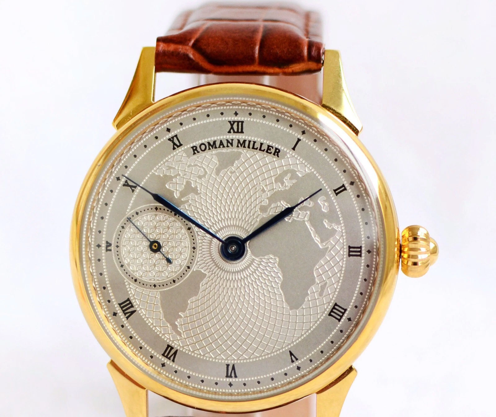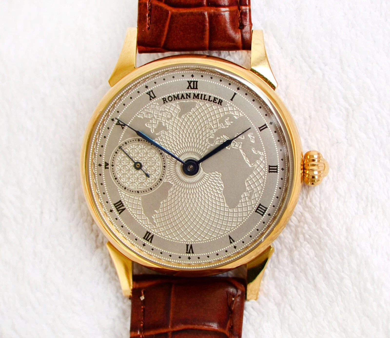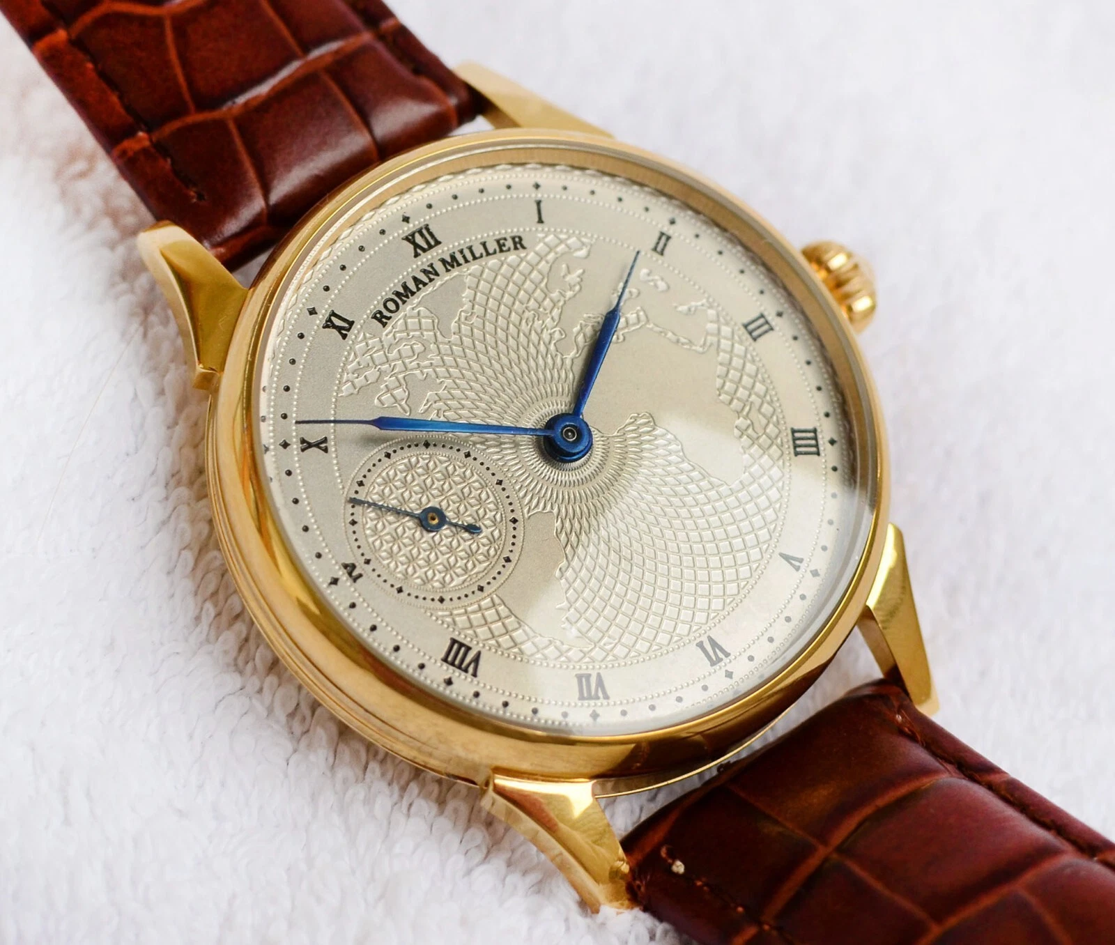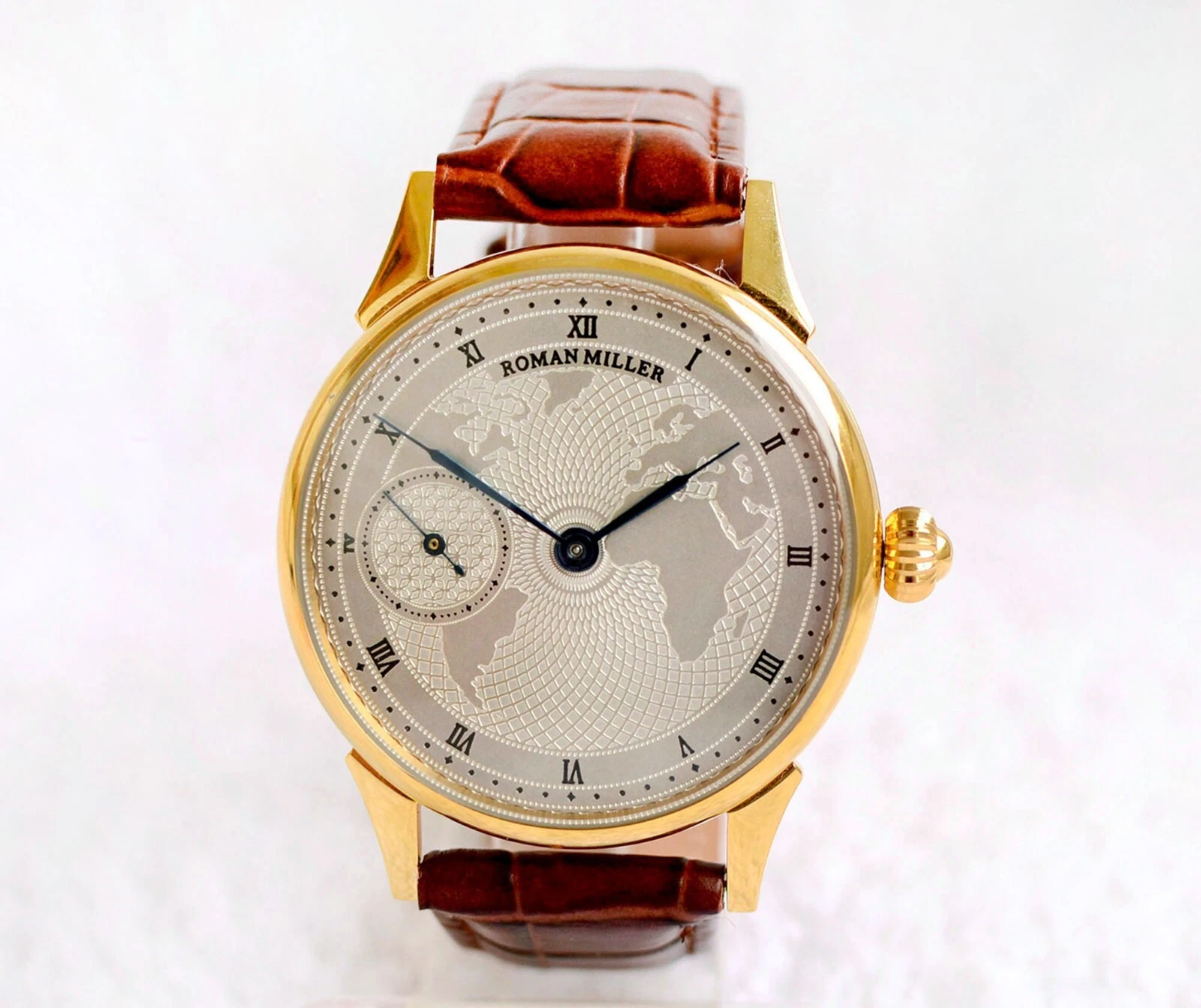 Luxury wrist watch Silver Guilloche dial WordMap Husband Gift Marriage watch
