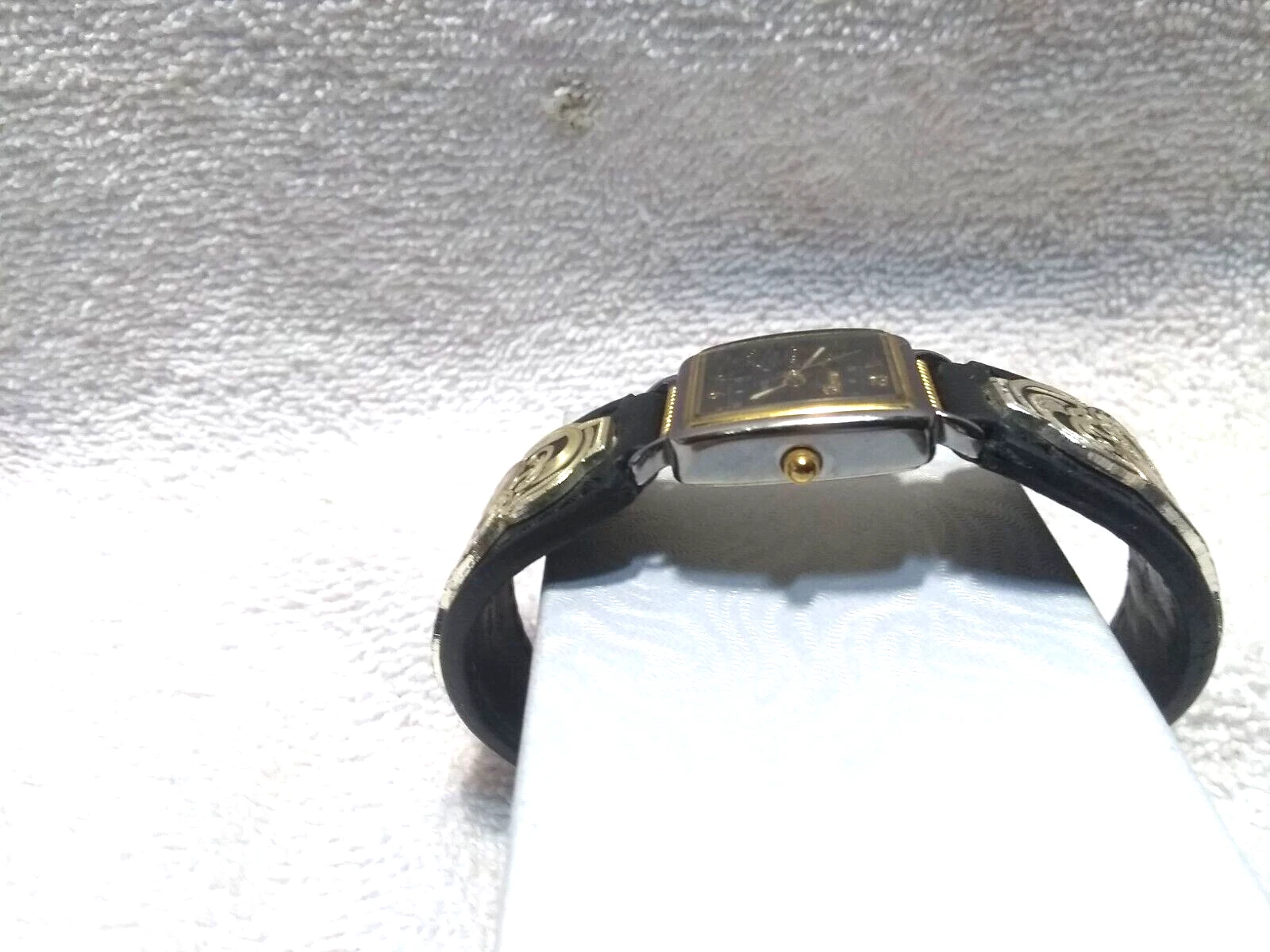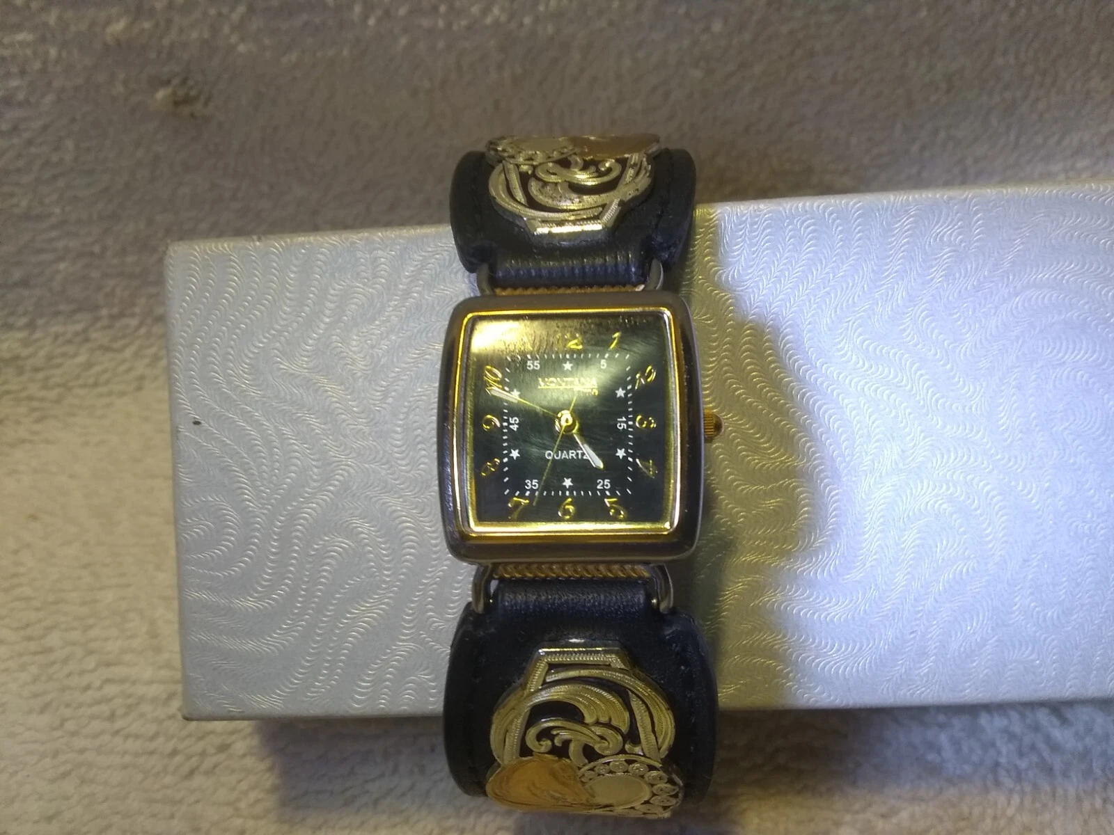 Montana Silversmiths Watch 1/2 Gold Silver Heart Black Leather Band New Bat EC