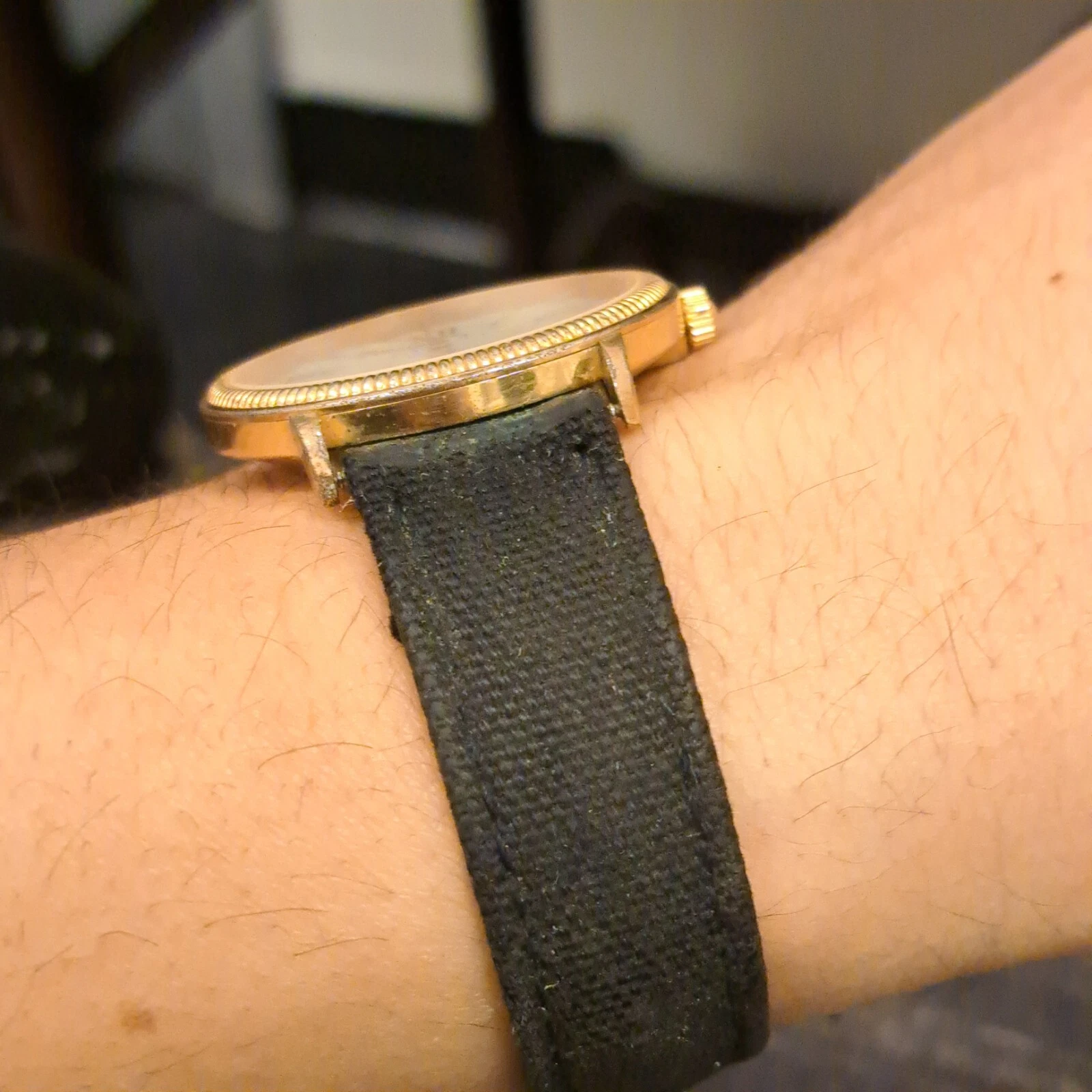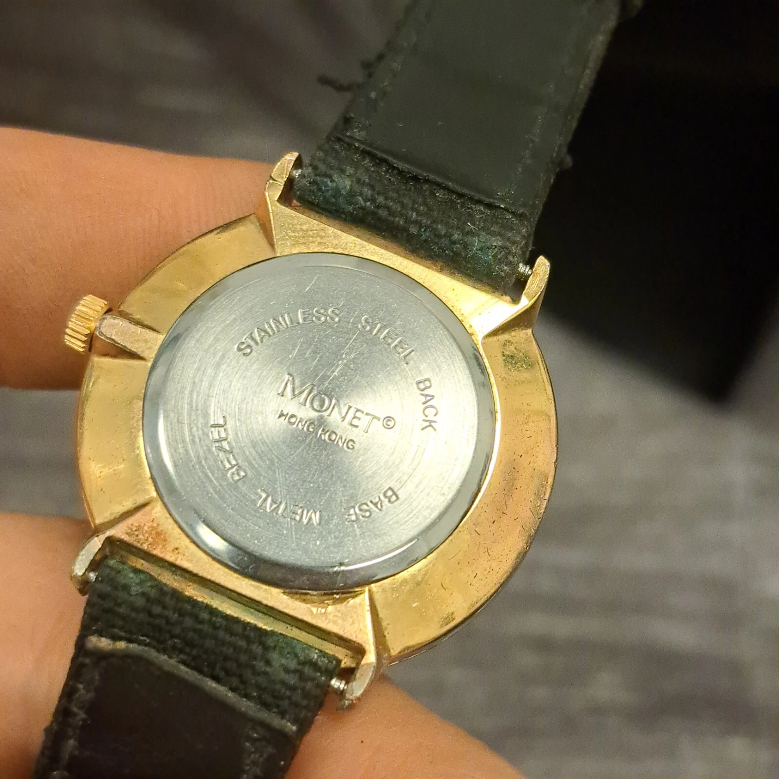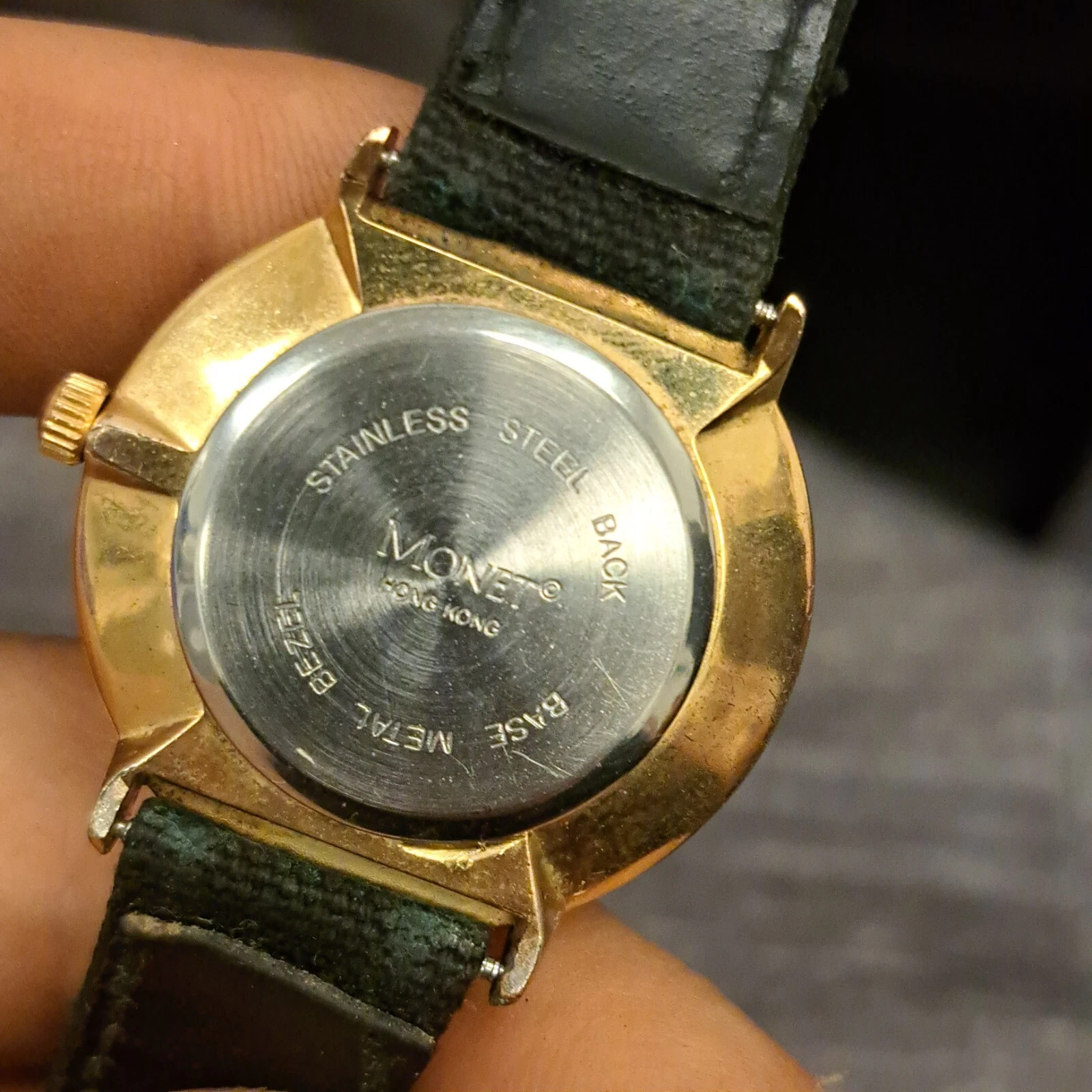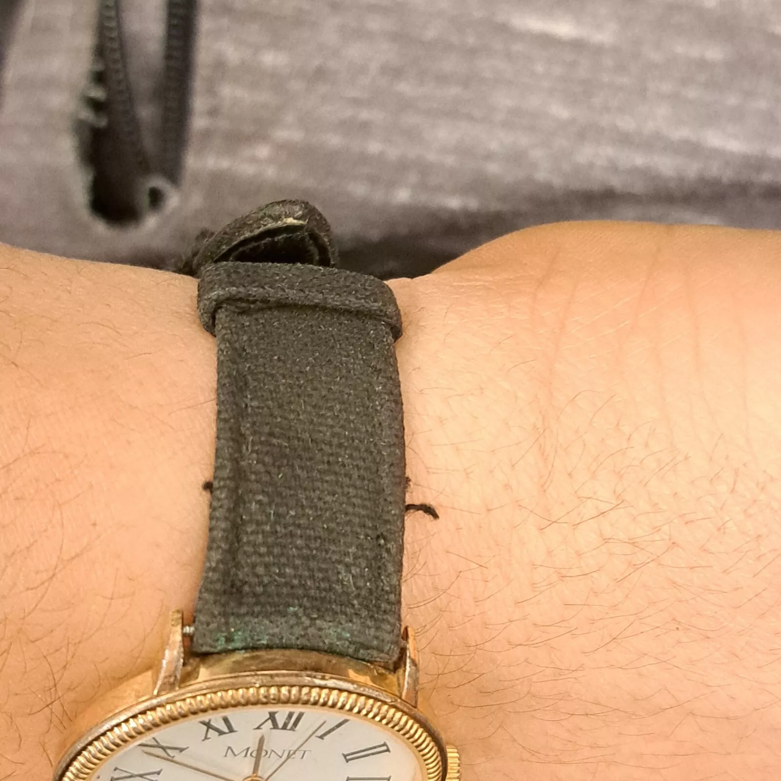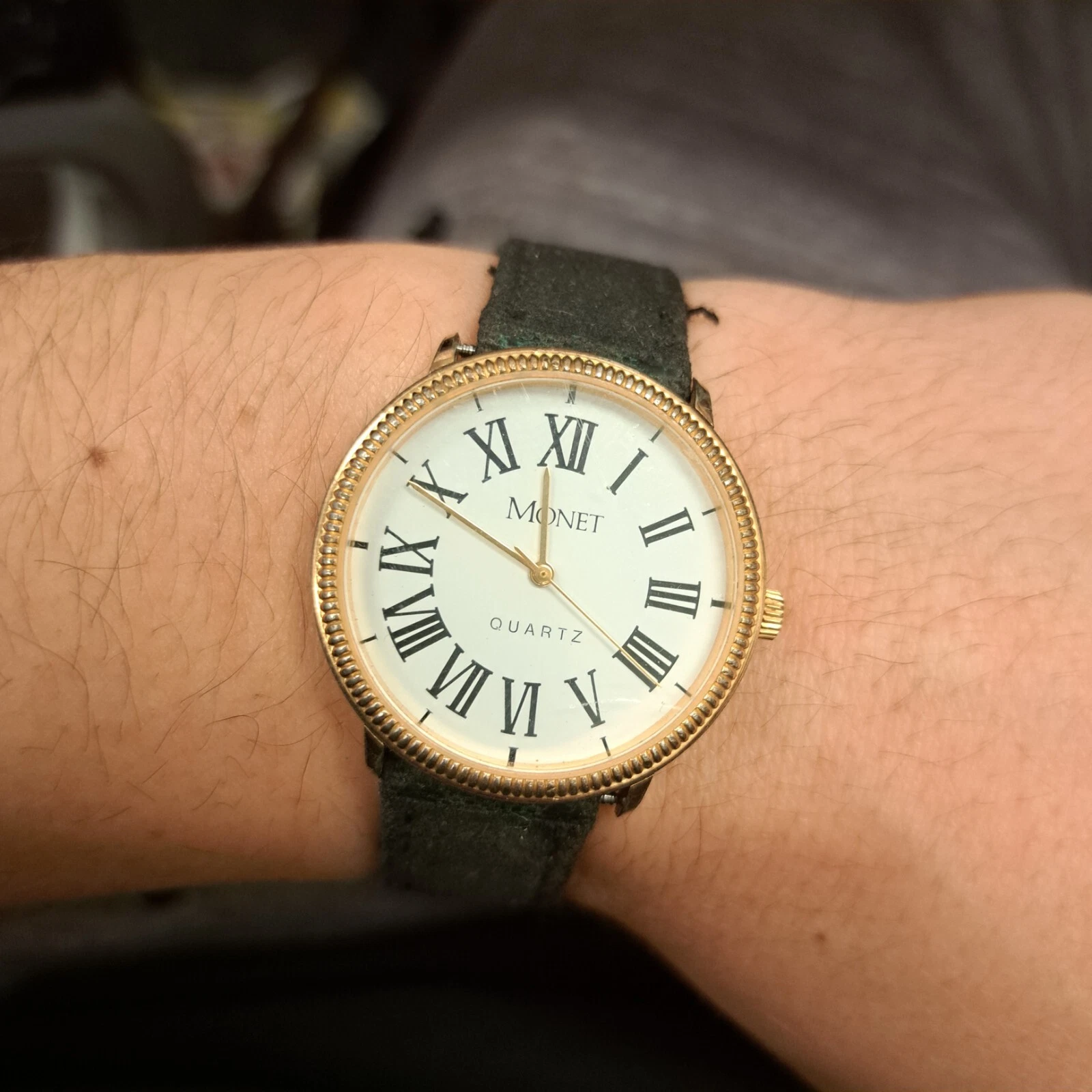 Monet Unisex Gold Tone Roman Numeral Quartz Black Buckle Band Analog Watch