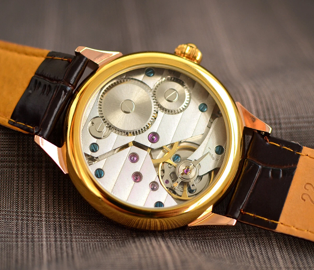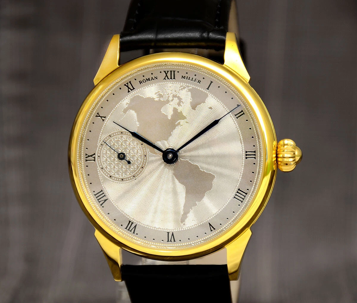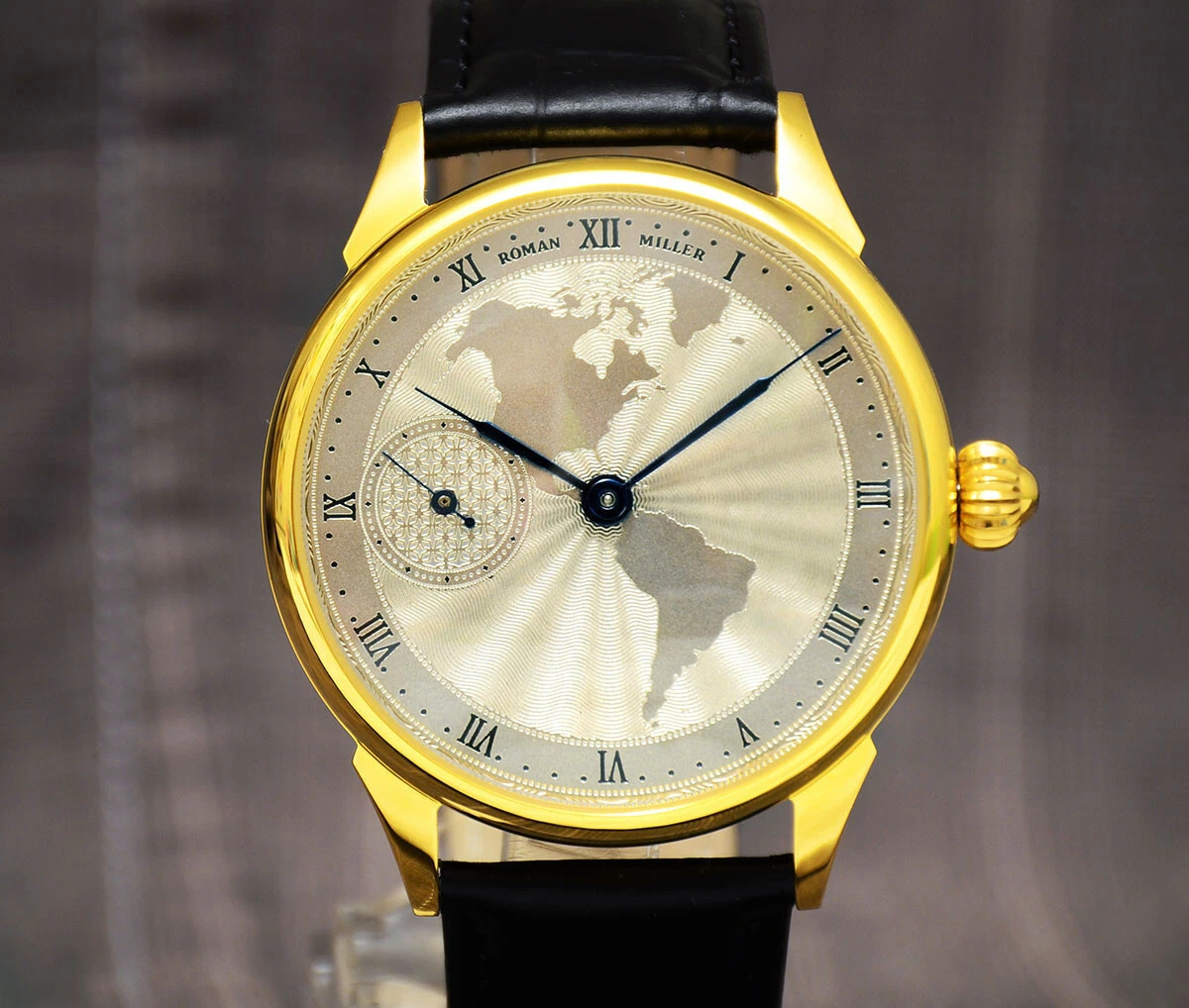Gold wrist watch Vintage America Guilloche Dial Boyfriend Gift Leather Strap BOX