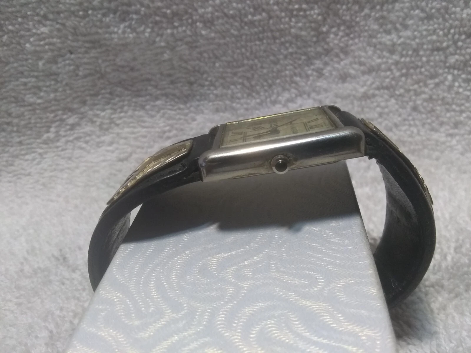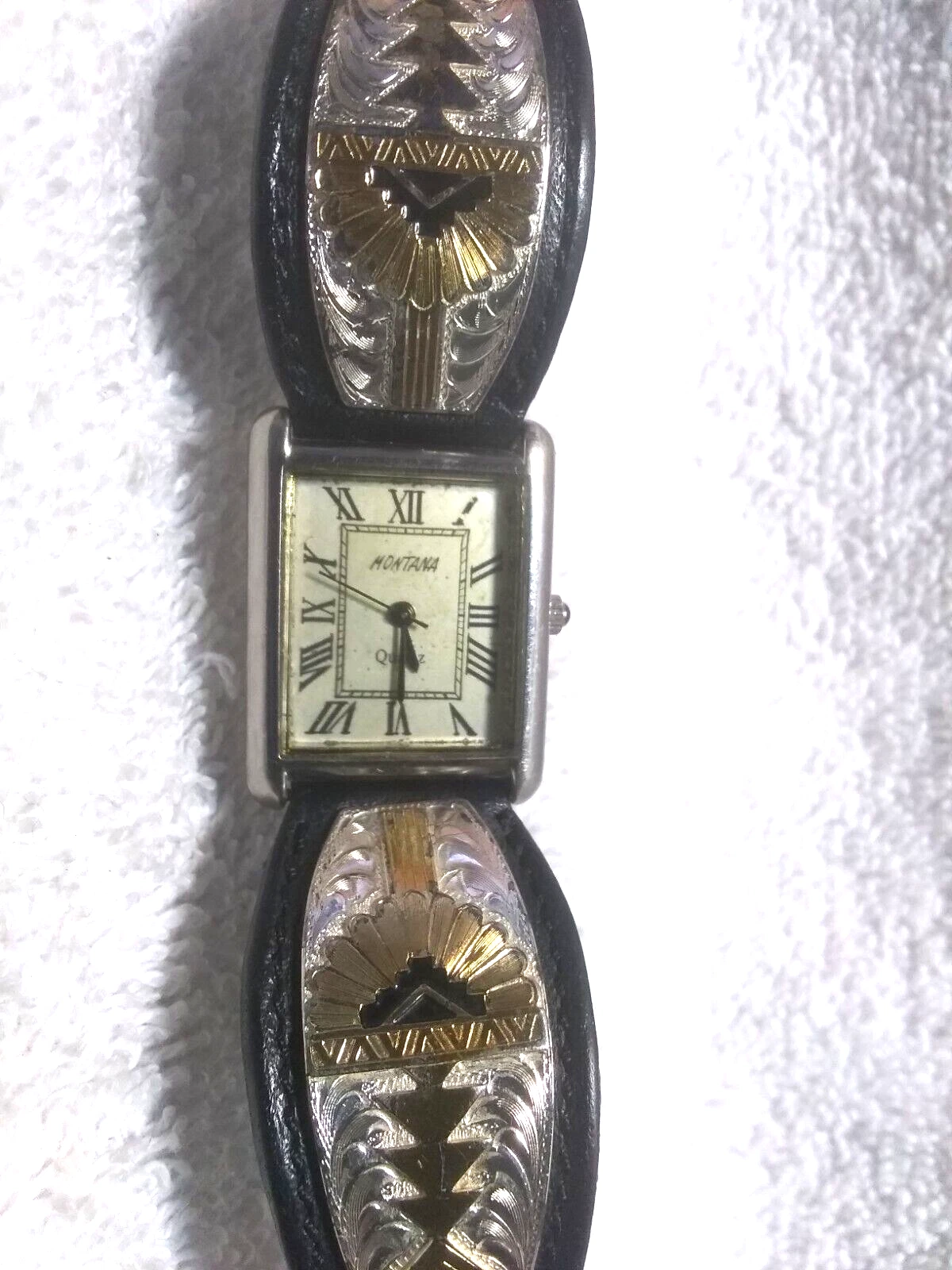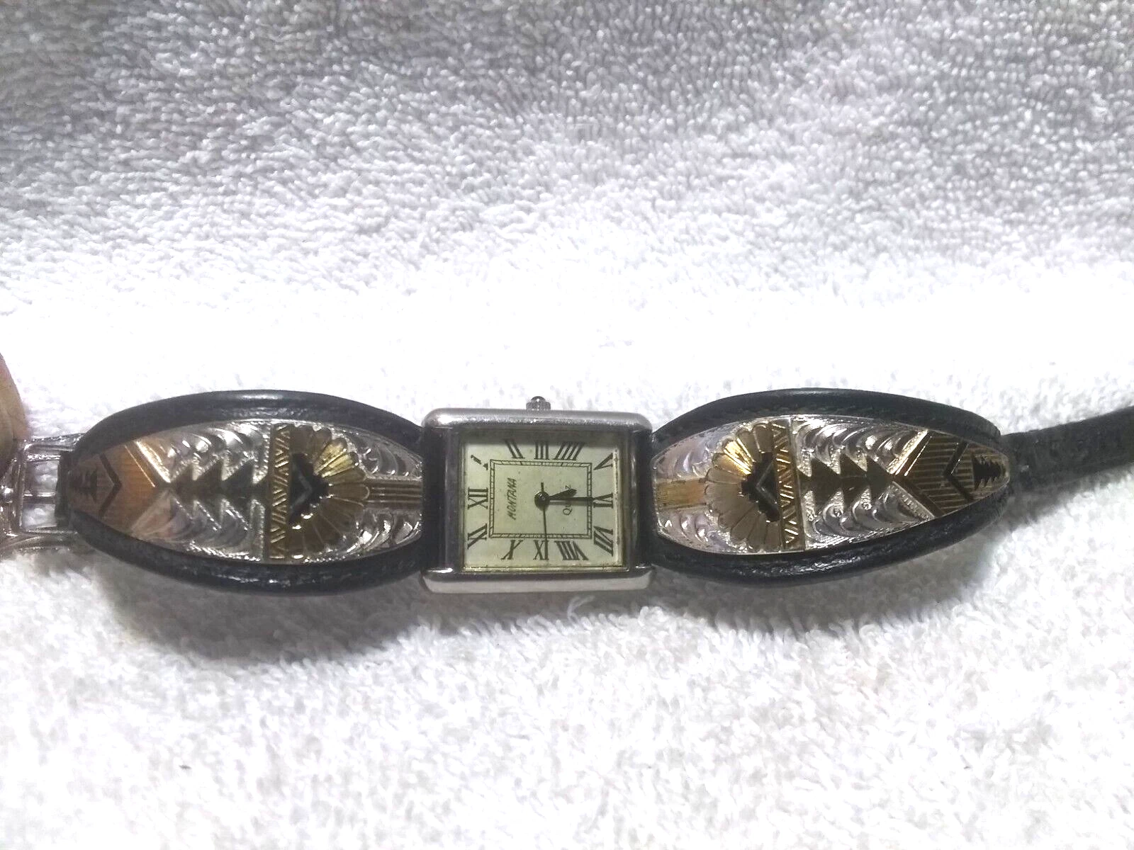 Montana Silversmiths Watch Aztec Silver Gold Black Leather New Bat Great Shape 9