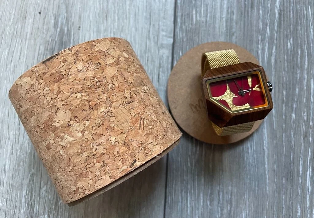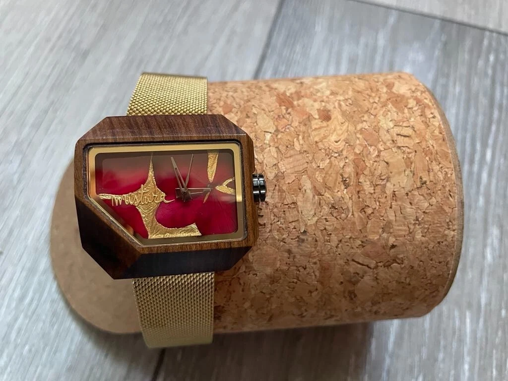 Mistura Juno Handmade Wooden Watch – Real Hydrangea Flowers, Gold Mesh Band