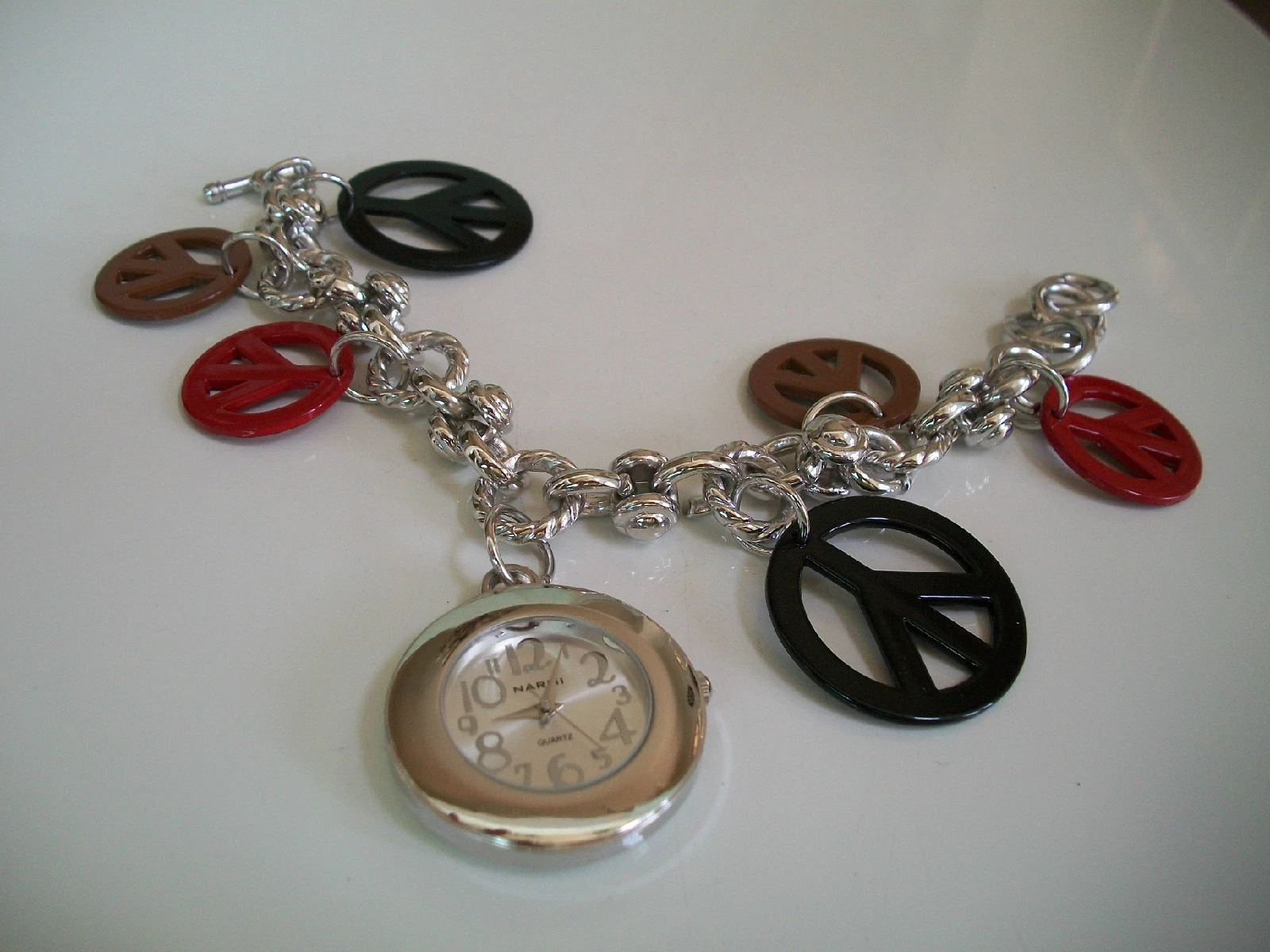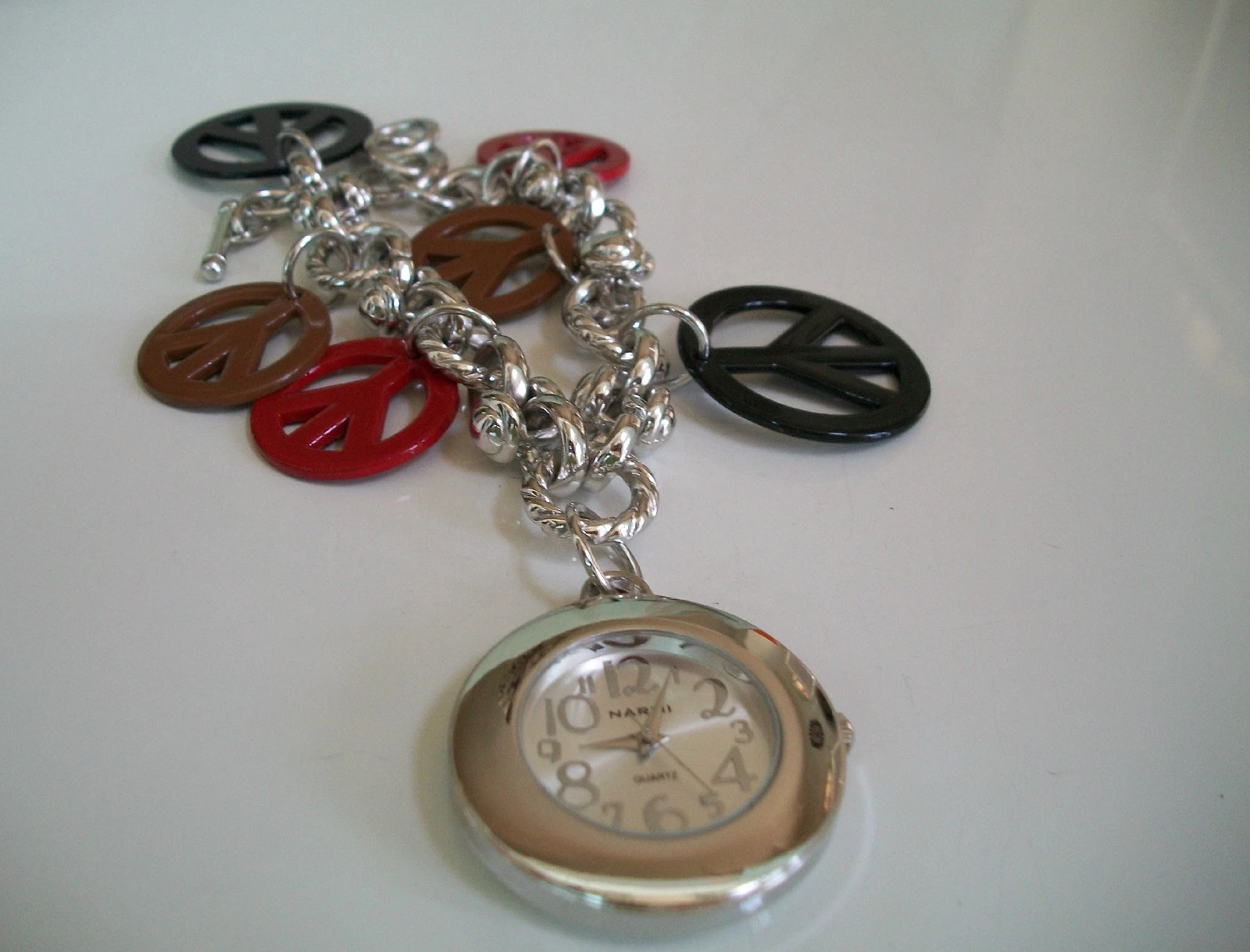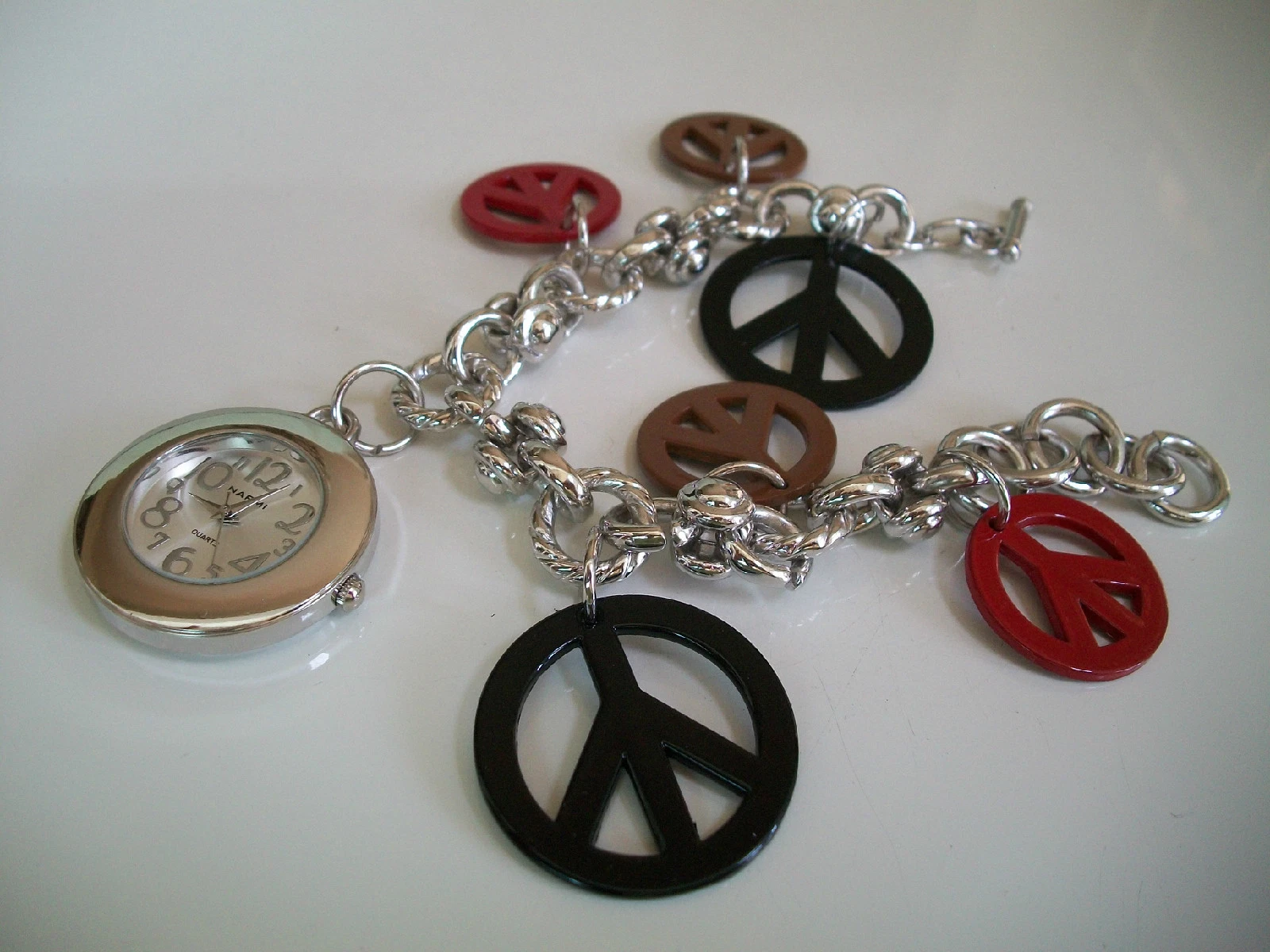 WOMEN'S SILVER FINISH RED,BLACK & BROWN PEACE SIGN DANGLING CHARM FASHION WATCH
