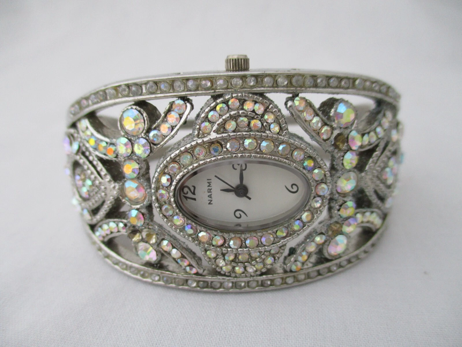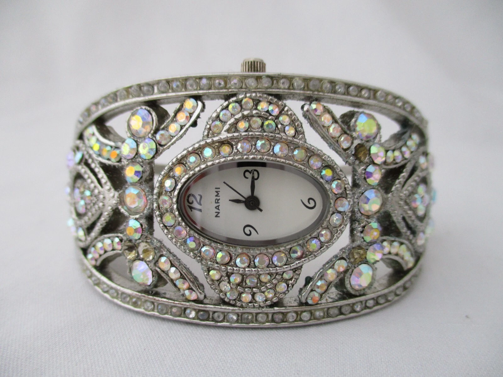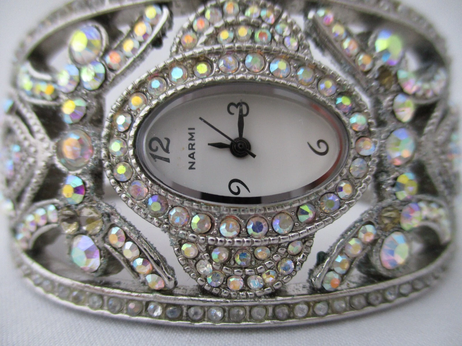 Narmi Women's Analog Watch Silver Toned Cuff Band Rhinestones