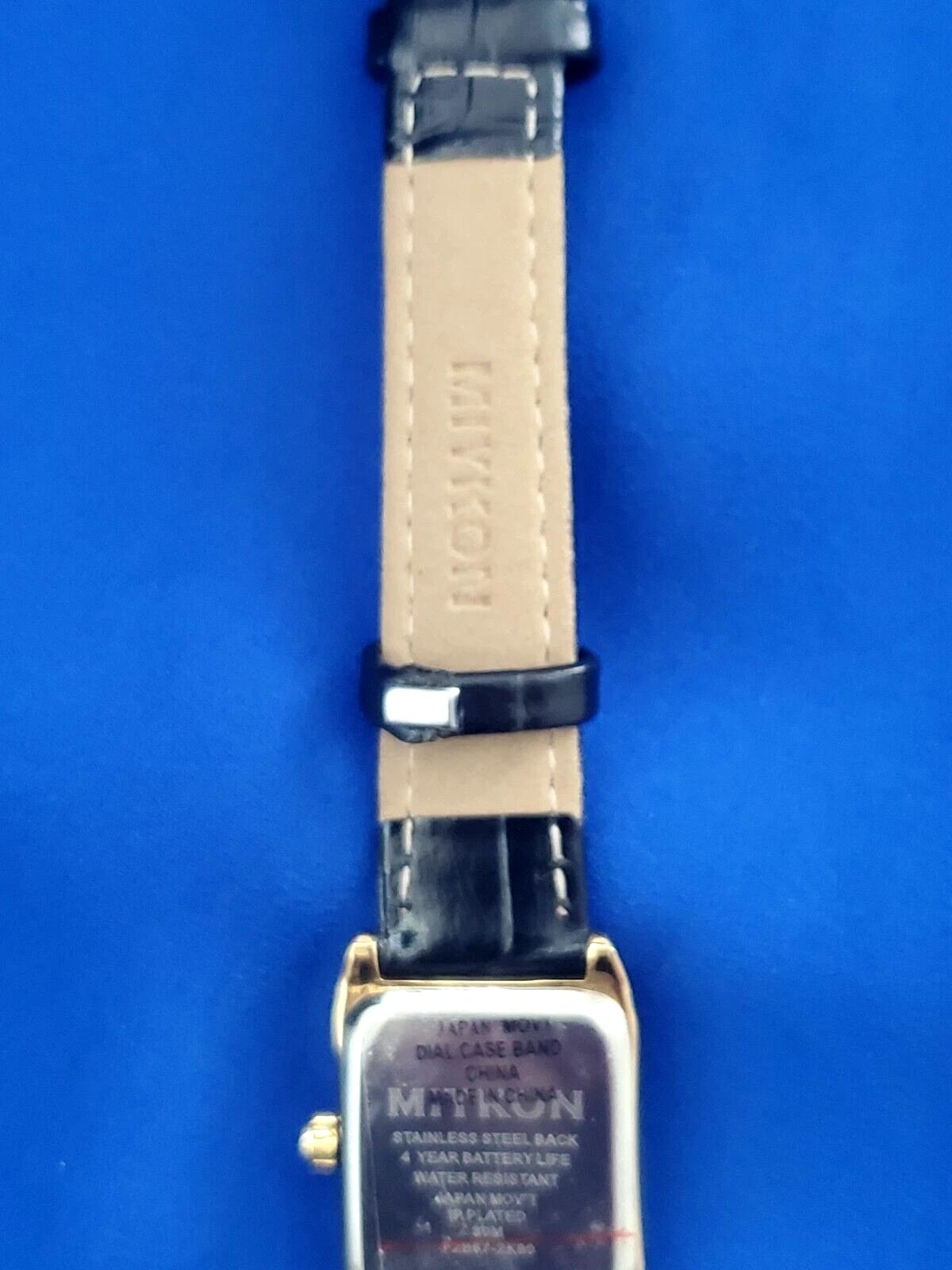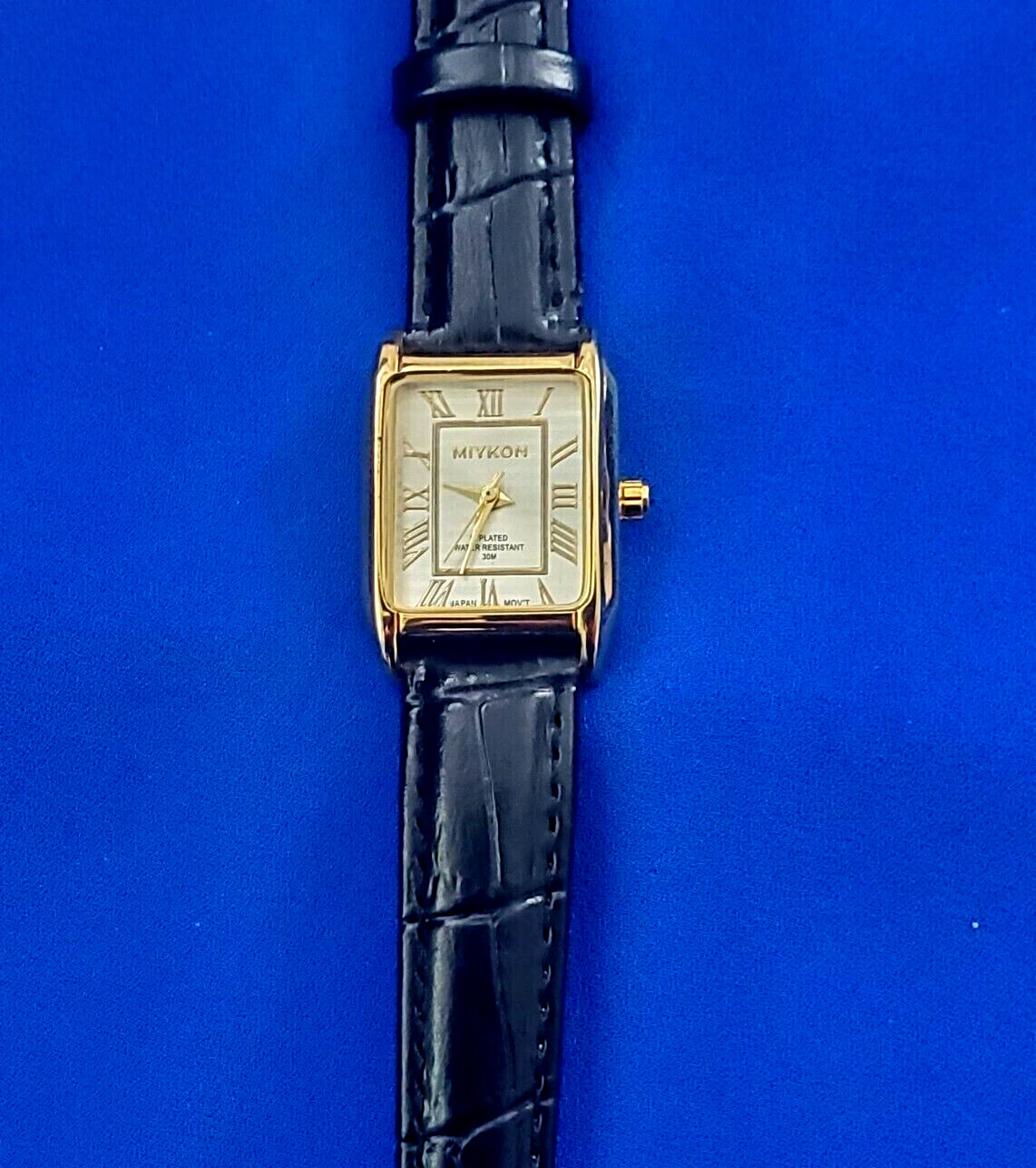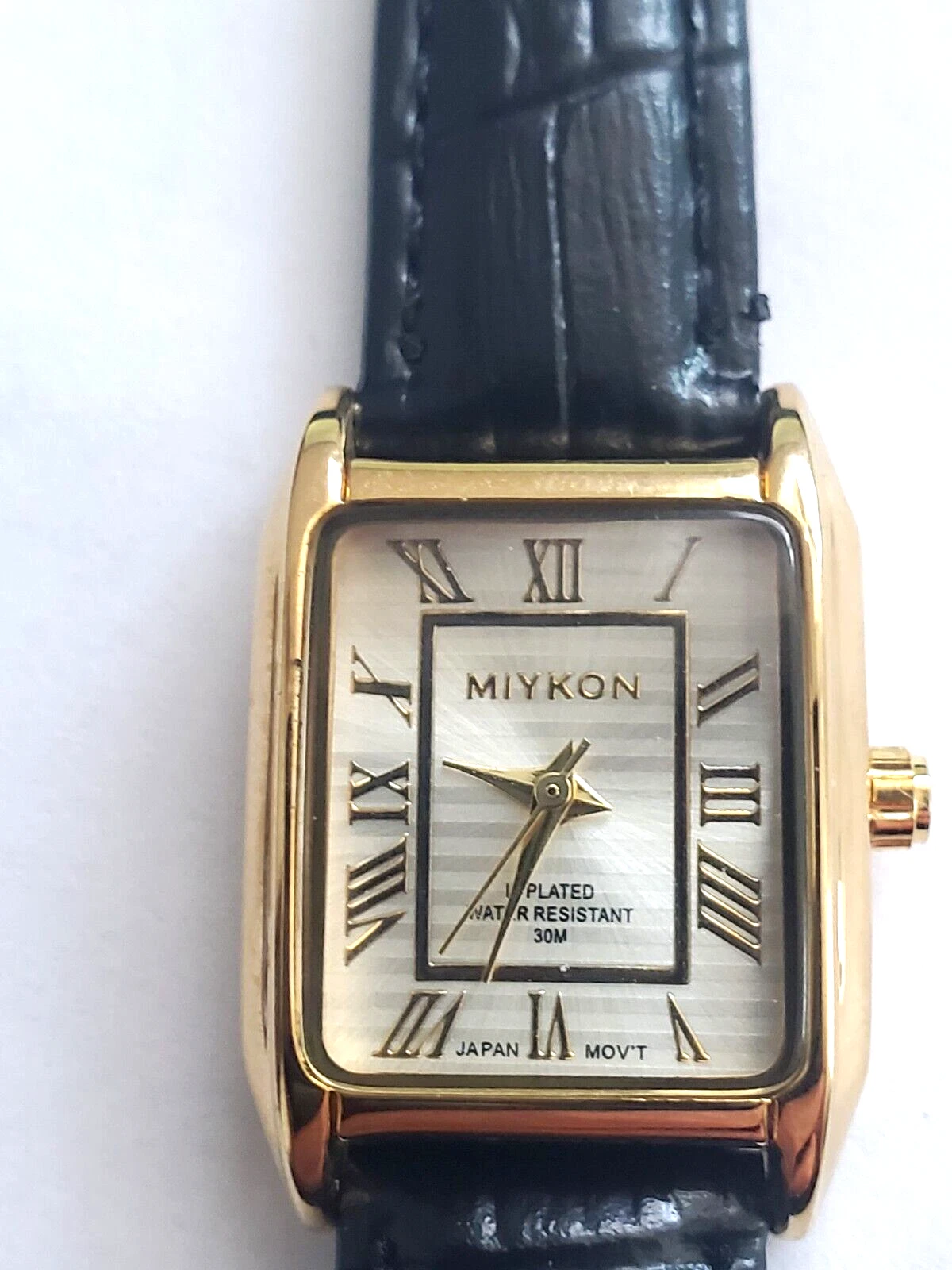Miykon Woman watch rectangle IP plated black leather, seal on back, new battery