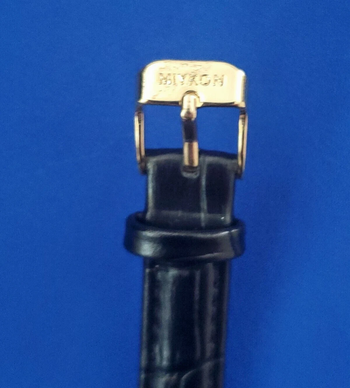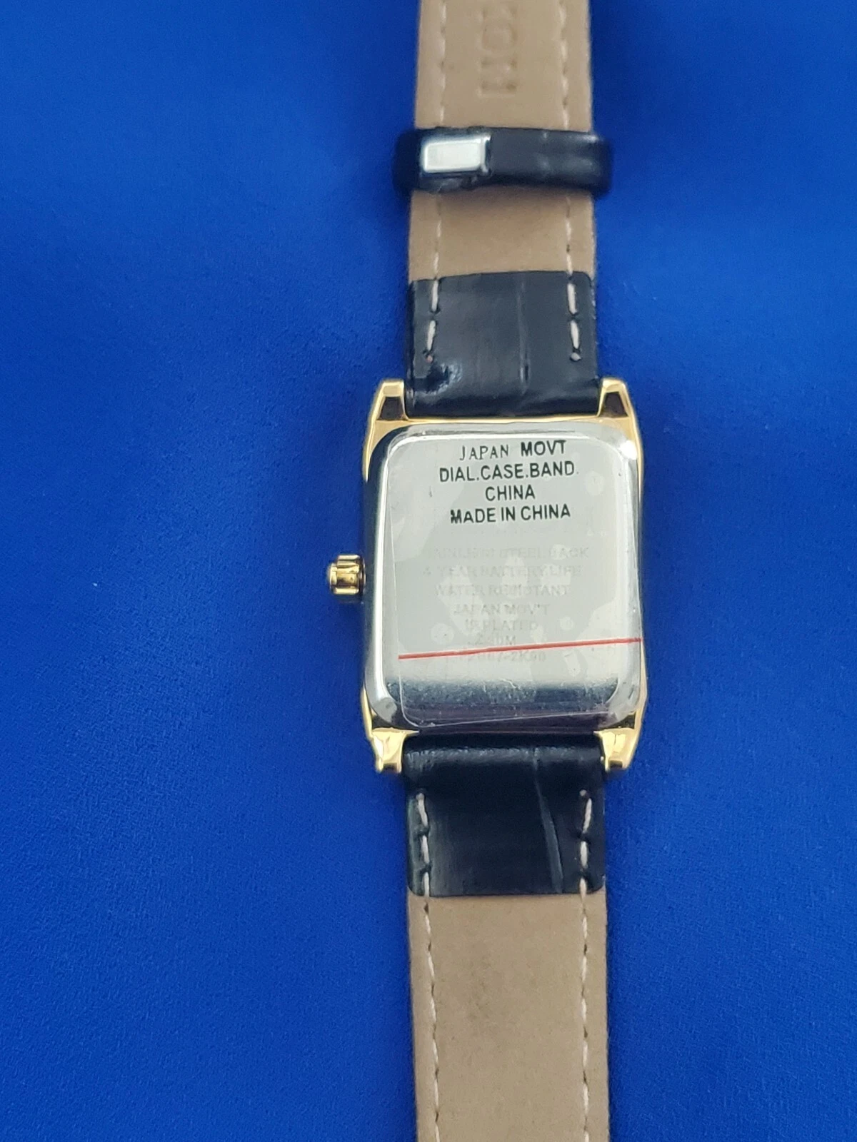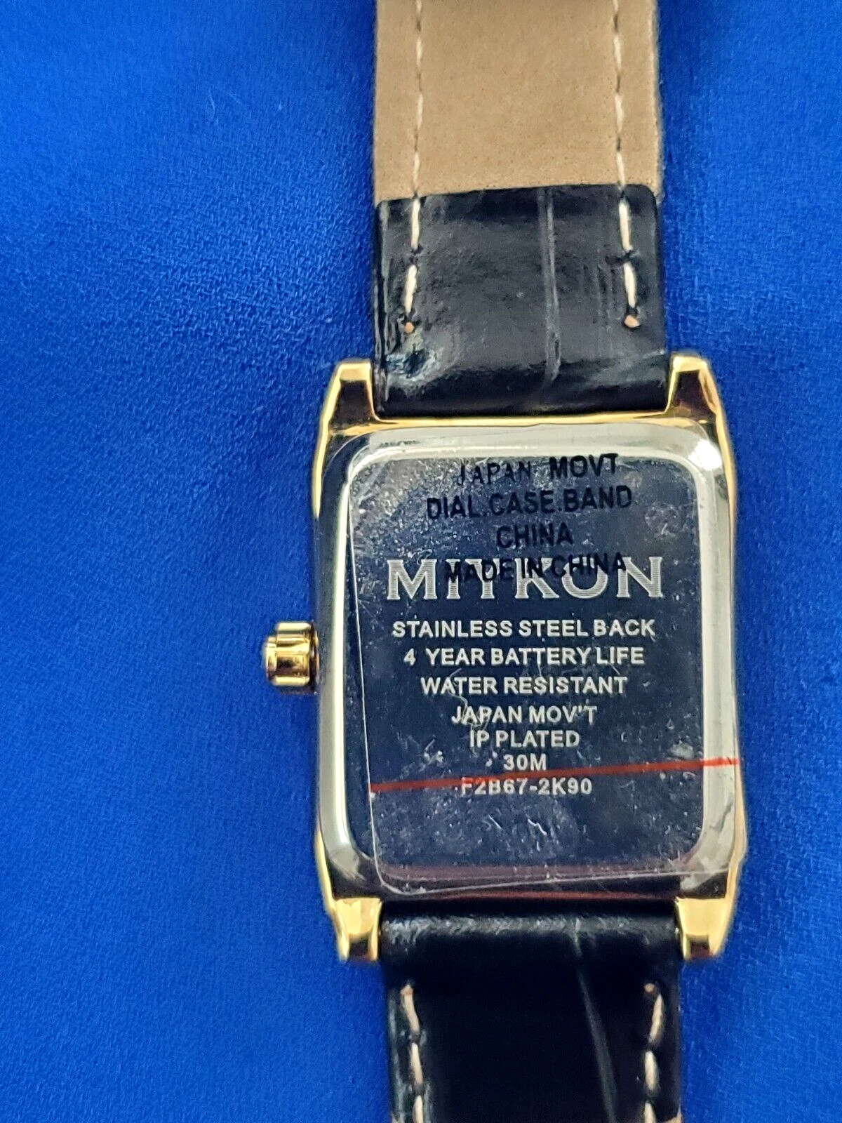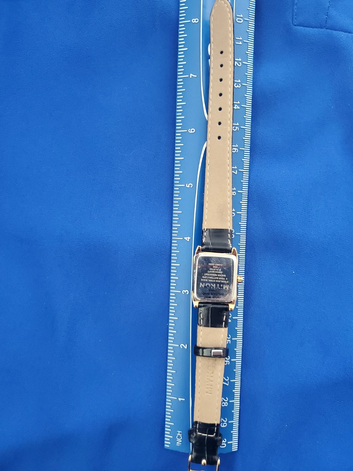Miykon Woman watch rectangle IP plated black leather, seal on back, new battery