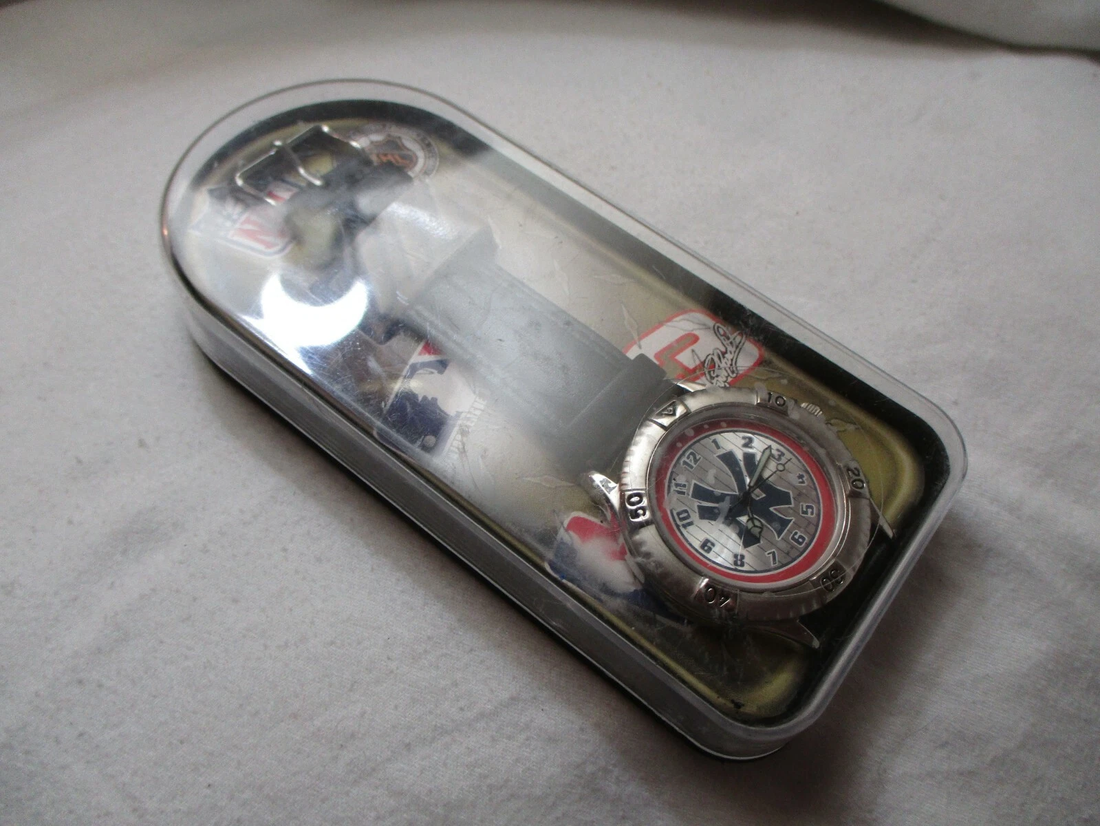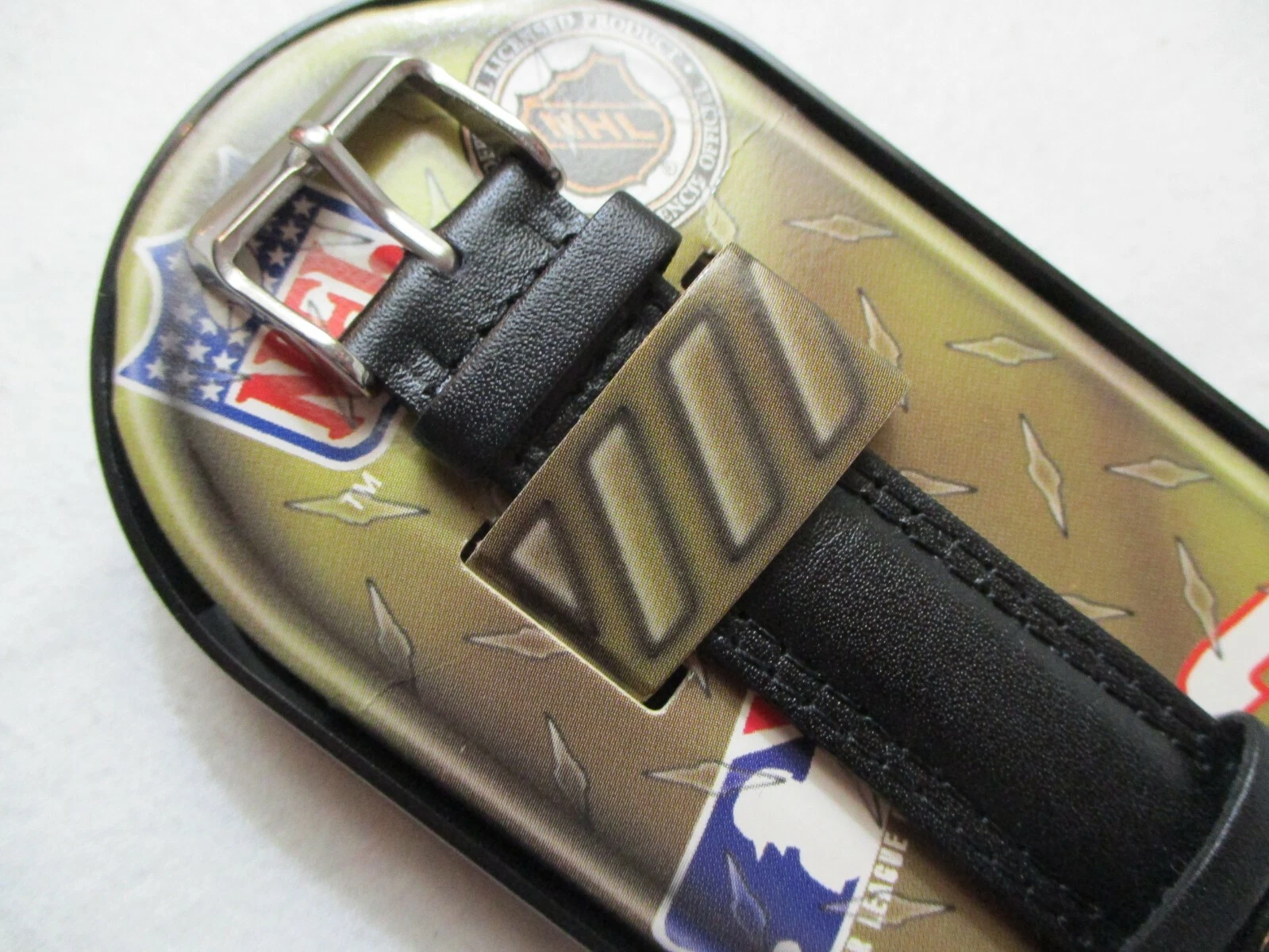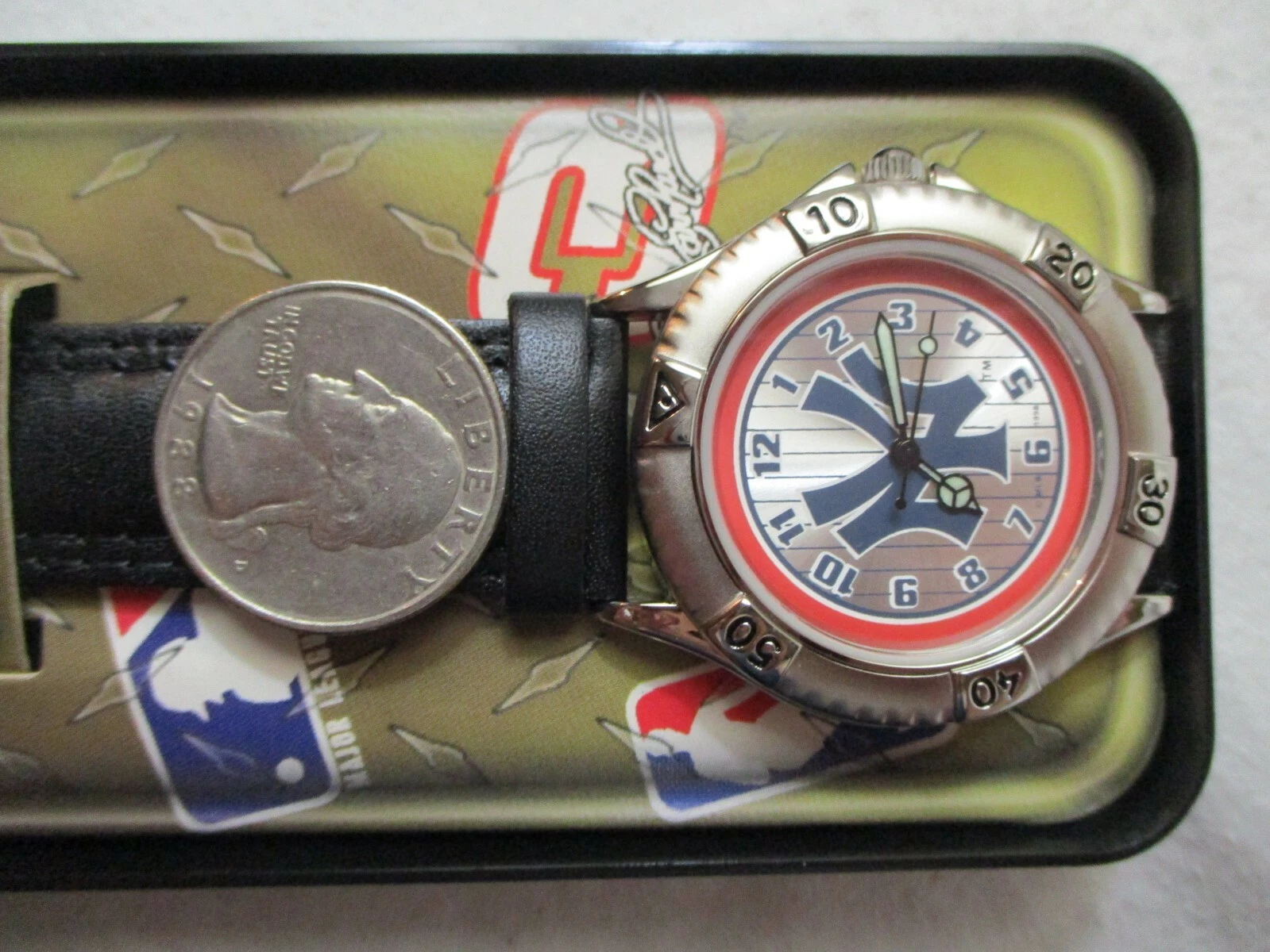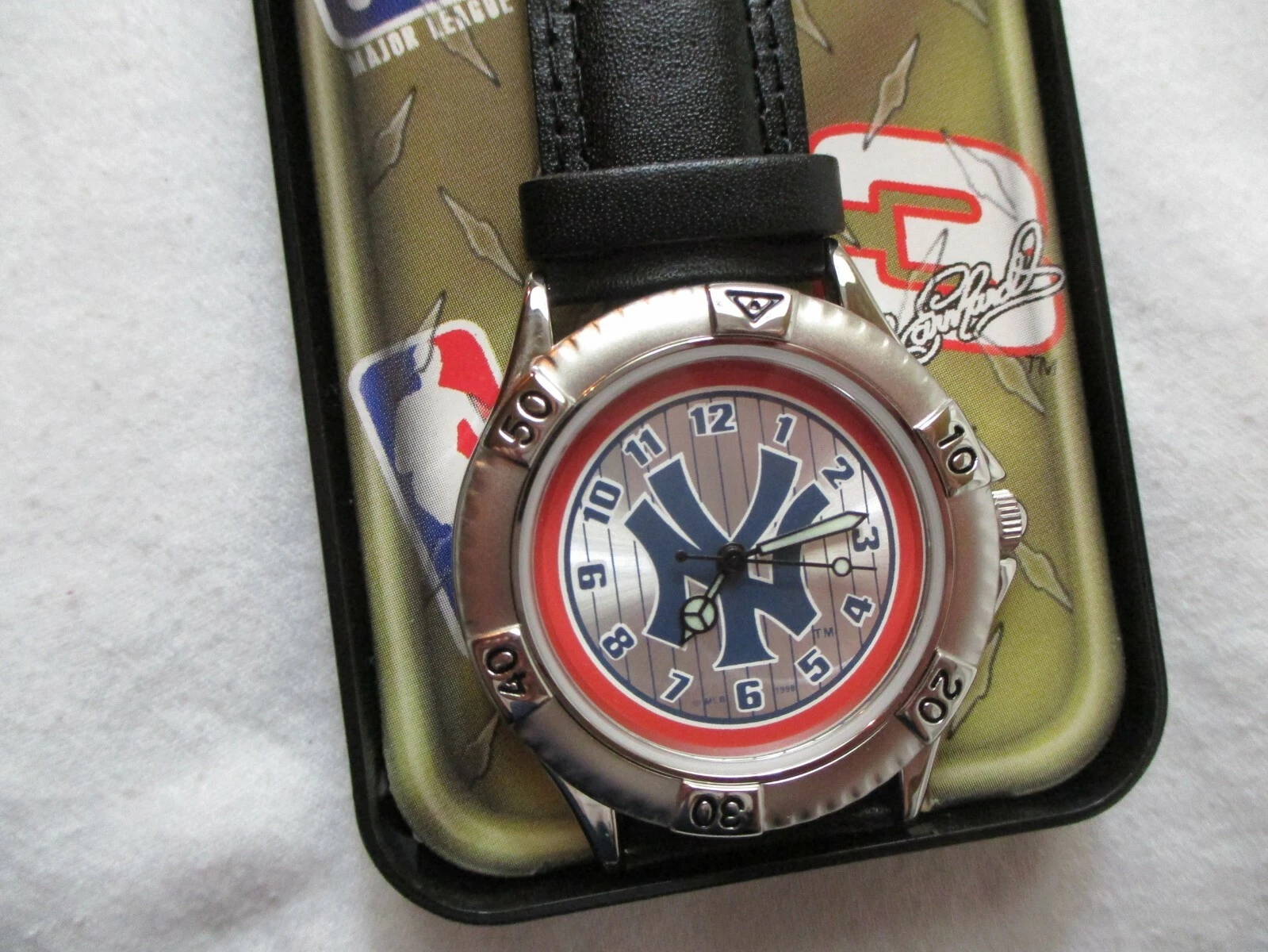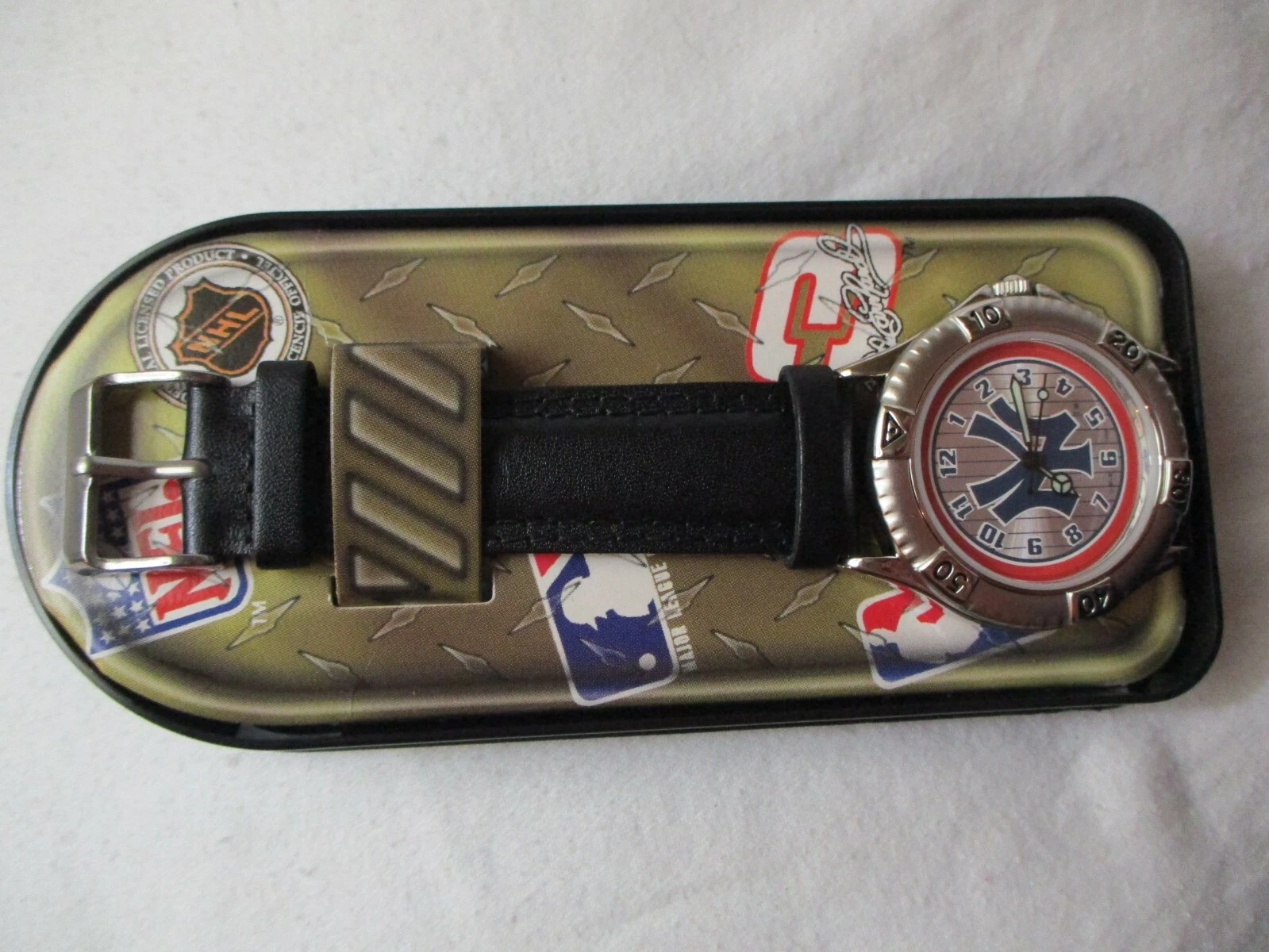NFL Yankees Wristwatch Black Leather Buckle Band Silver Tone Round Face