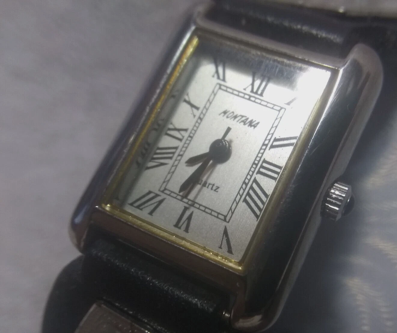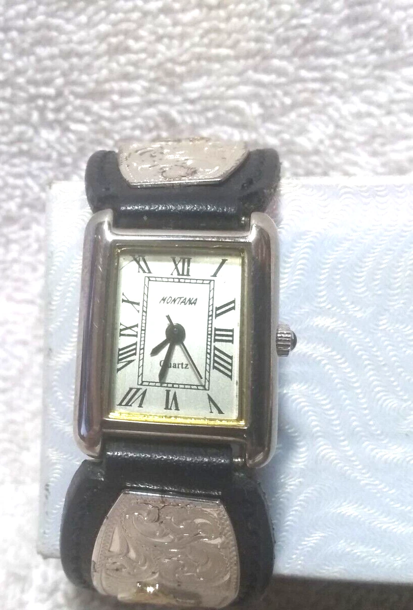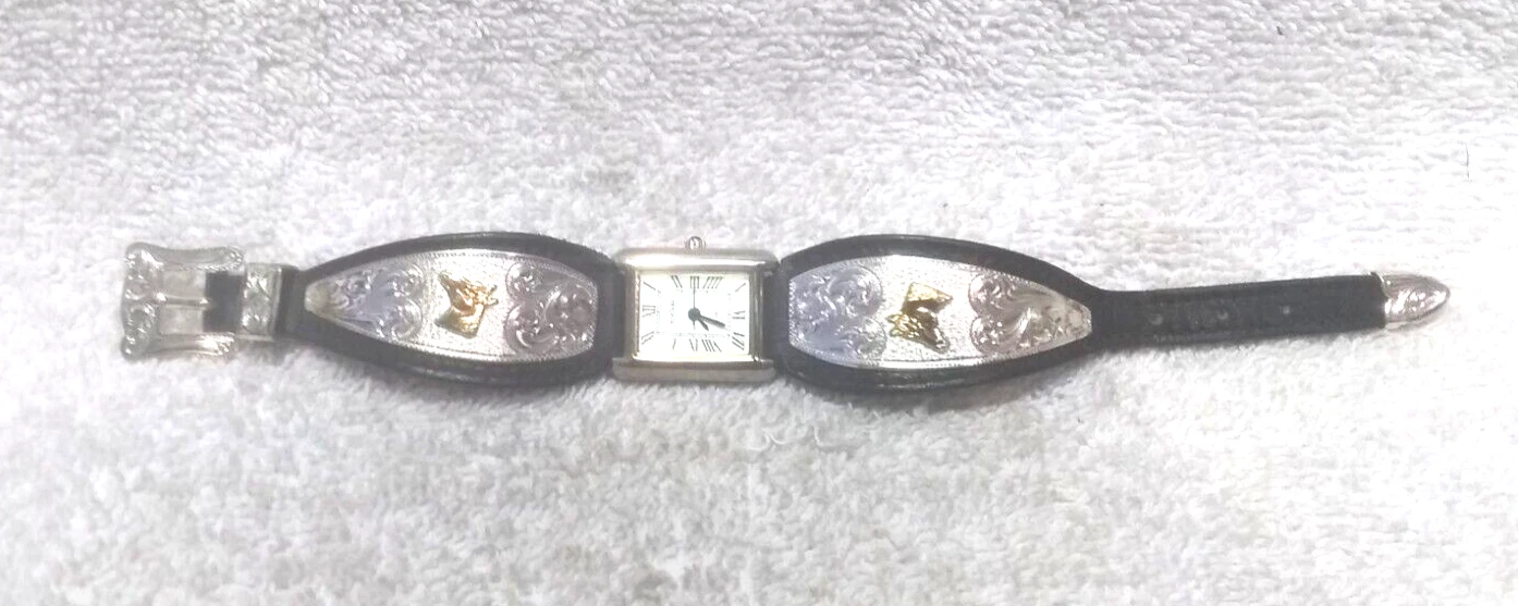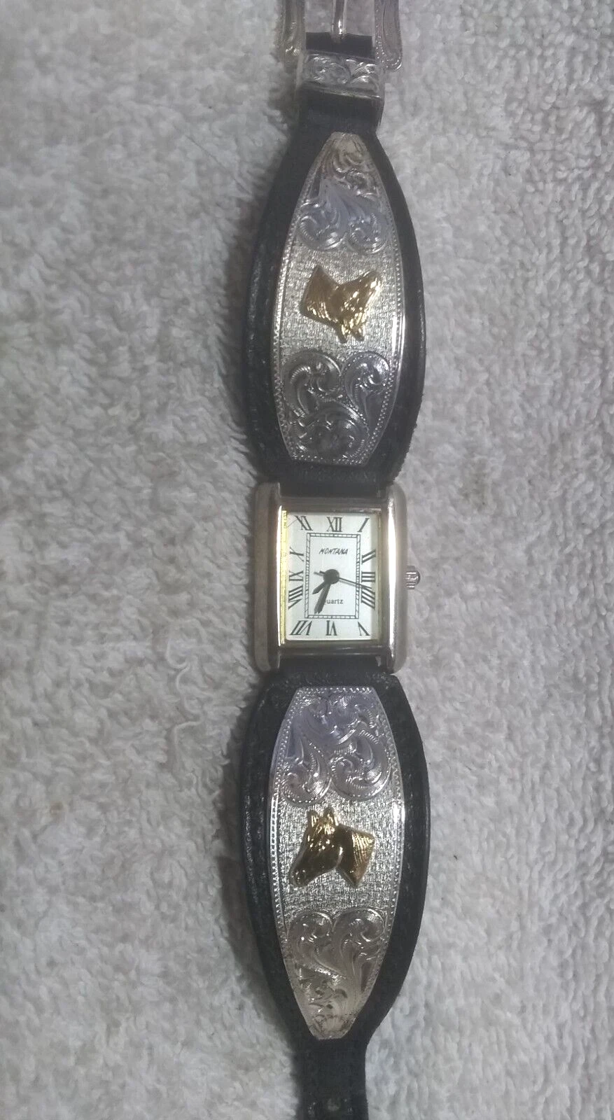 Montana Silversmiths Watch Women Silver Engraved Gold Horse Black New Bat Nice !