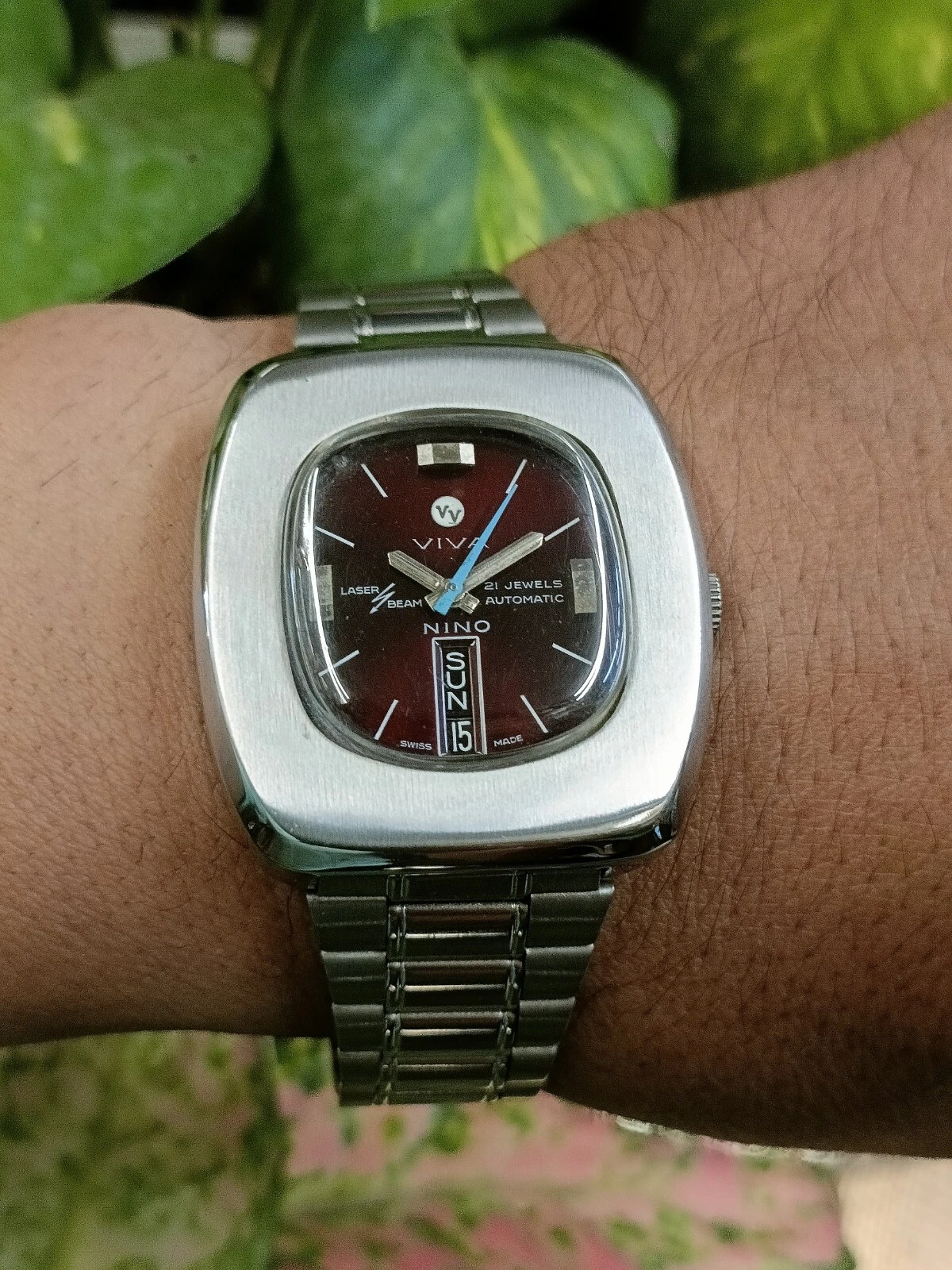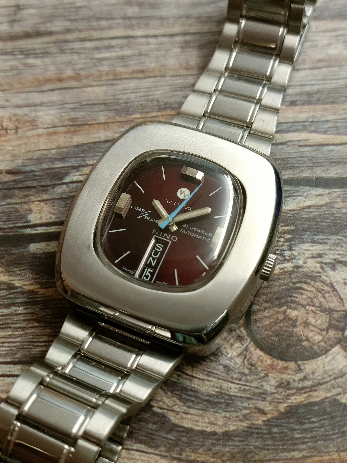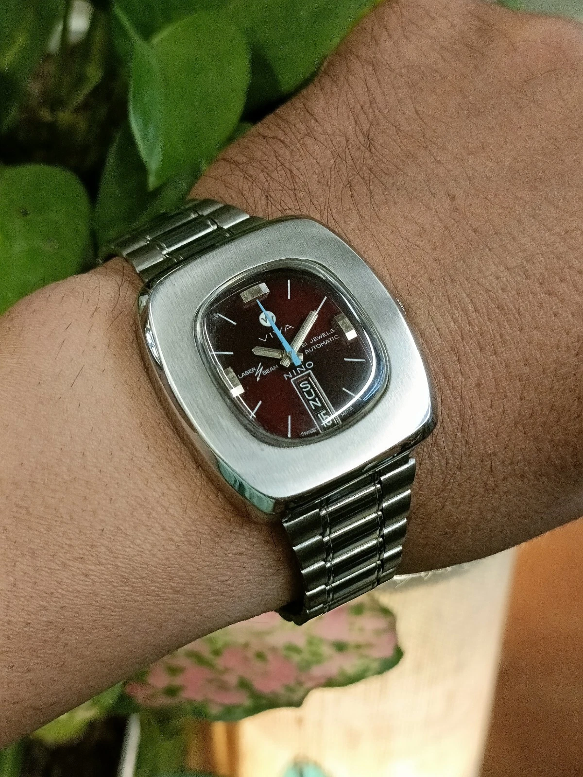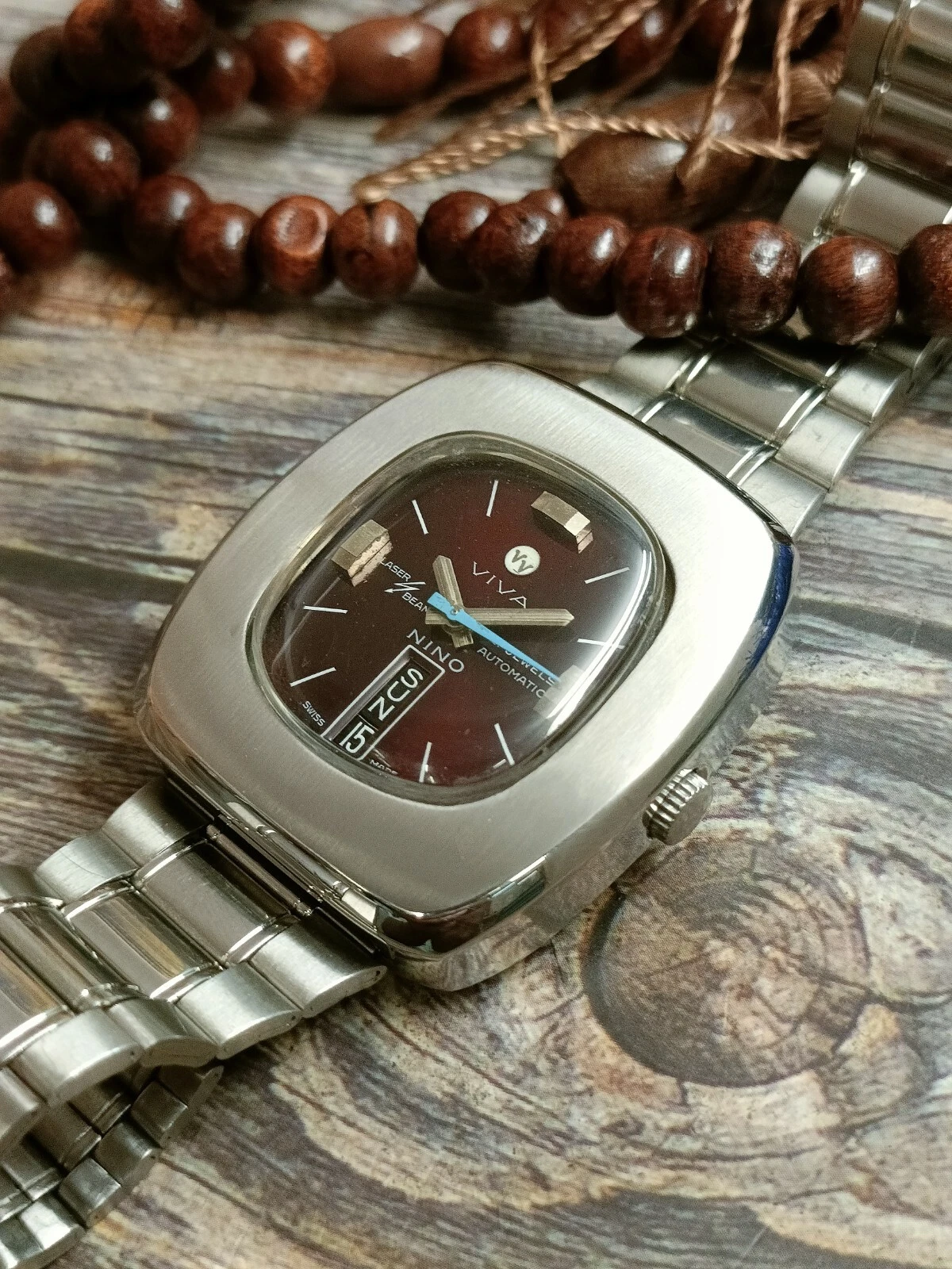 AUTHENTIC NINO VIVA LASER BEAM SWISS AUTOMATIC MENS MINT WINE DIAL VINTAGE WATCH