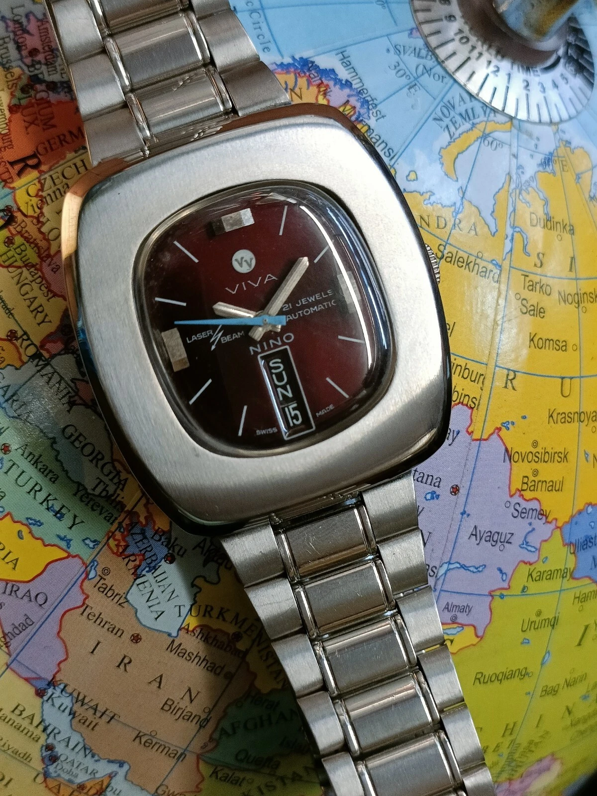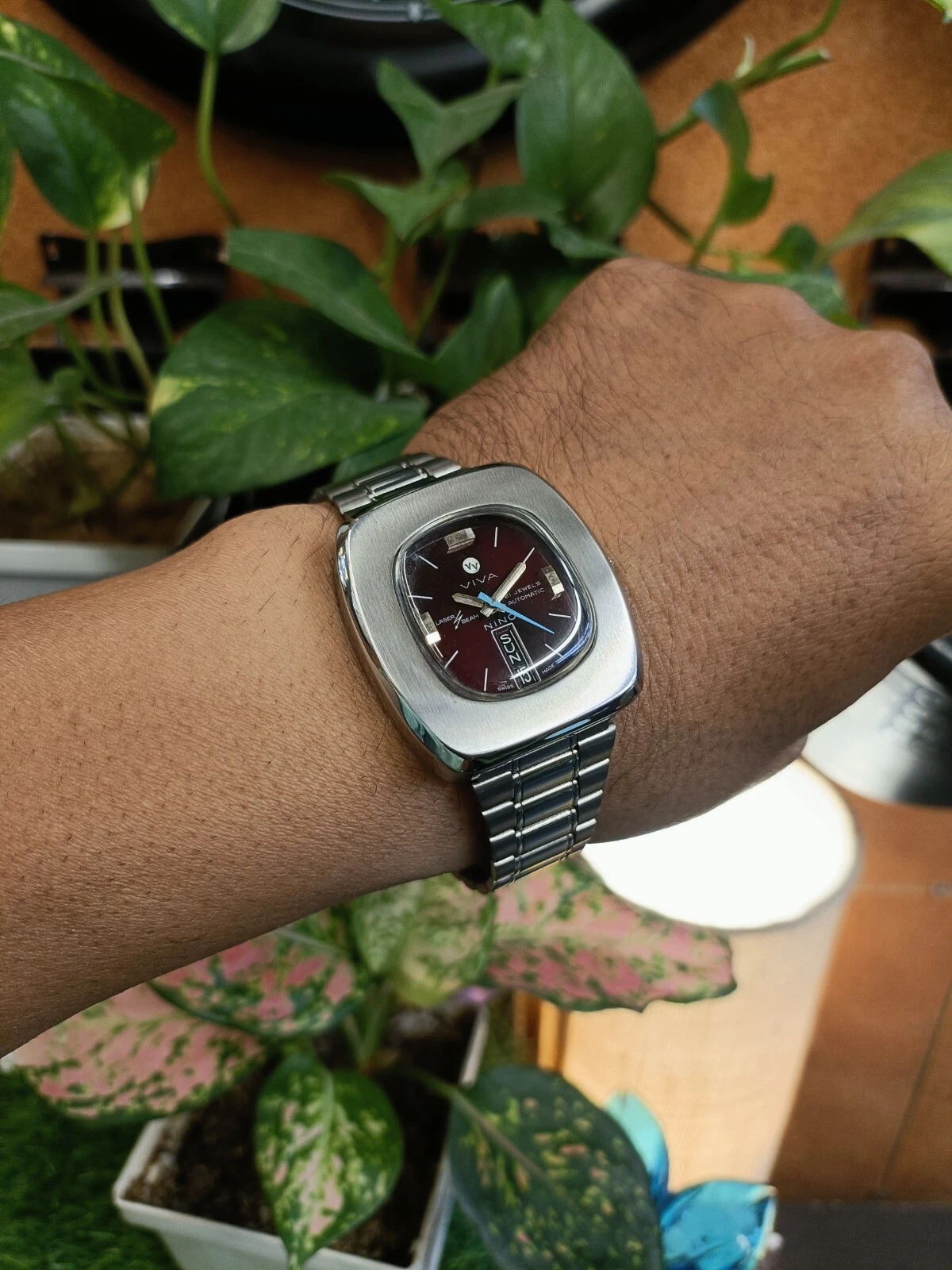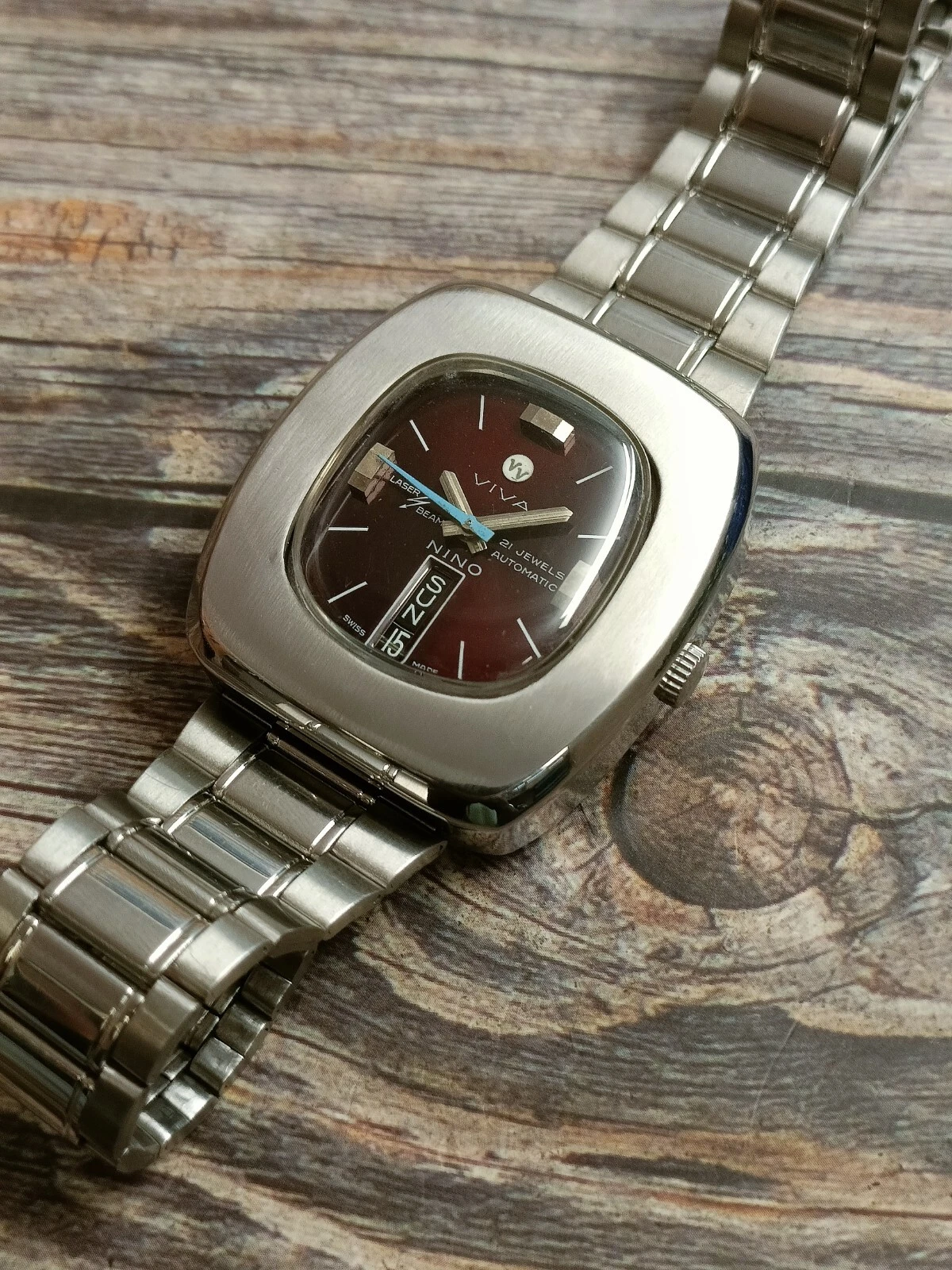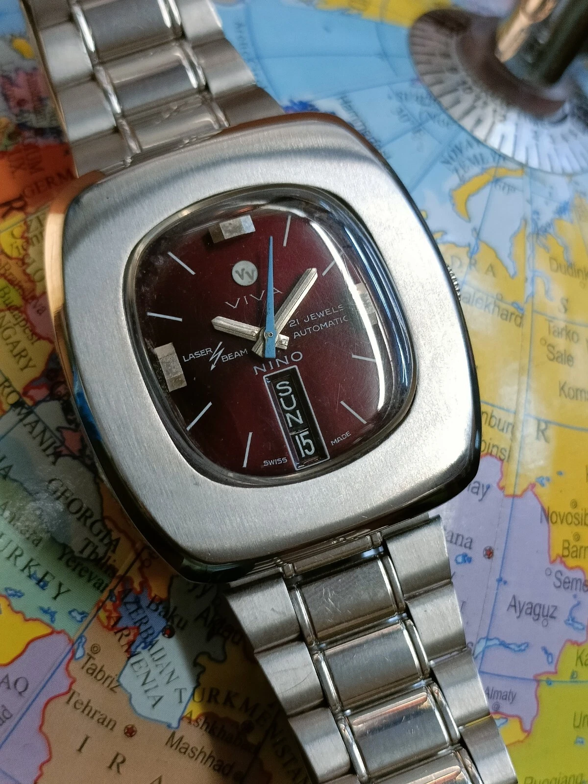 AUTHENTIC NINO VIVA LASER BEAM SWISS AUTOMATIC MENS MINT WINE DIAL VINTAGE WATCH