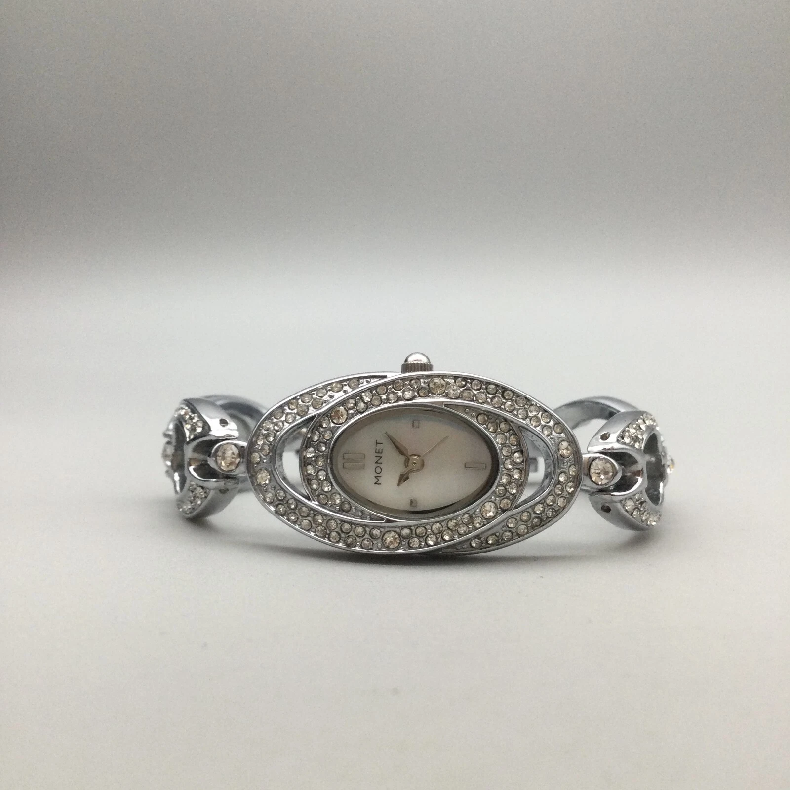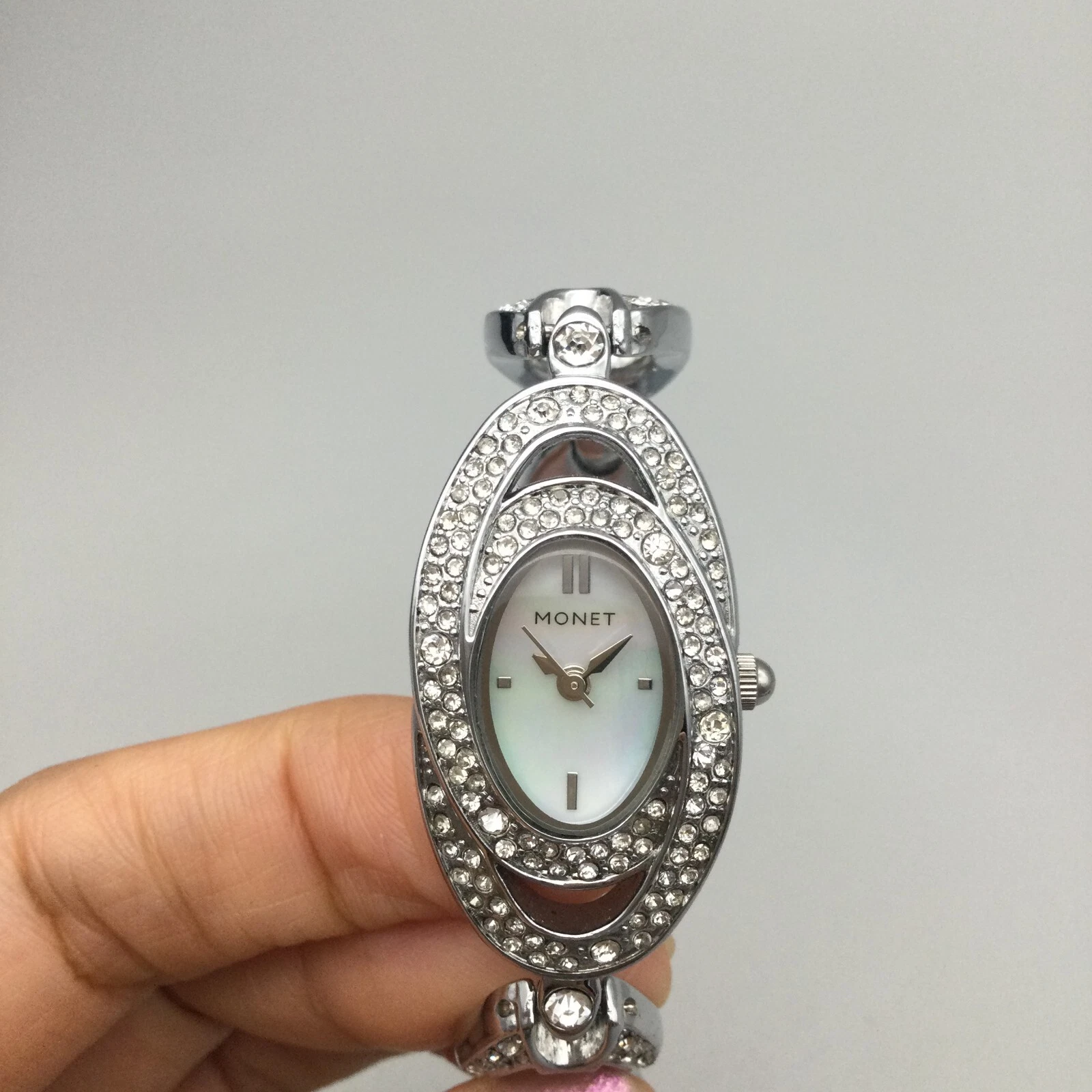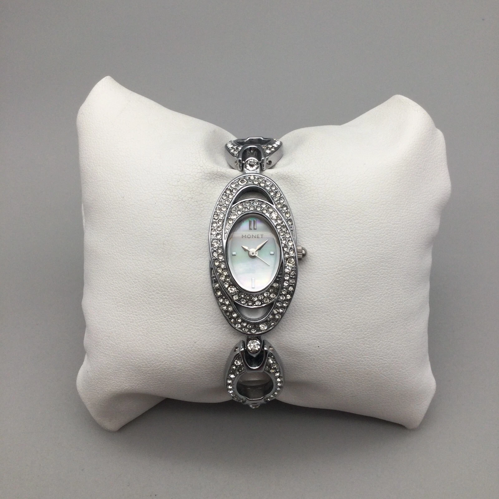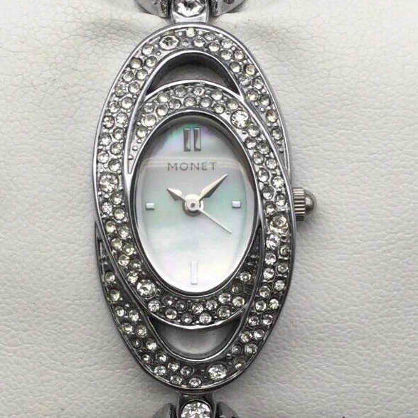 Monet Watch Women 20mm Silver Tone Oval MOP Dial Bracelet New Battery 6.75"
