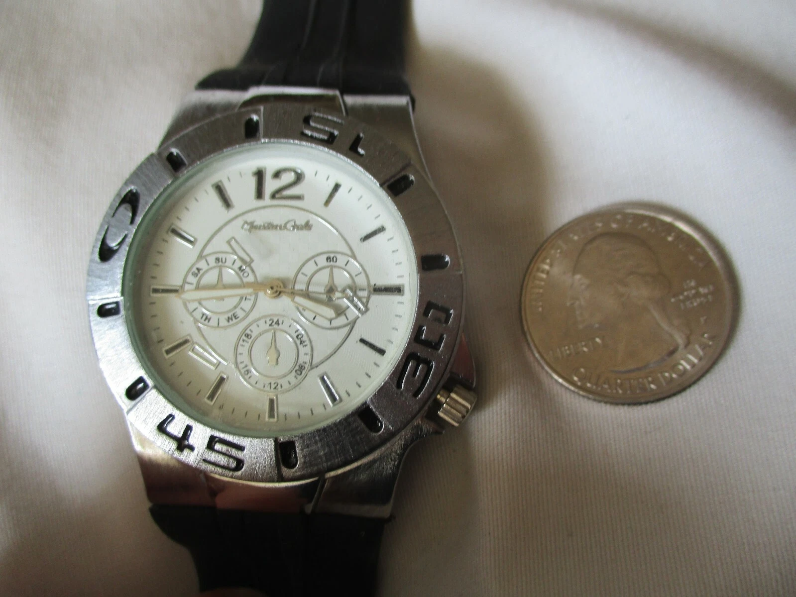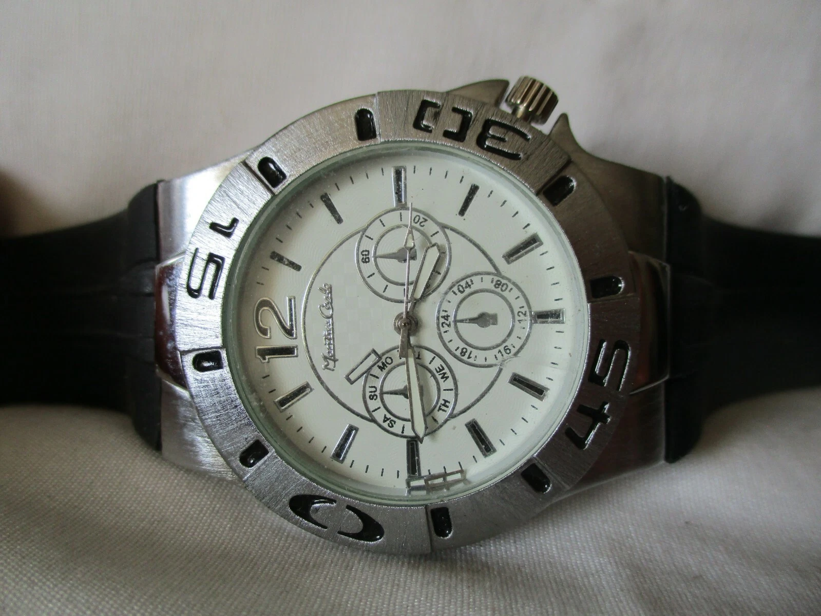Montres Carlo Watch Black Buckle Band Silver Toned Round White Face Simple Style
