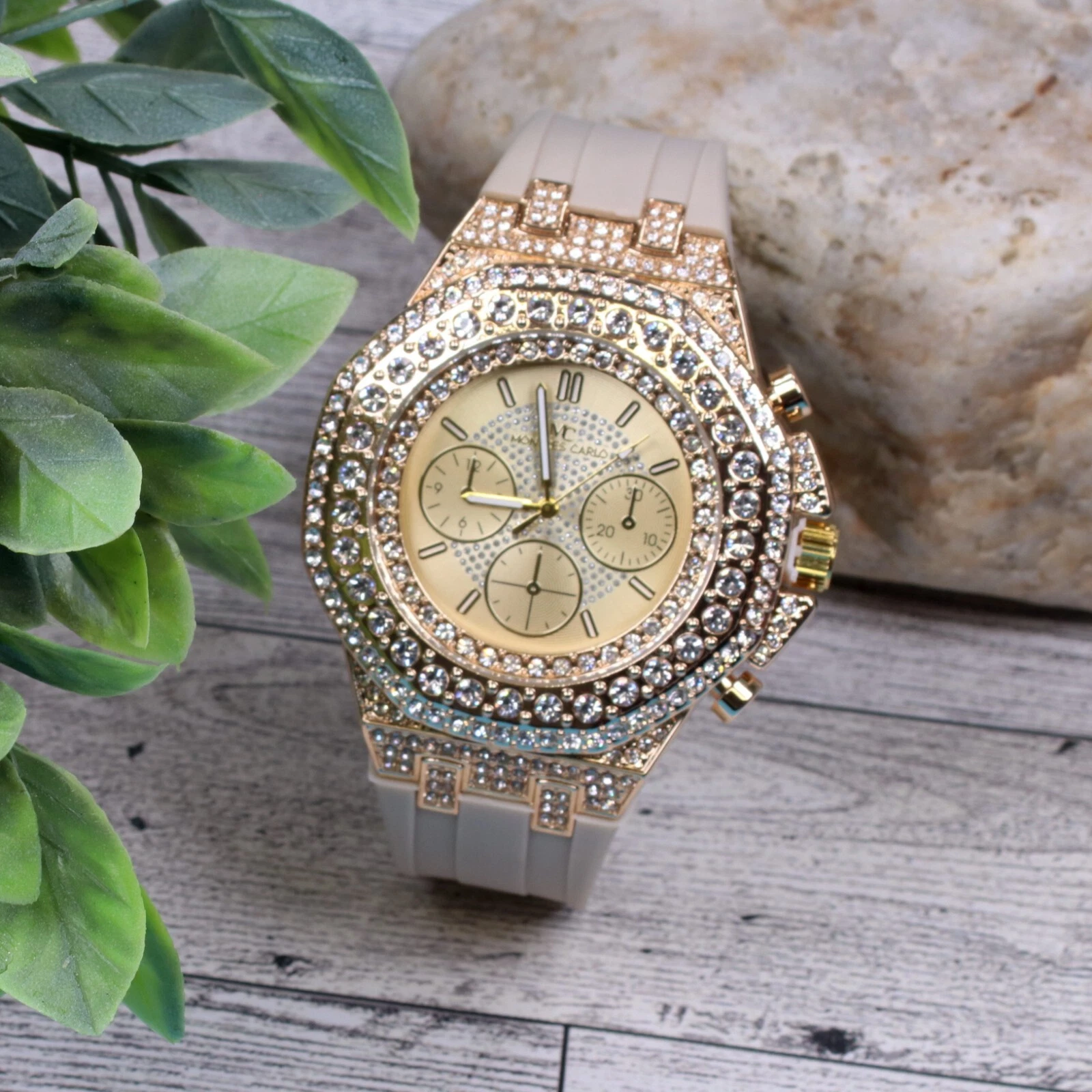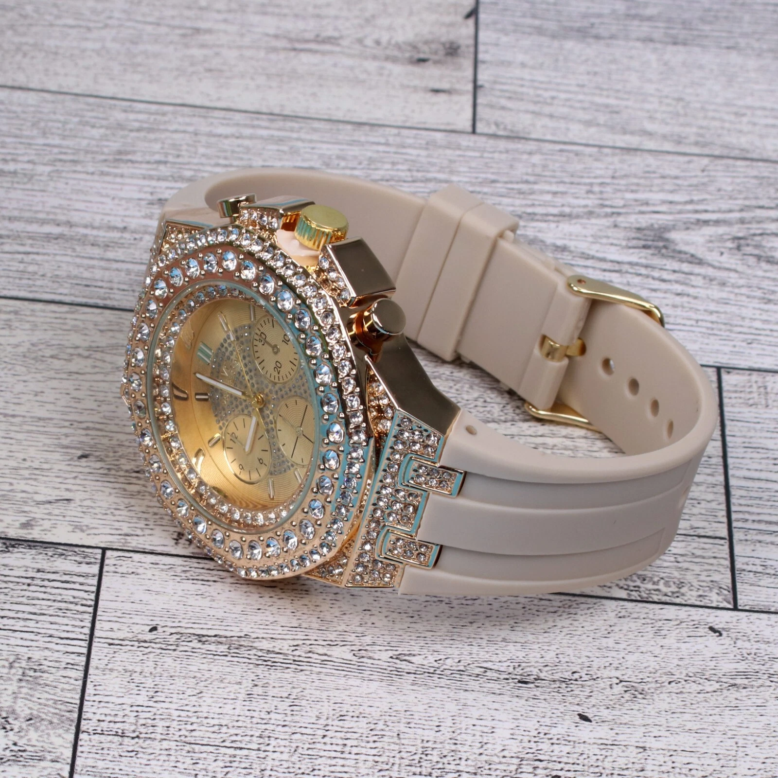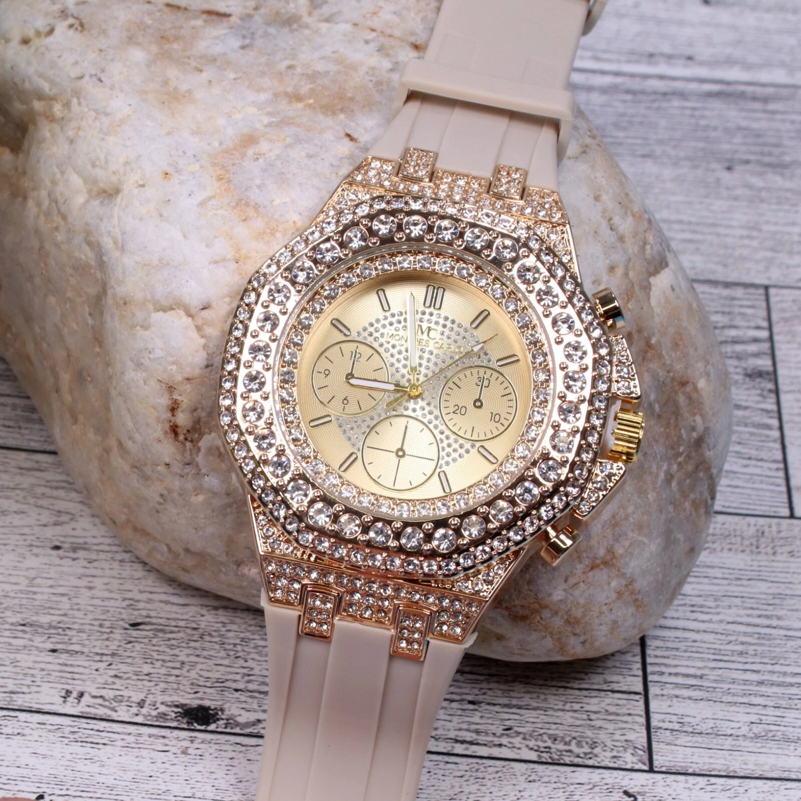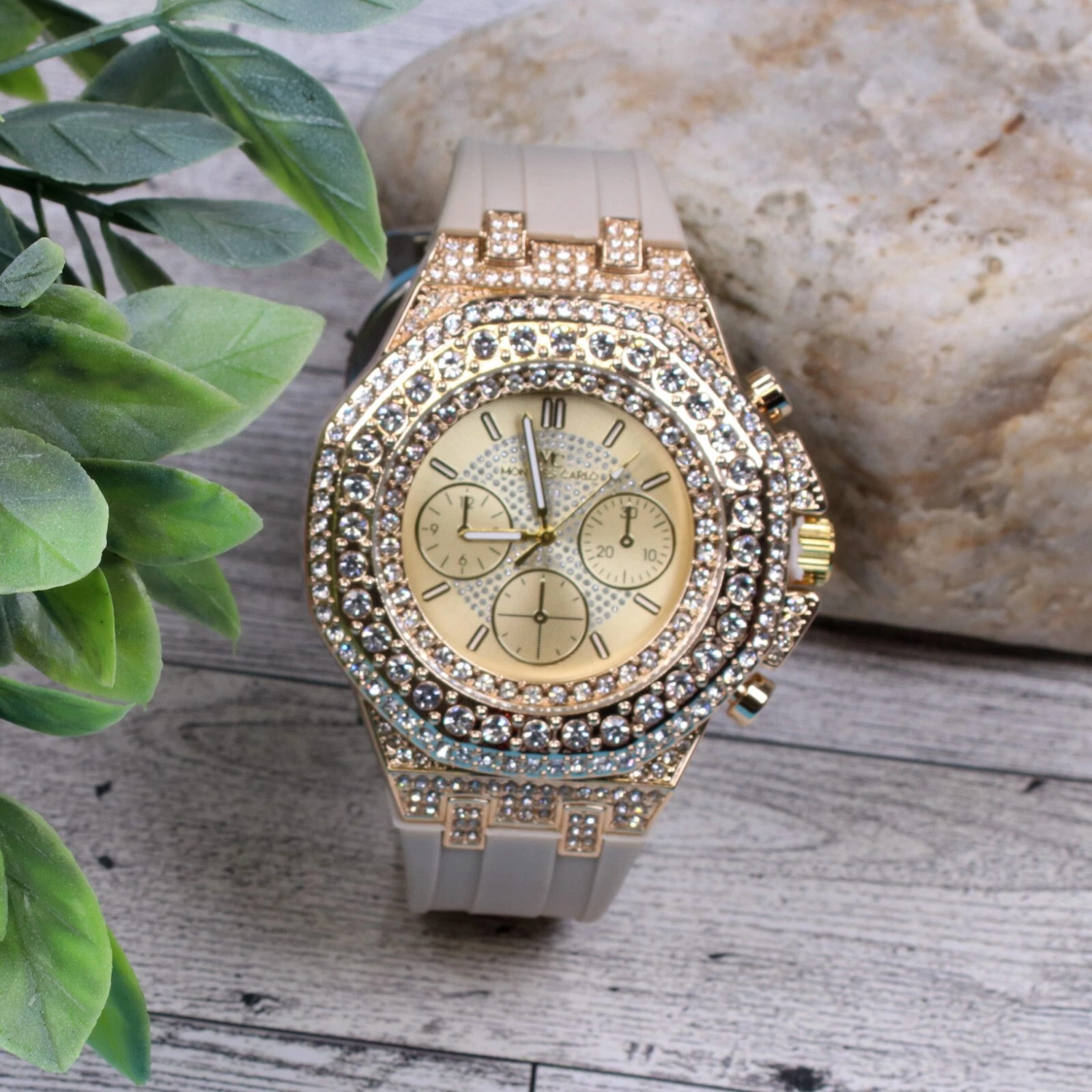 Montres Carlo Men's Hip Hop Rapper Luxury Stones Dress Wrist Watch Gold Finish