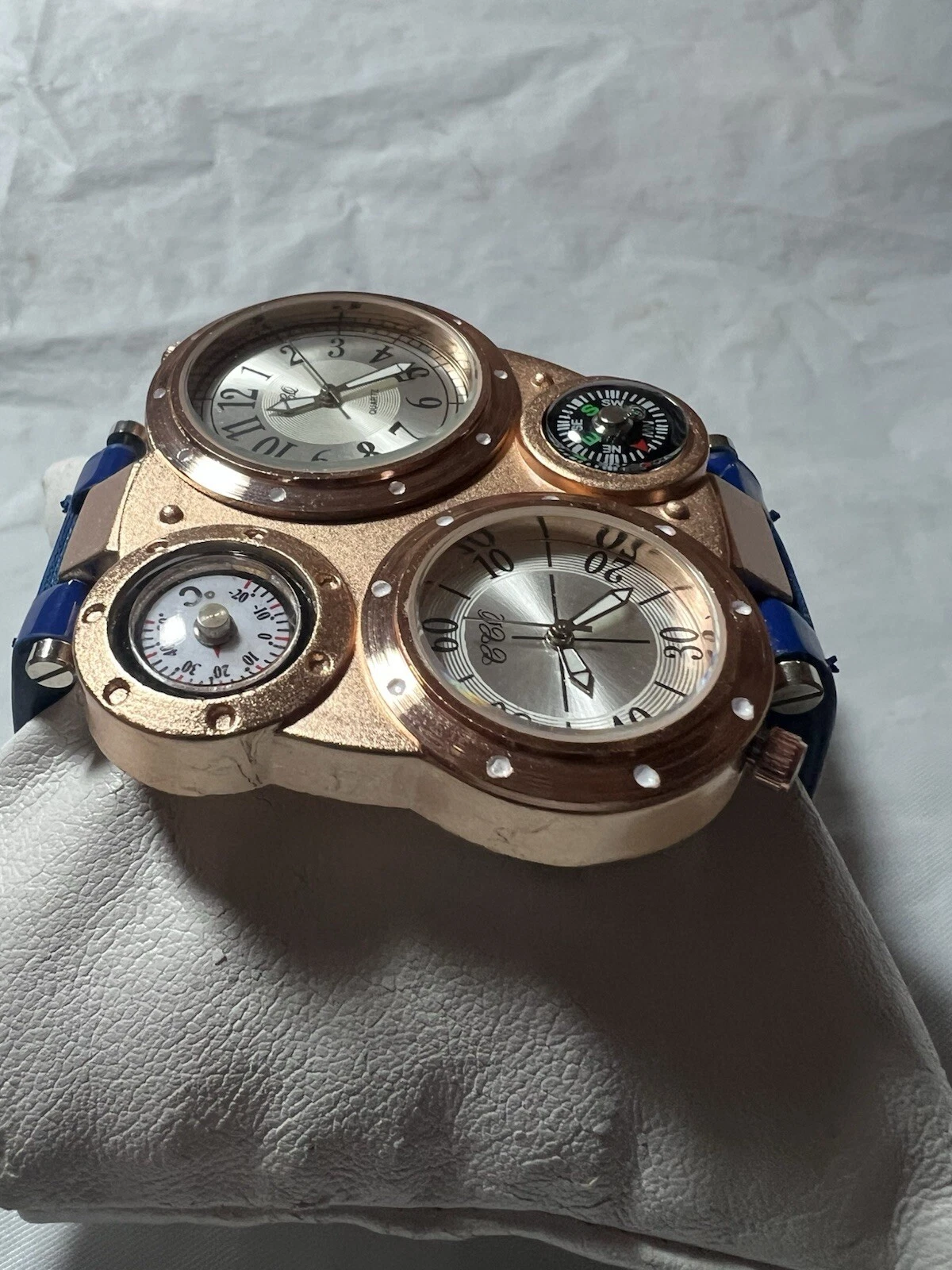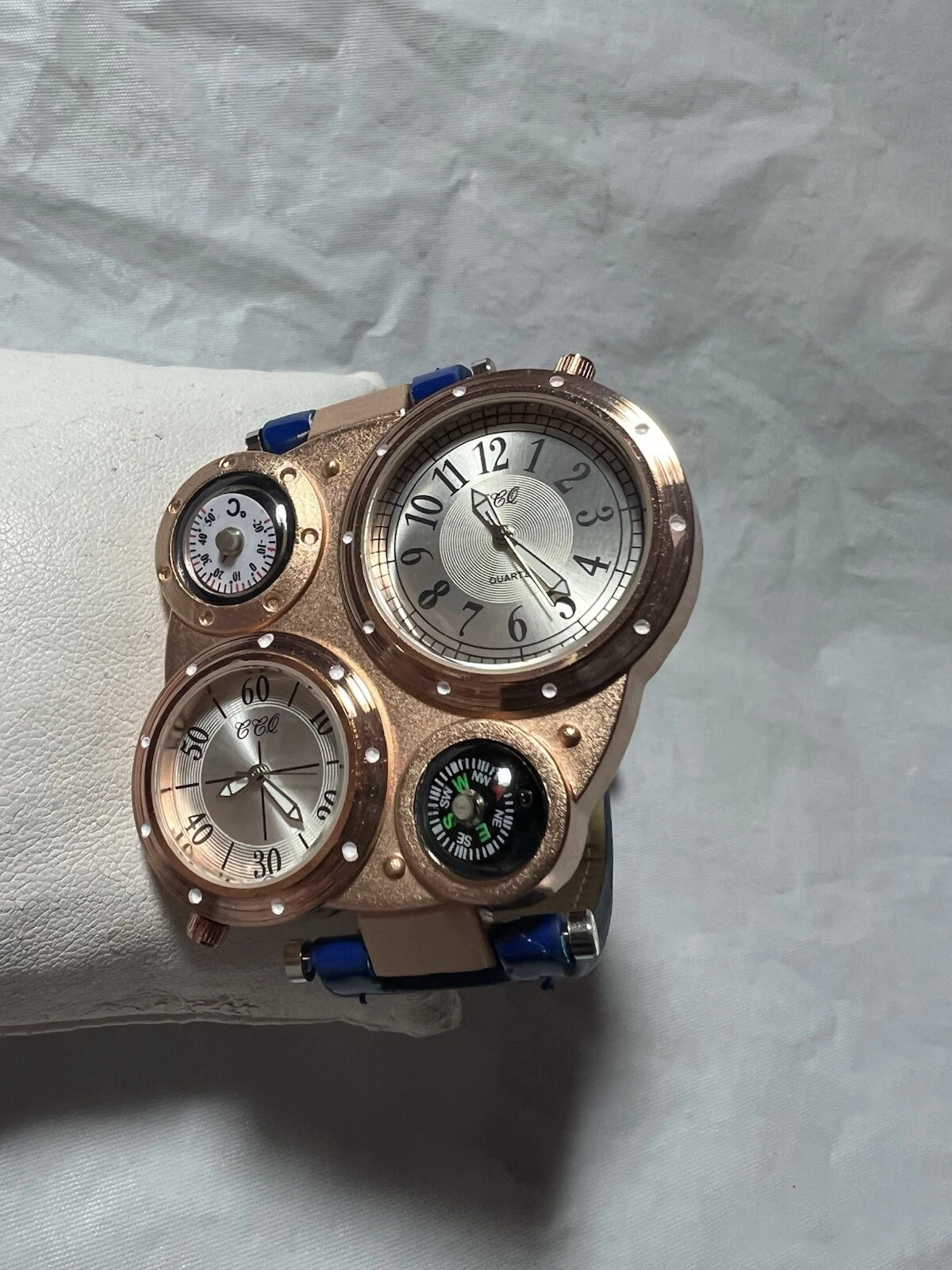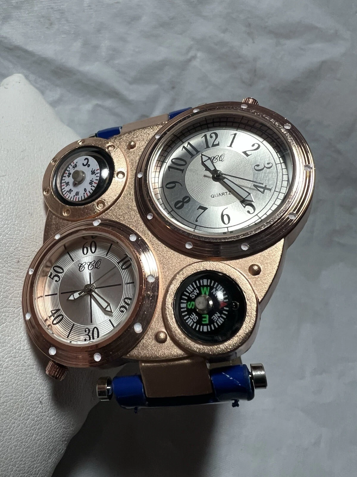 CCe,TWO Zone, more functions,rose Gold,NEW Battres, blue nylon band, men’s watch