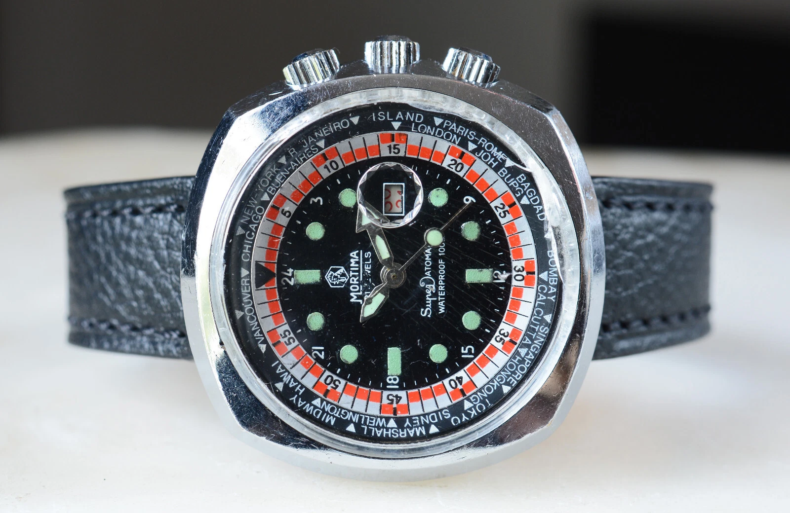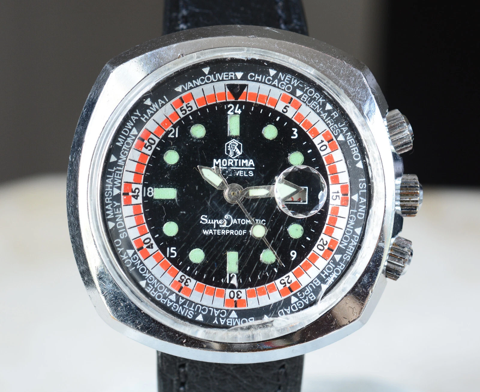 1960s MORTIMA 44mm MEN CHRONOGRAPH World Time GMT WRISTWATCH Manual Wind RUNS