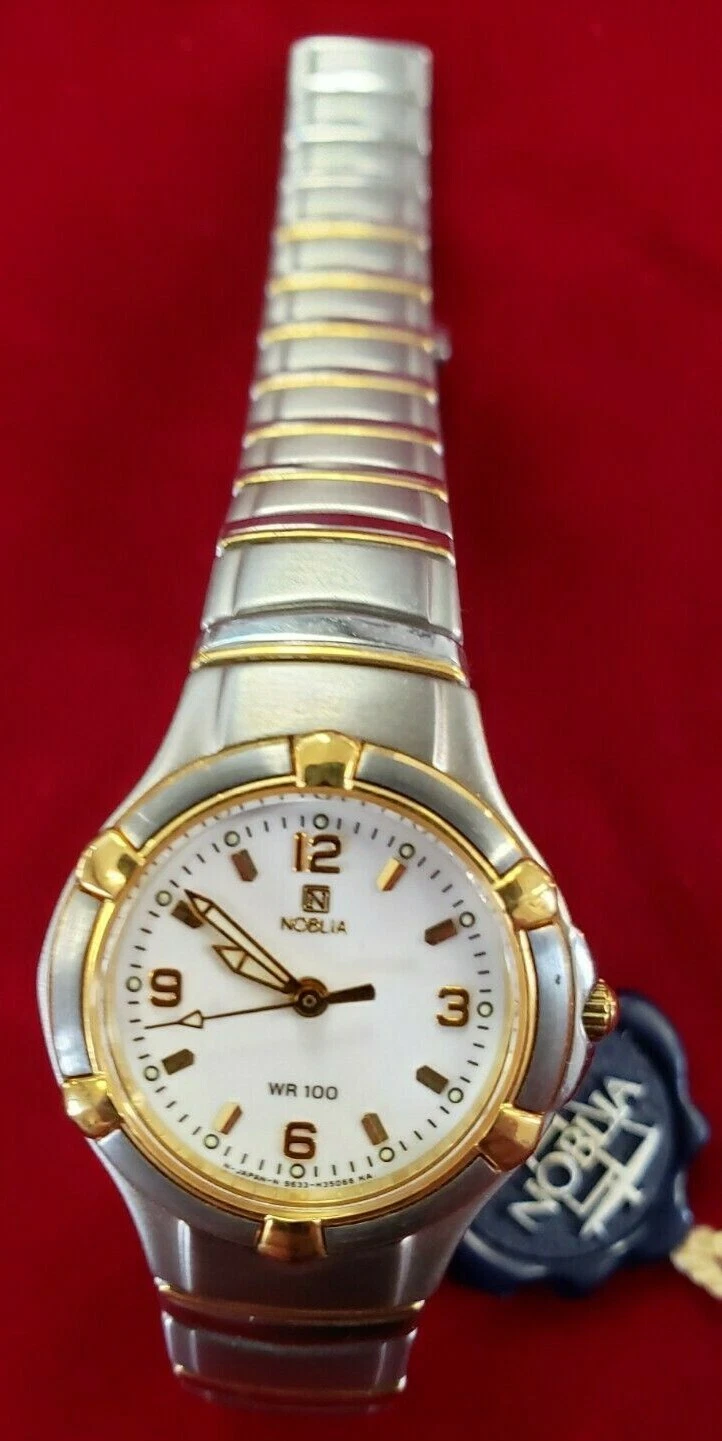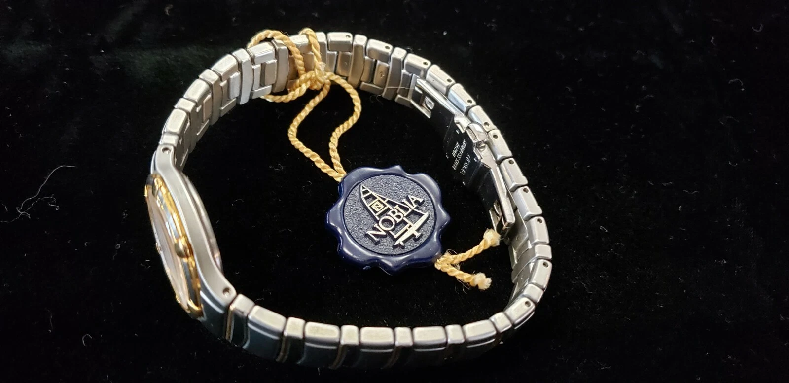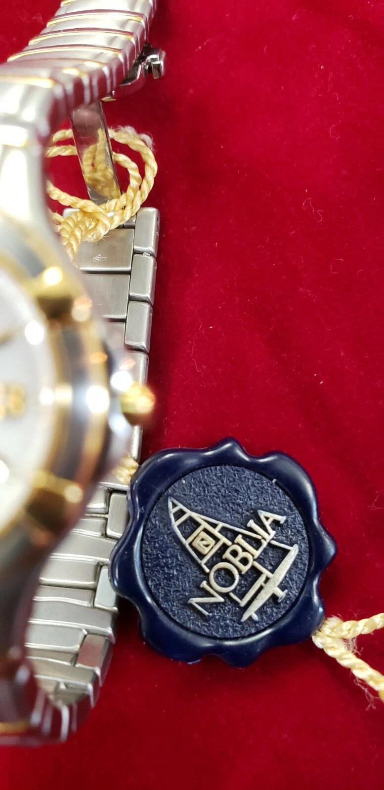 Noblia stainless steel gold and silver colored watch with box, tags, and booklet