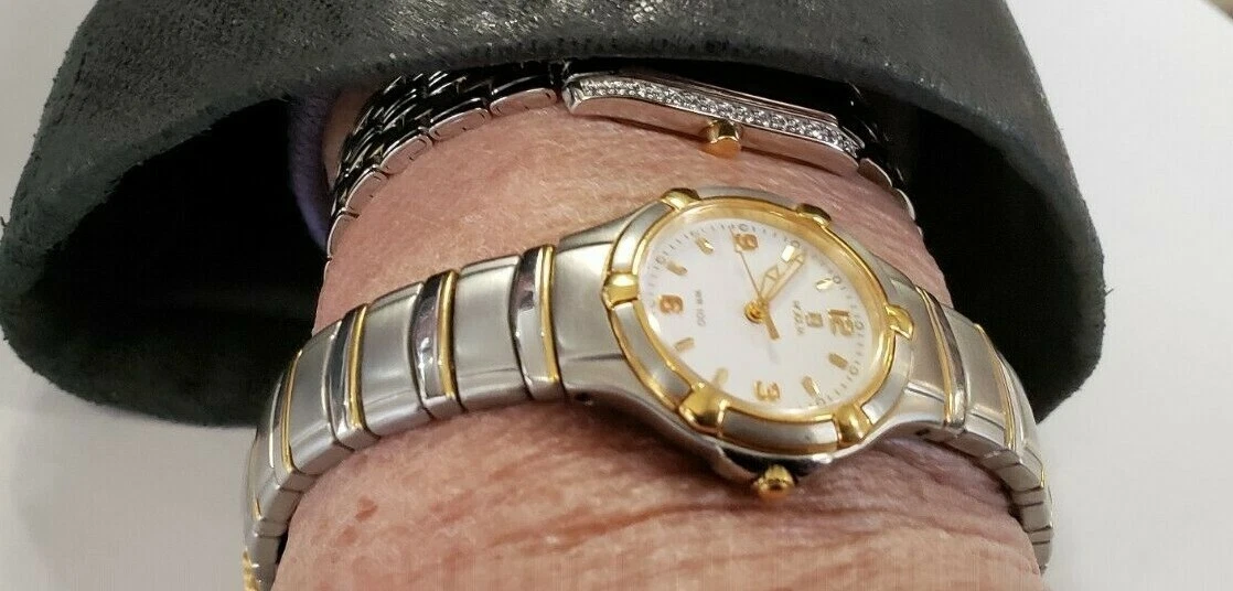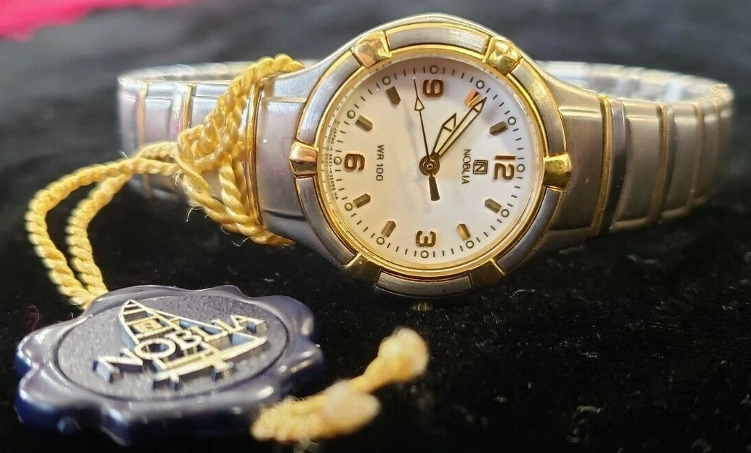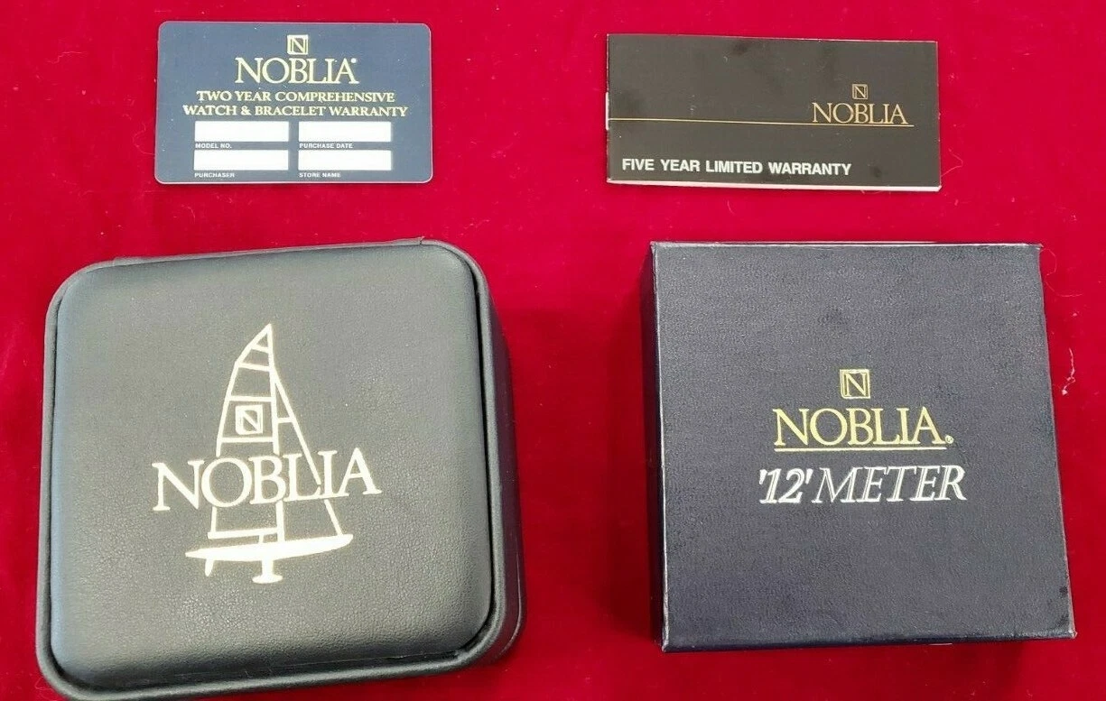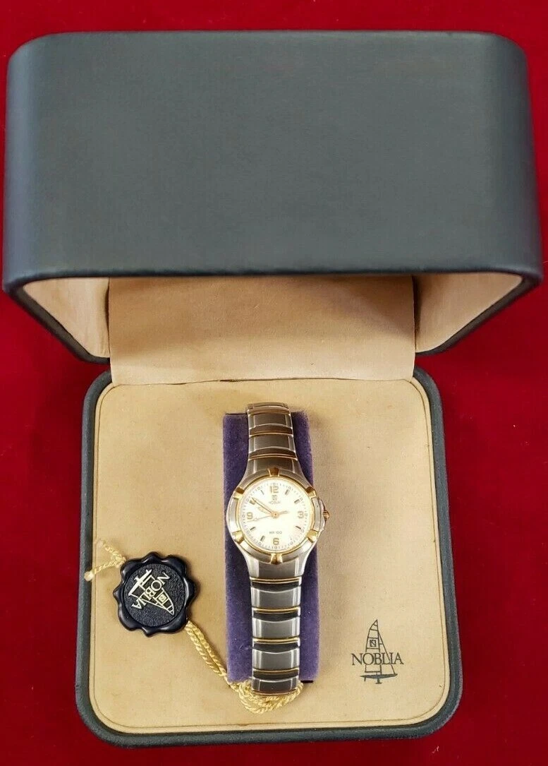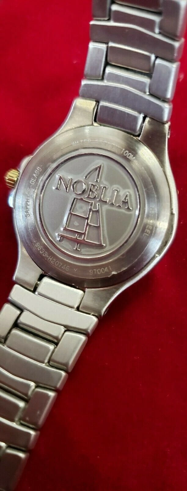 Noblia stainless steel gold and silver colored watch with box, tags, and booklet