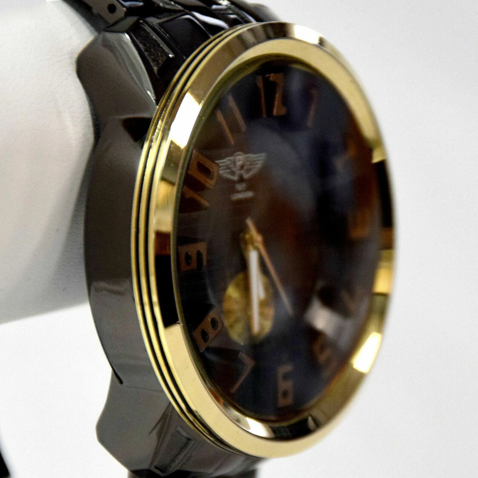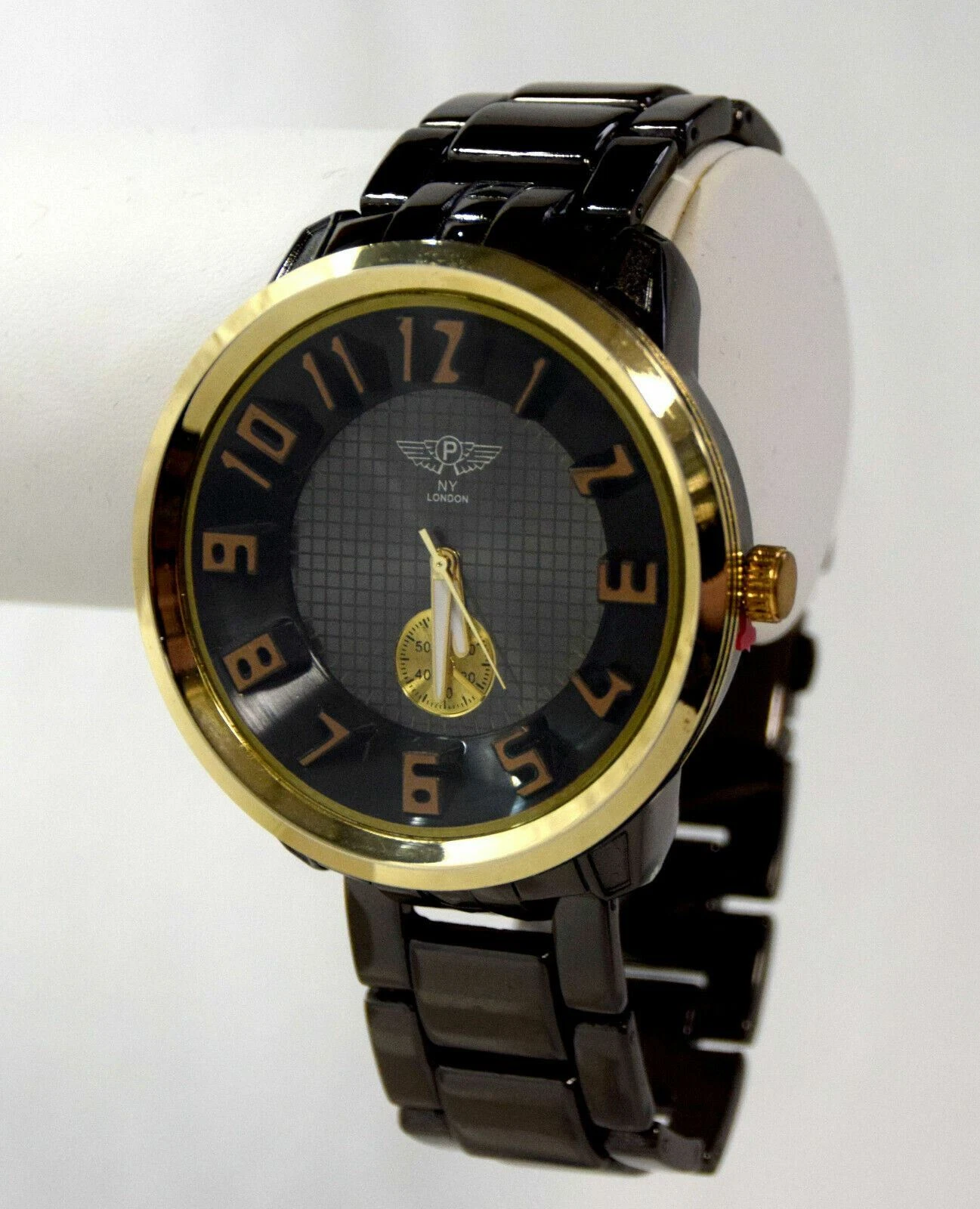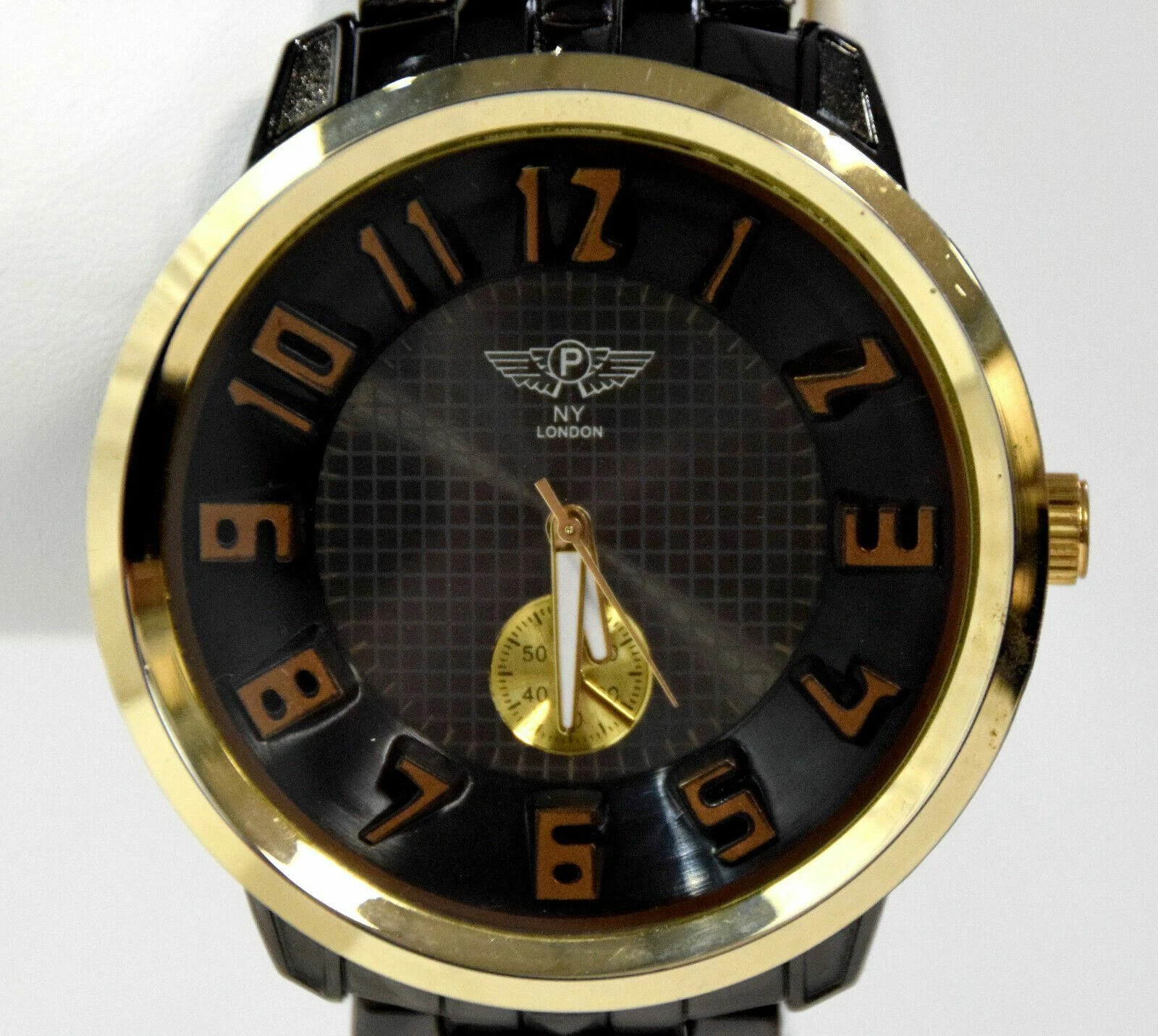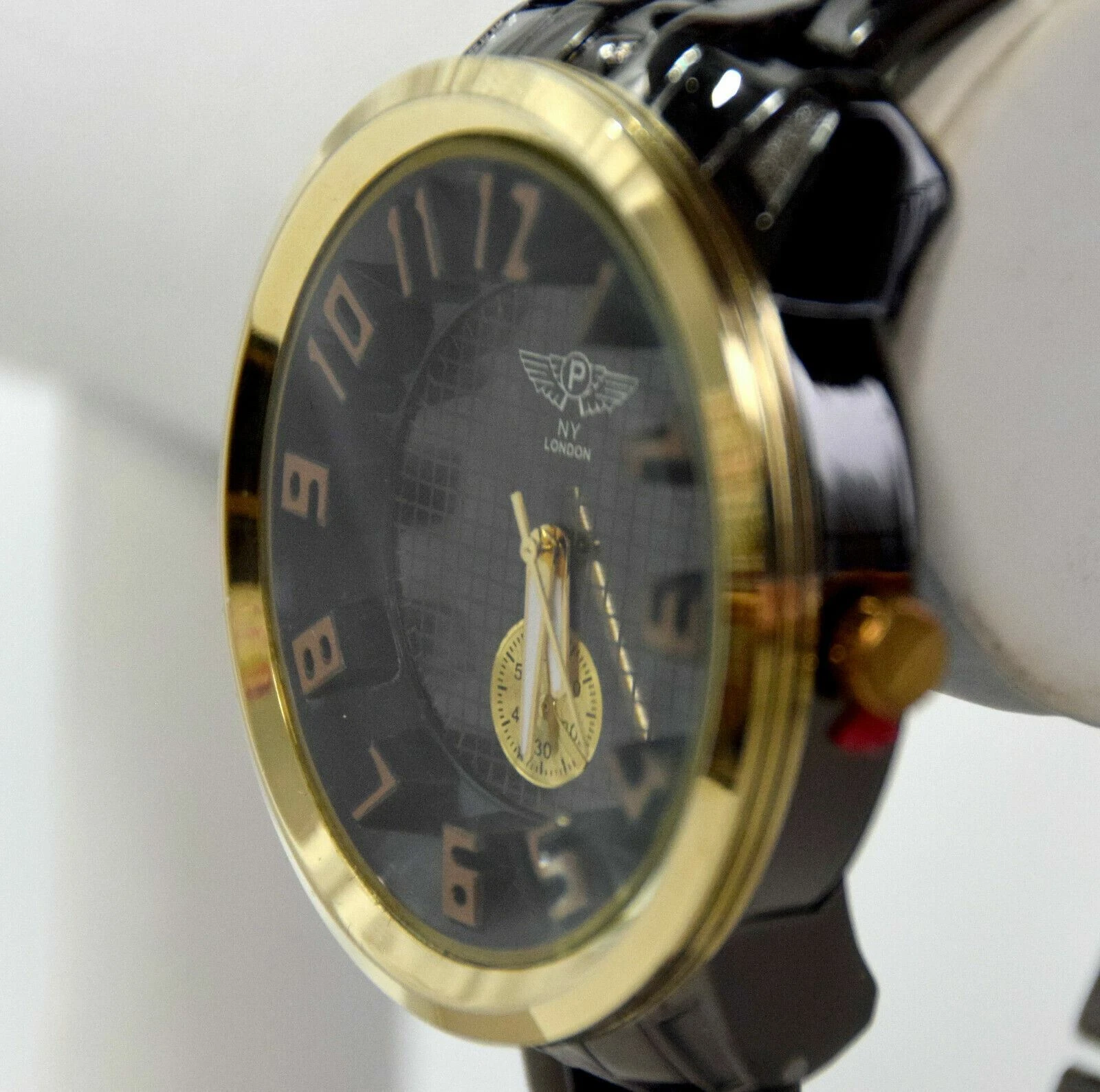 NEW NY London 2864 Men 3D Design Dial  Yellow Gold Numerals Black Bracelet Watch